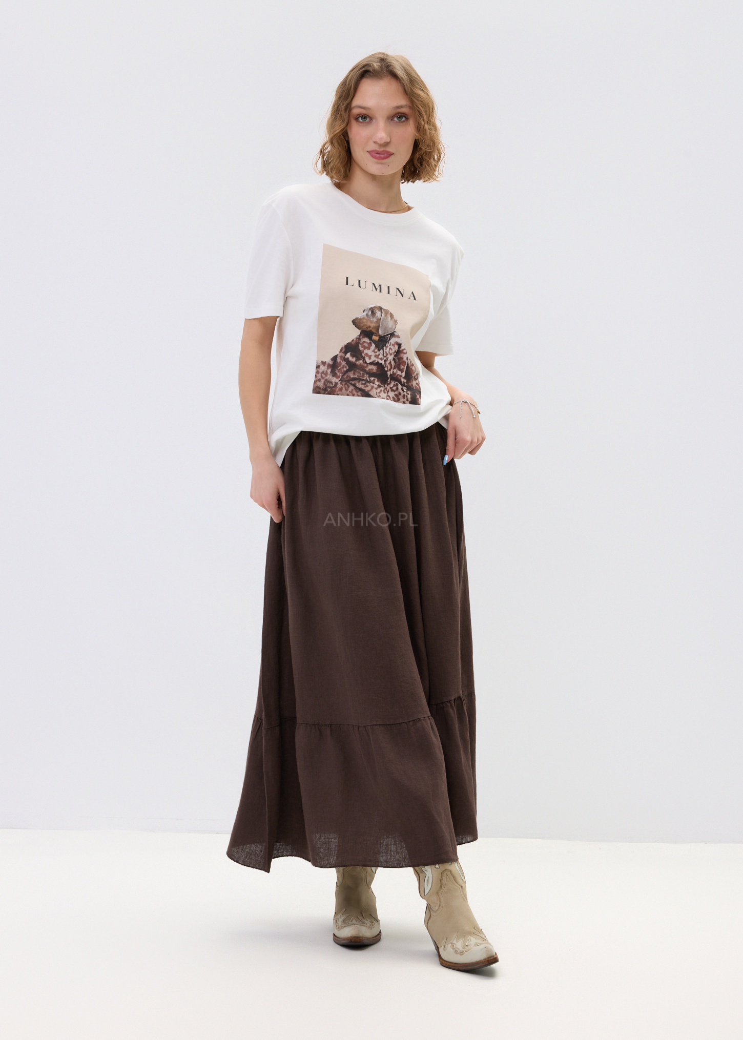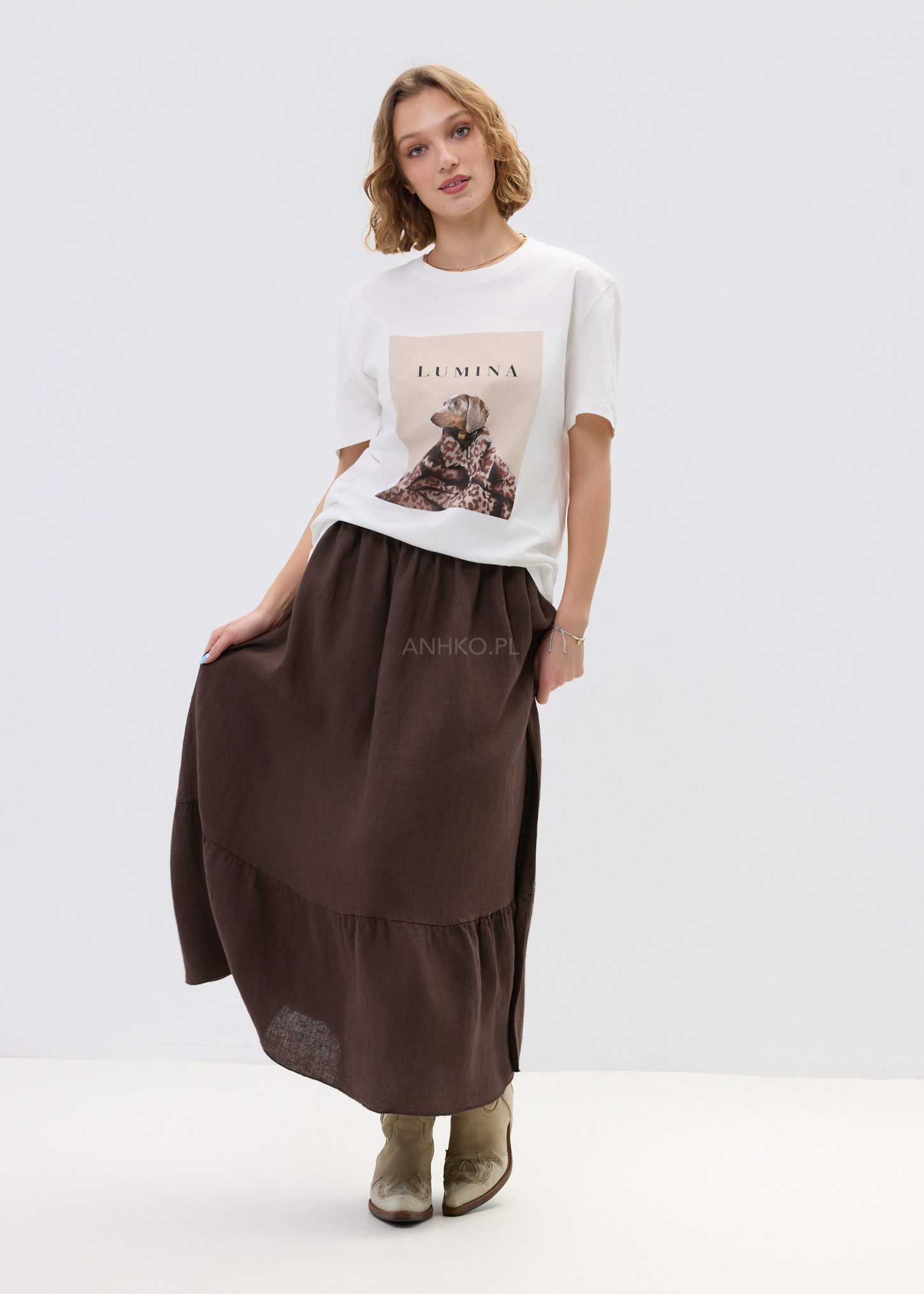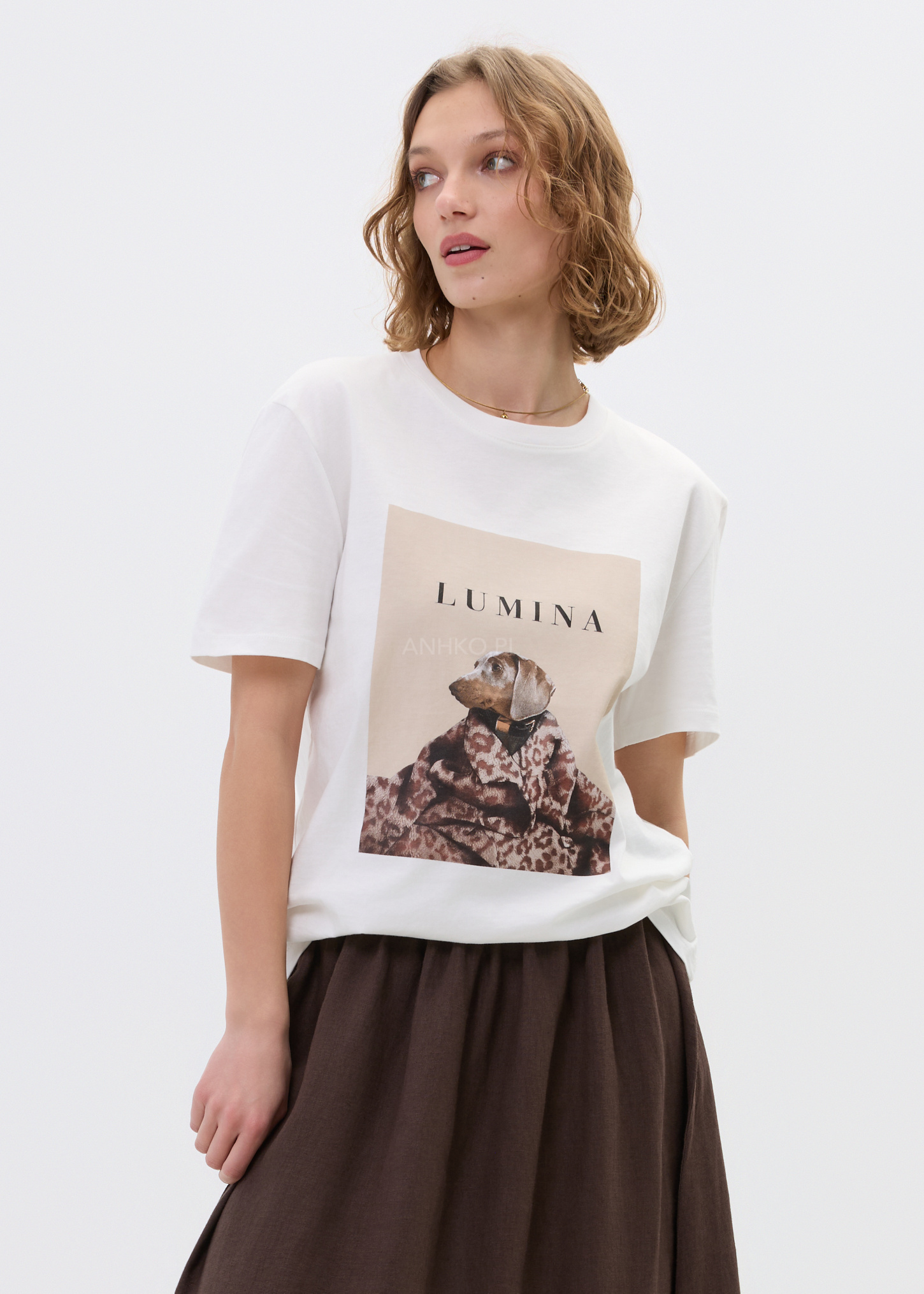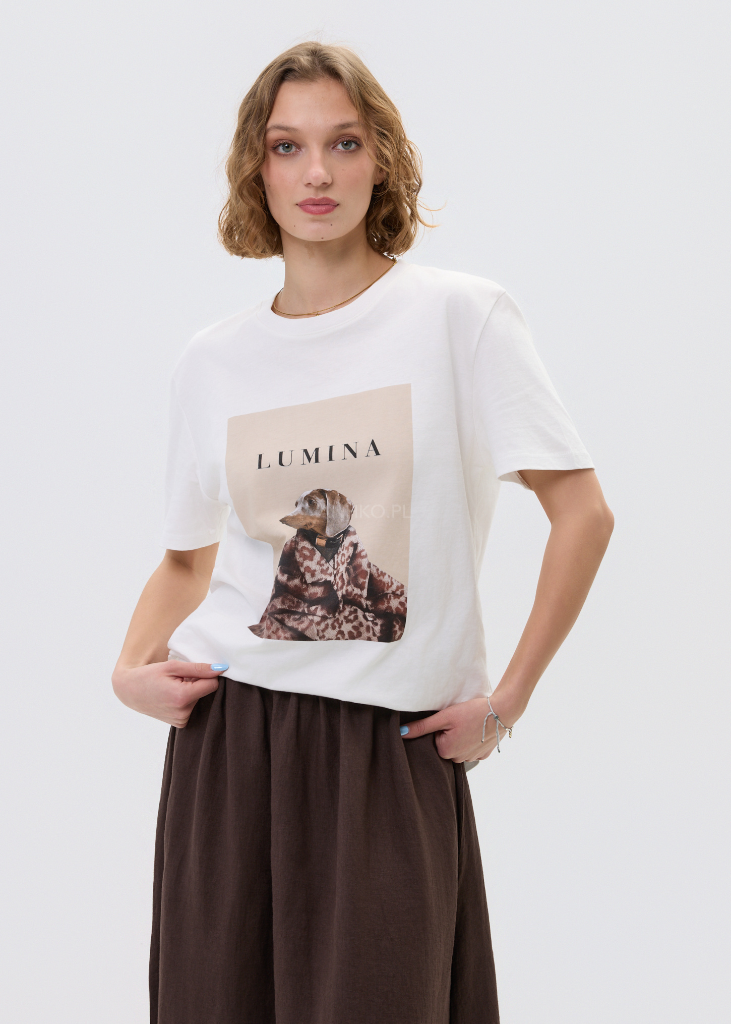 Bluzka Lumin Biała - Ta biała koszulka to idealny wybór dla osób, które cenią sobie klasyczny wygląd połączony z oryginalnym akcentem. Wykonana z wysokiej jakości materiałów, jest wyjątkowo miękka i wygodna w noszeniu, a jednocześnie trwała. Koszulka ozdobiona jest wyjątkowym nadrukiem z wizerunkiem psa otulonego wzorzystym materiałem, który nadaje jej artystycznego charakteru. Dzięki prostemu krojowi i uniwersalnej bieli, koszulka doskonale sprawdzi się w codziennych stylizacjach, dodając im nieco unikalnego stylu.