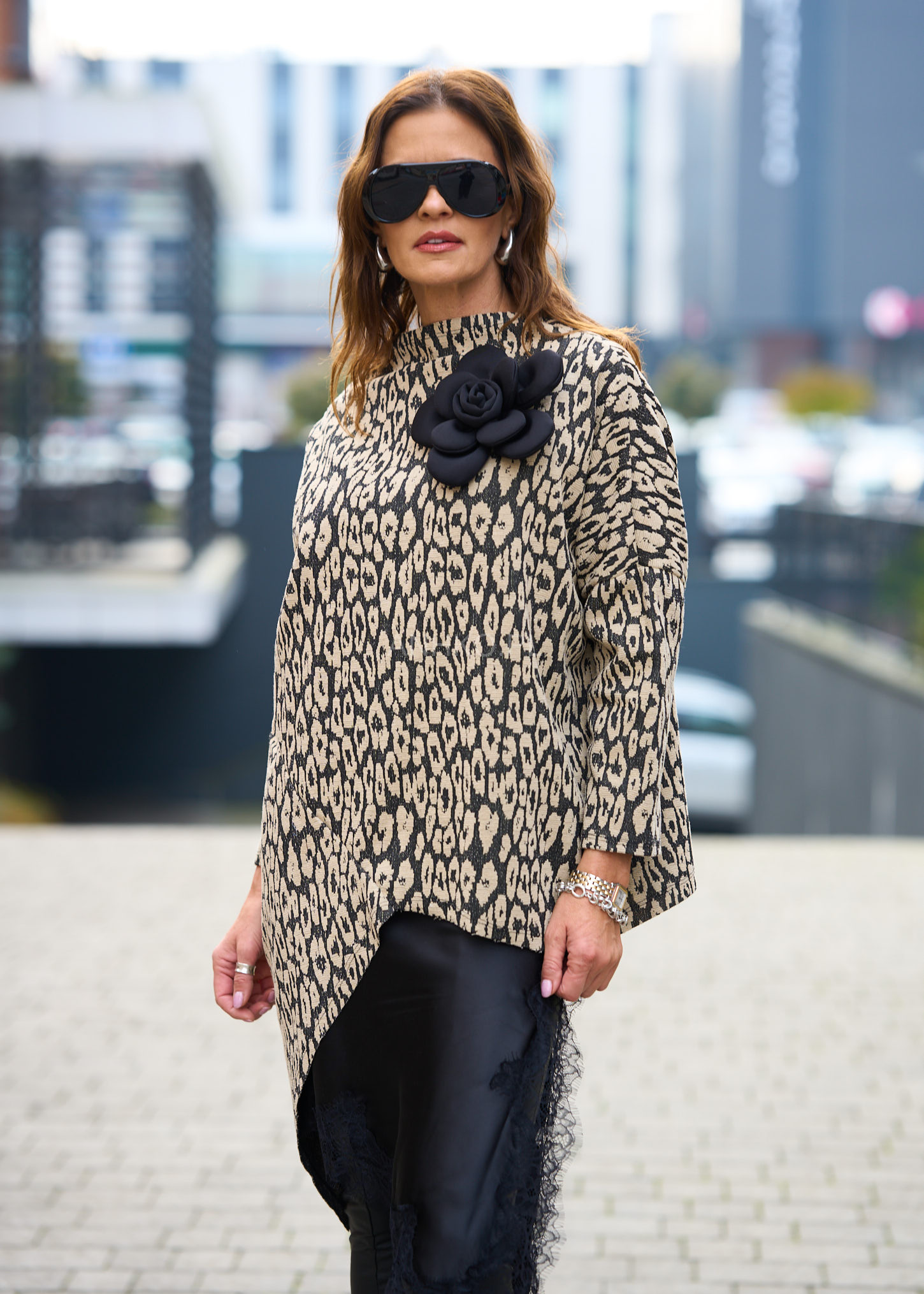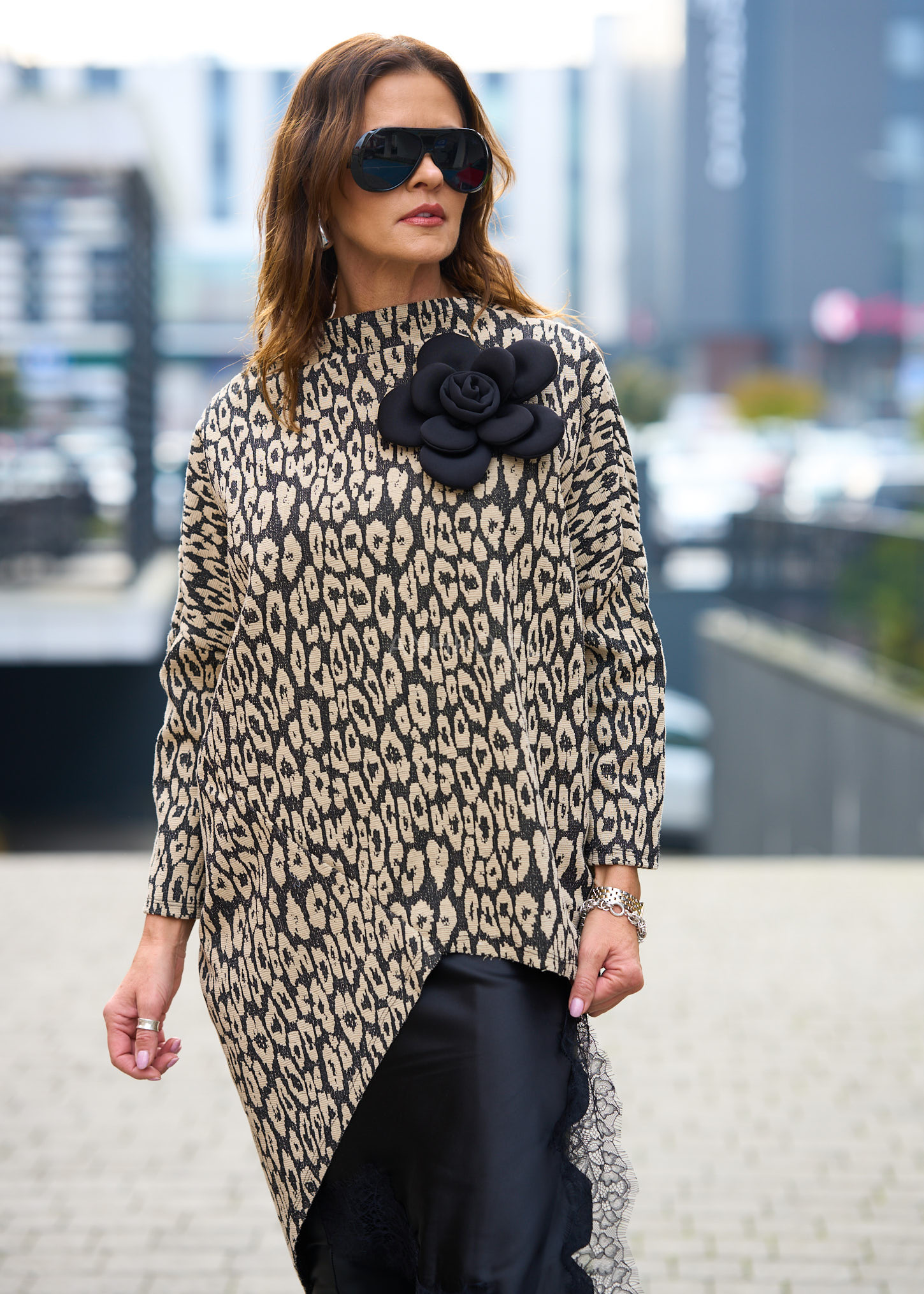 Przedstawiamy oryginalną czarno-kremową bluzkę z unikalnym zwierzęcy, wzorem leoparda , który zachwyci każdą miłośniczkę wyrazistej mody. Wykonany z wysokiej jakości mieszanki materiałów, sweter łączy w sobie elegancję z komfortem noszenia. Nowoczesny design z kontrastującymi paskami w czerni i kremu przyciąga wzrok i dodaje stylu każdej stylizacji. Ten asymetryczny model świetnie sprawdzi się w codziennych i casualowych zestawach, gwarantując wygodę dzięki elastycznemu krojowi i oddychającej tkaninie.