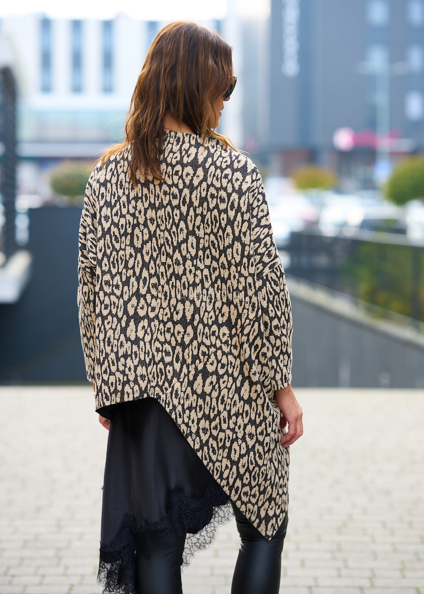 - Asymetryczny, luźny krój zapewniający swobodę ruchów