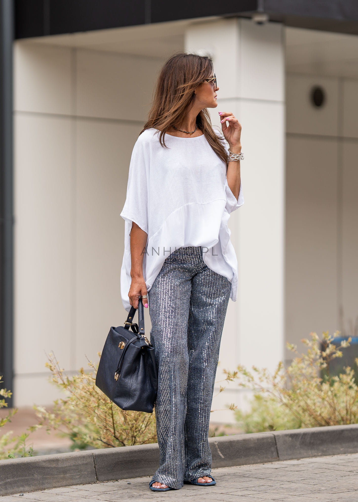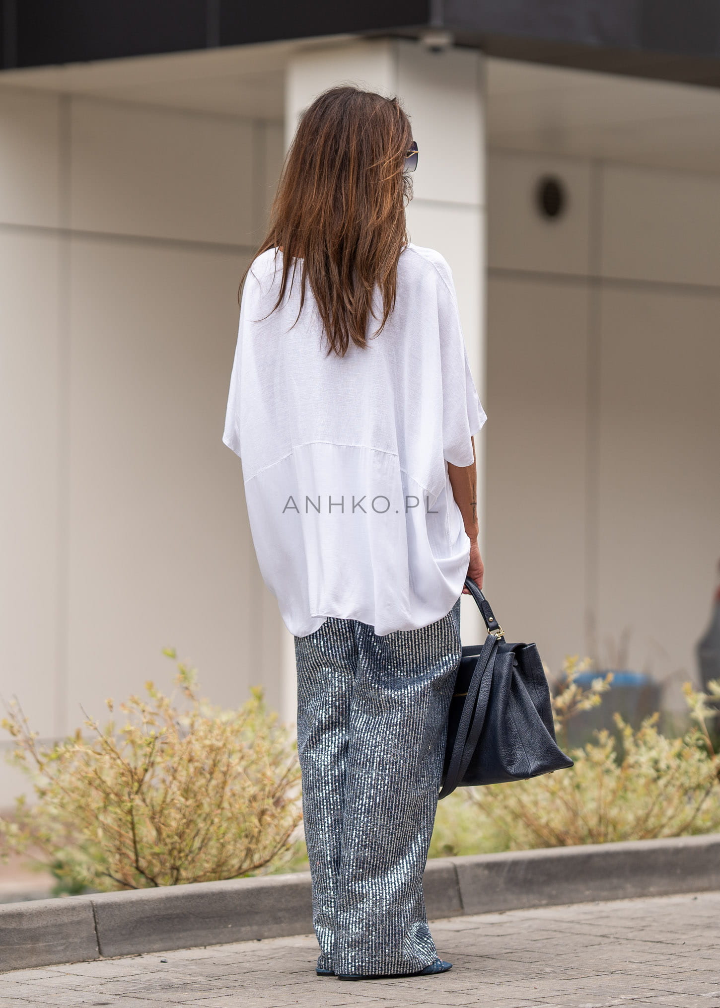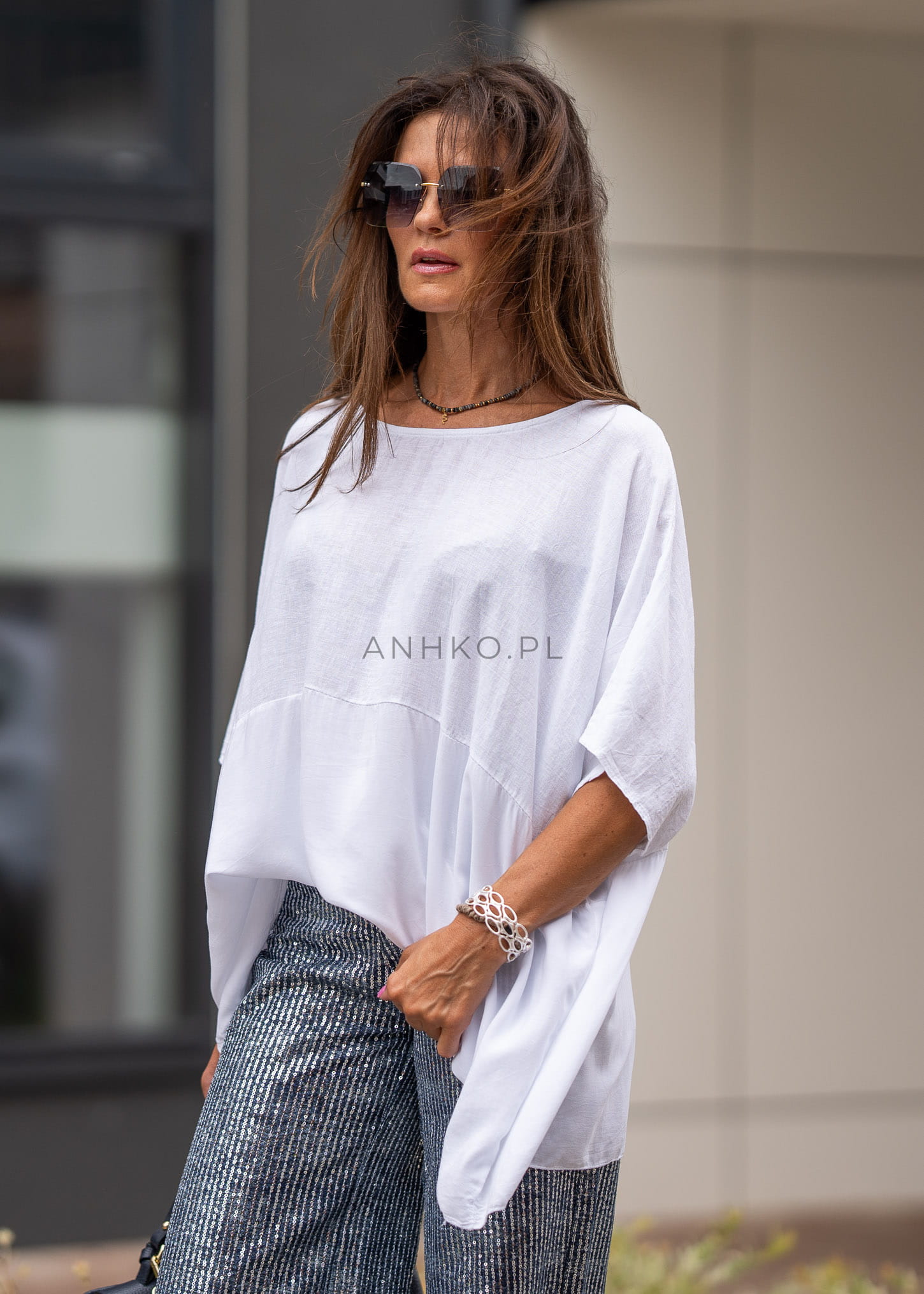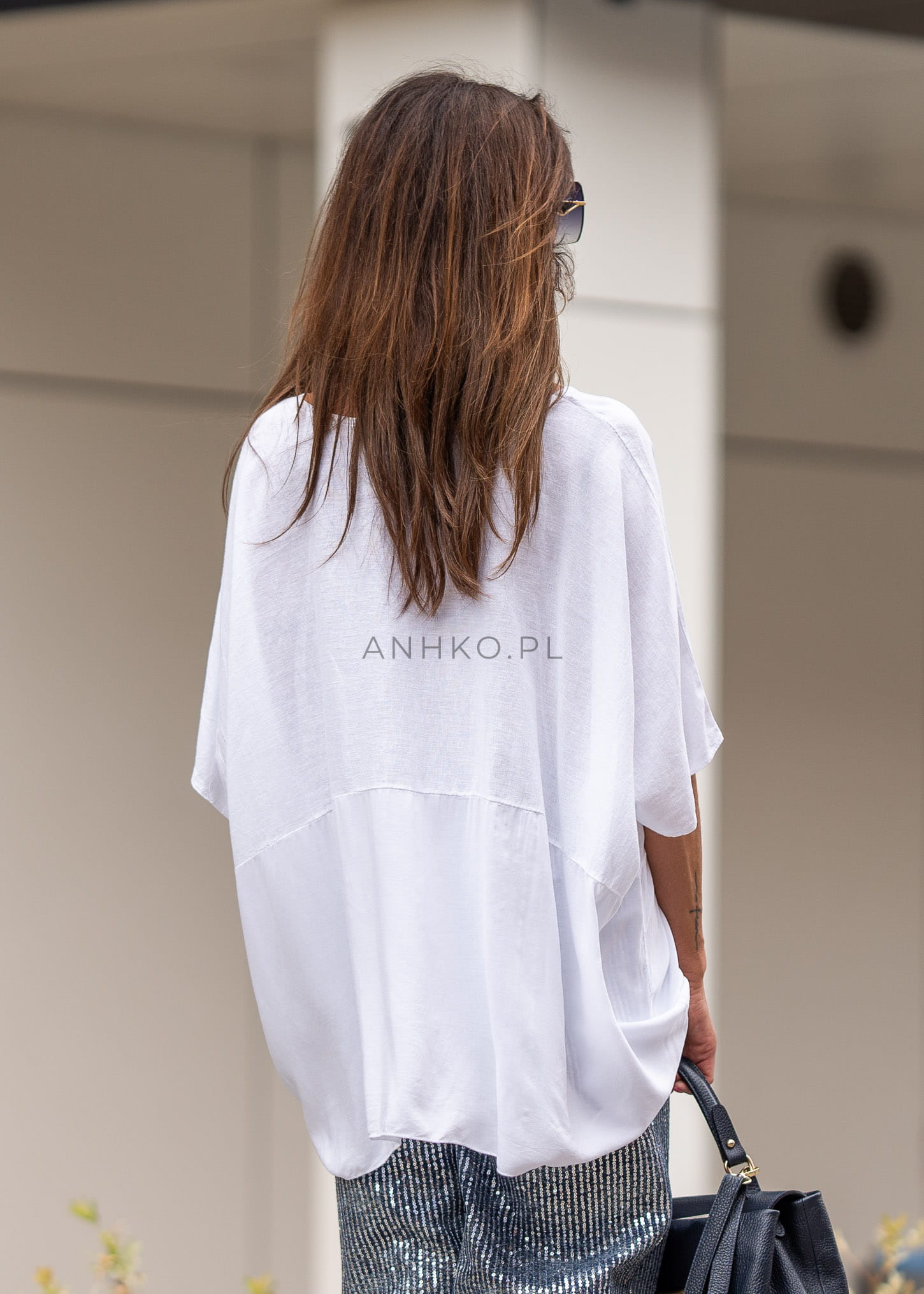 Ta bluzka lniana o oversize’owym kroju miękko opływa sylwetkę, tworząc lekki i nowoczesny efekt. Szeroki fason, krótki rękaw i dłuższy tył sprawiają, że model prezentuje się bardzo swobodnie, a jednocześnie stylowo. Biały kolor pięknie rozświetla stylizację i daje szerokie możliwości łączenia z gładkimi oraz bardziej wyrazistymi dołami.