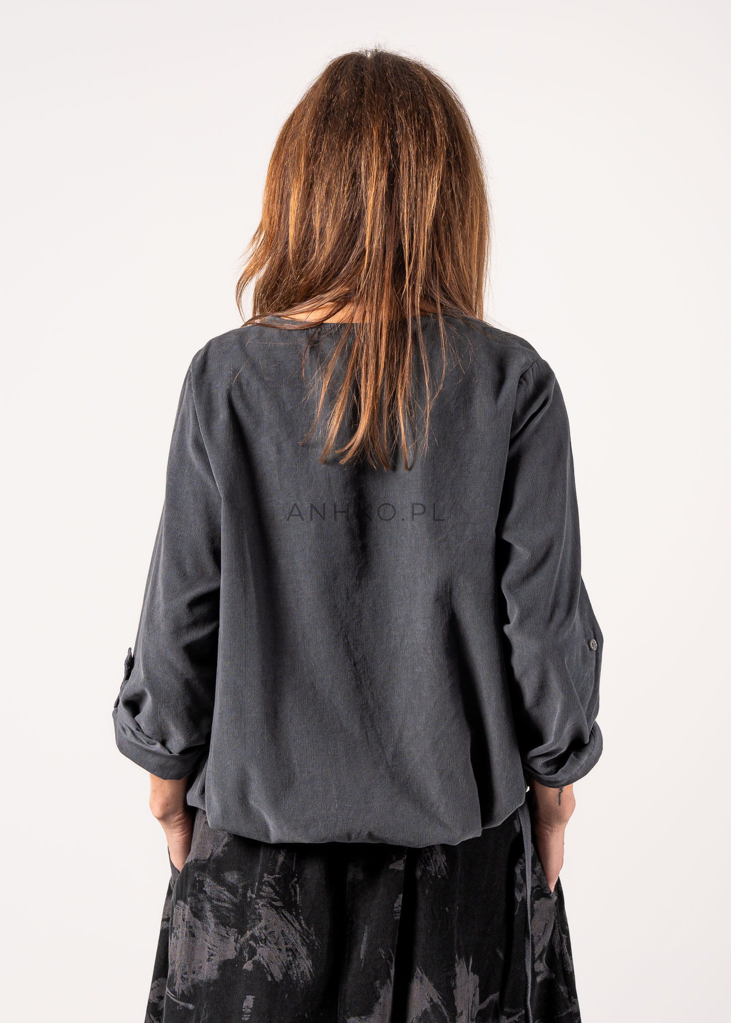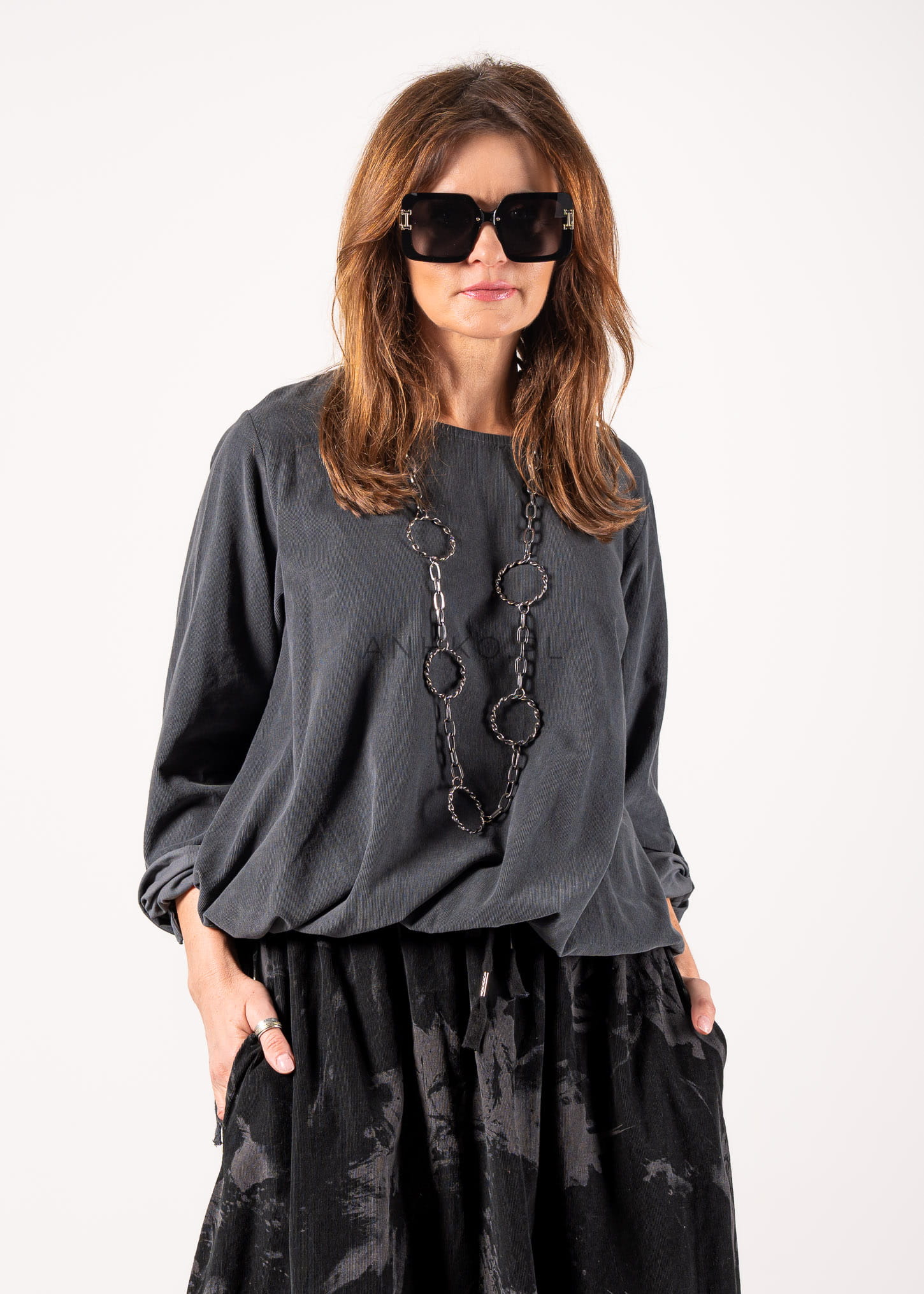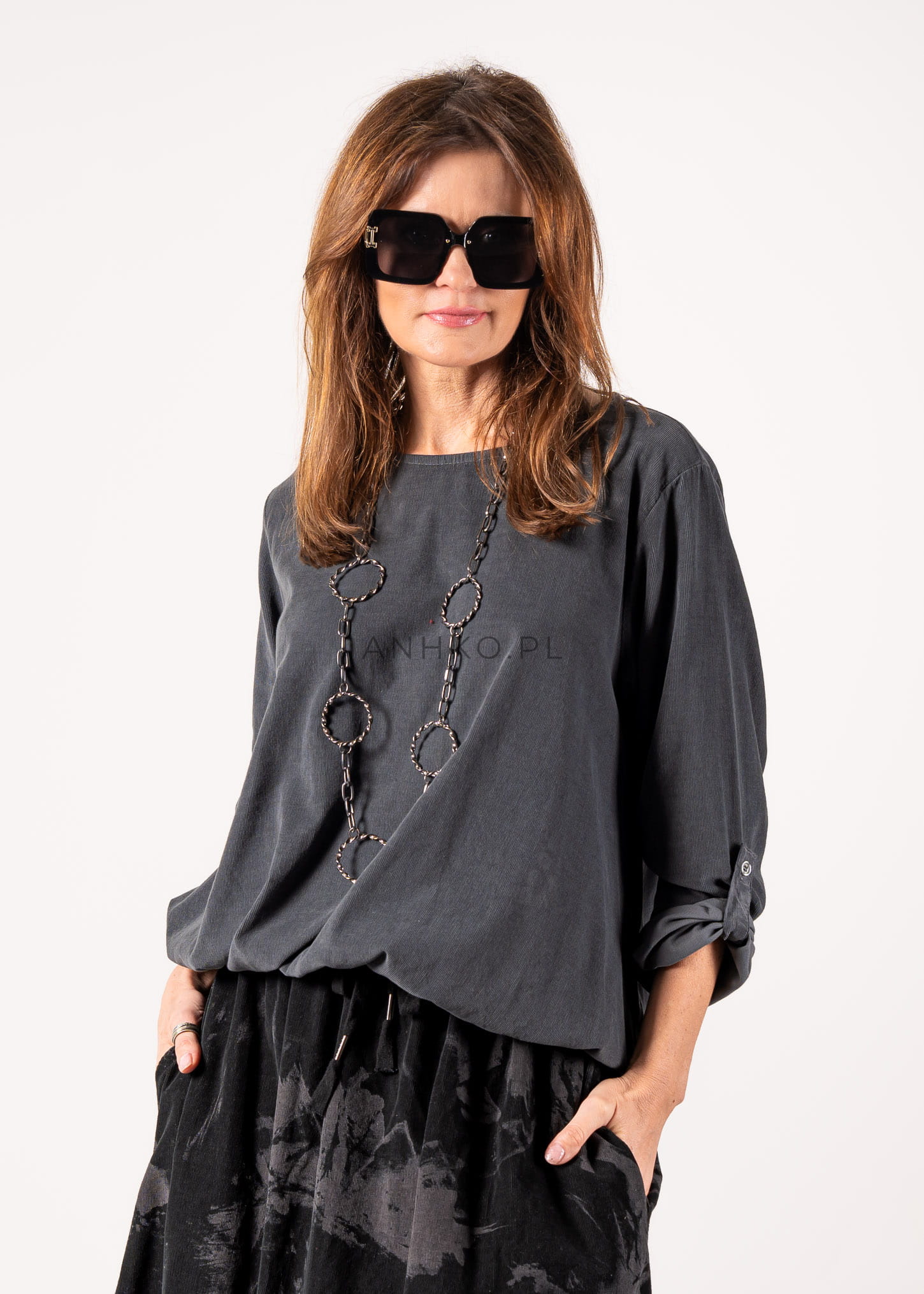 Ta bluzka oversize o luźnym kroju miękko opływa sylwetkę, tworząc efekt niewymuszonej elegancji i komfortu. Subtelnie wydłużona linia oraz delikatne marszczenie u dołu sprawiają, że model świetnie układa się zarówno wpuszczony w spódnicę, jak i noszony swobodnie. Stonowany odcień szarości podkreśla minimalistyczny charakter, a okrągły dekolt nadaje całości ponadczasowej prostoty.