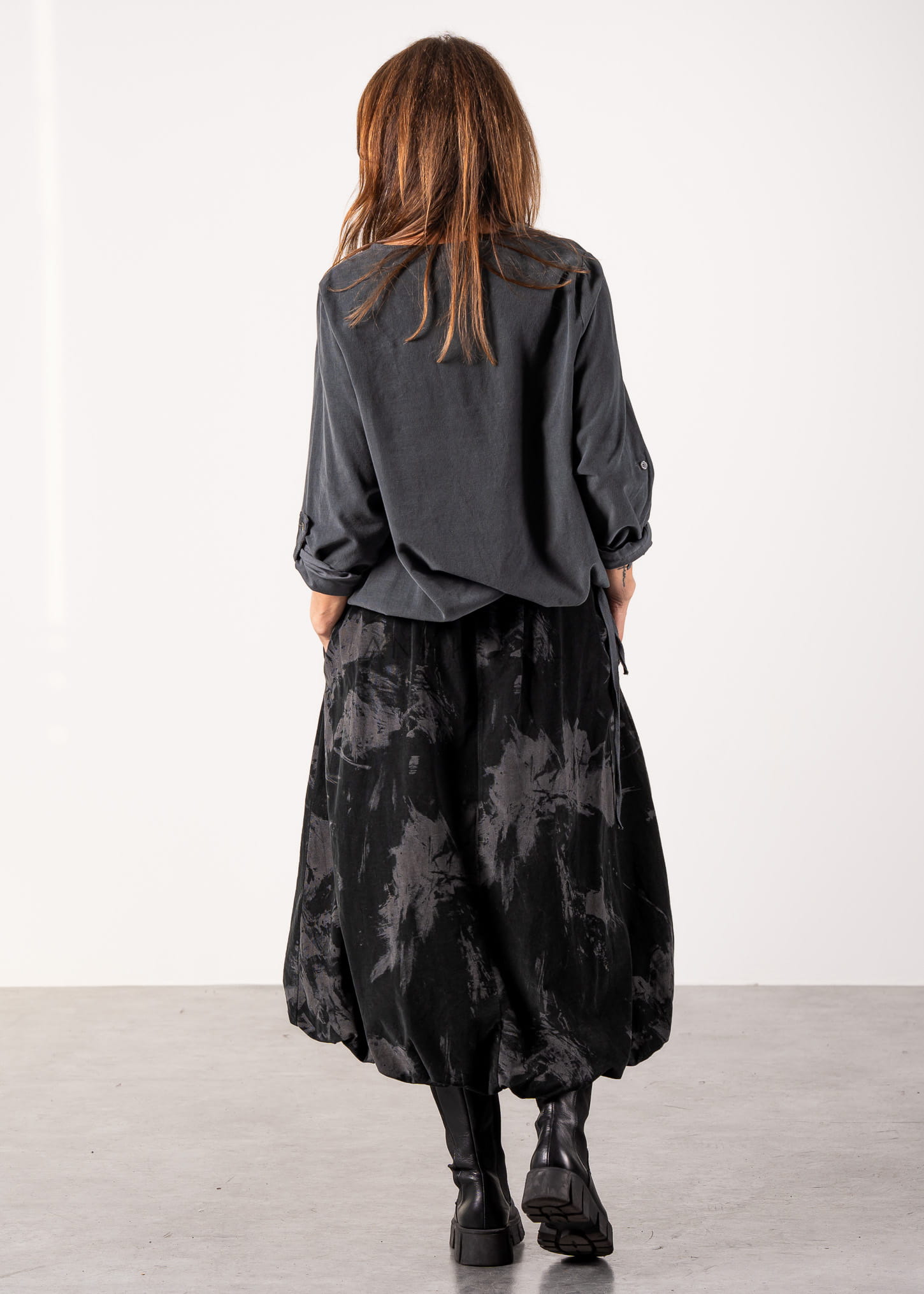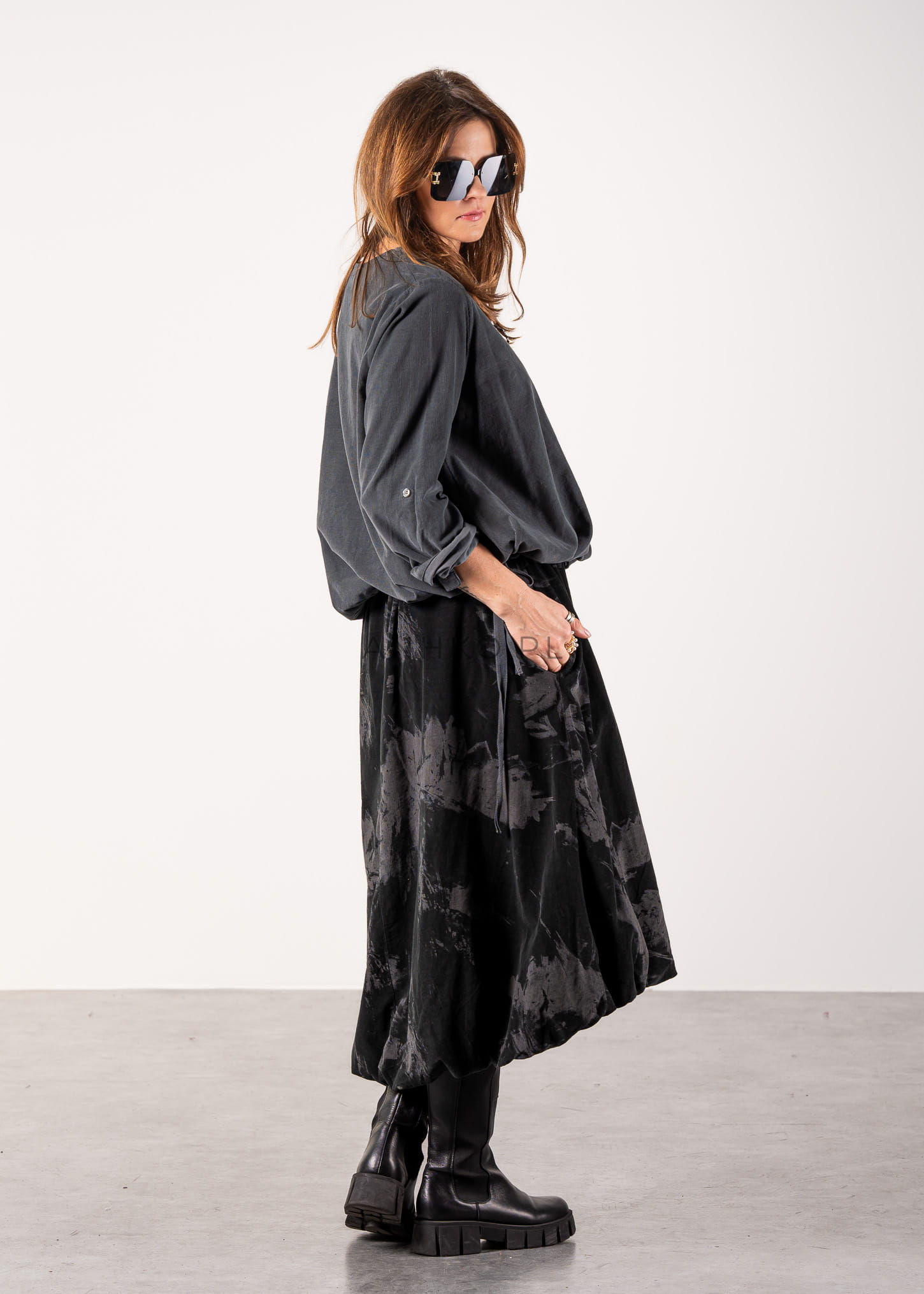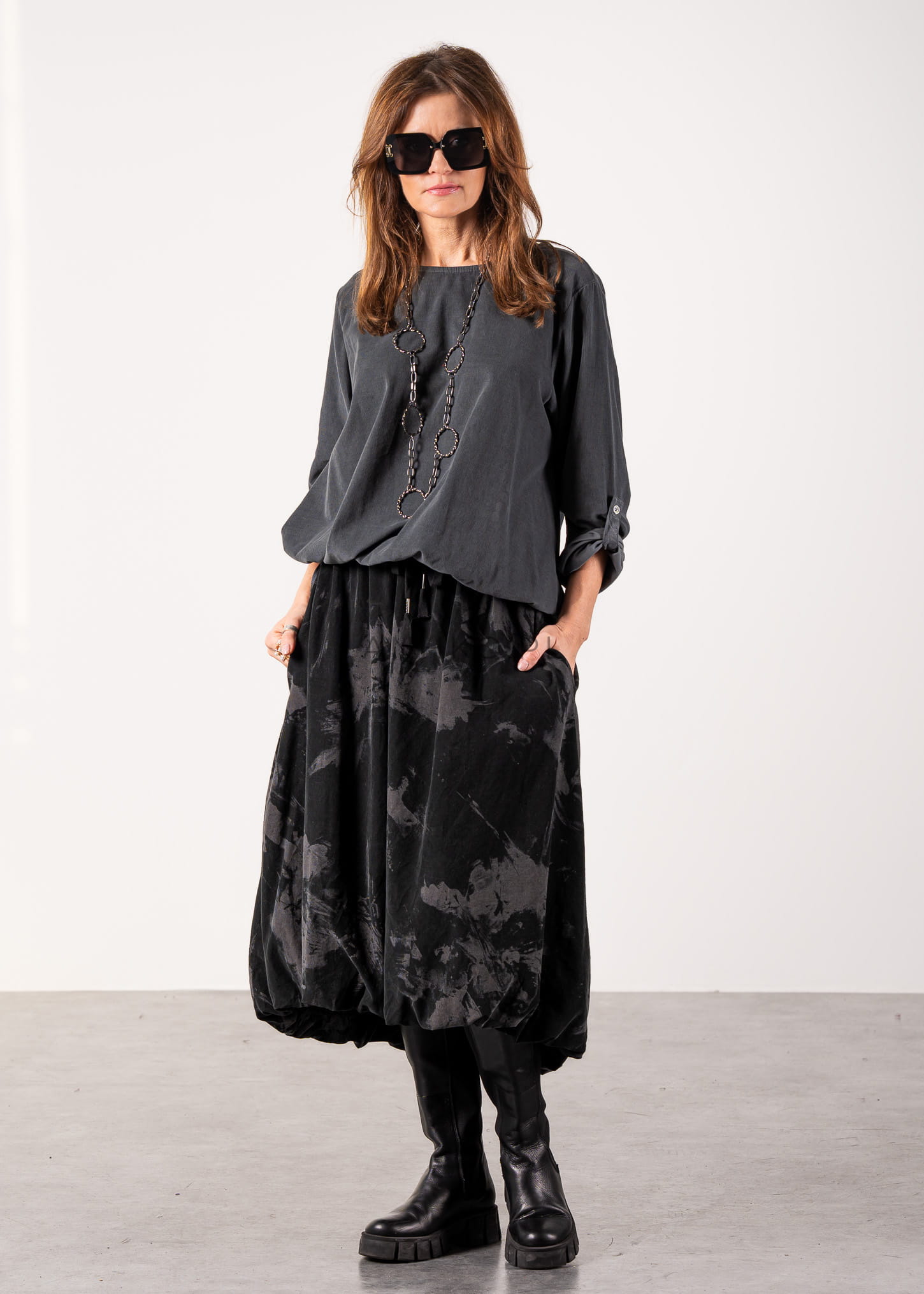 Ta bluzka oversize o luźnym kroju miękko opływa sylwetkę, tworząc efekt niewymuszonej elegancji i komfortu. Subtelnie wydłużona linia oraz delikatne marszczenie u dołu sprawiają, że model świetnie układa się zarówno wpuszczony w spódnicę, jak i noszony swobodnie. Stonowany odcień szarości podkreśla minimalistyczny charakter, a okrągły dekolt nadaje całości ponadczasowej prostoty.