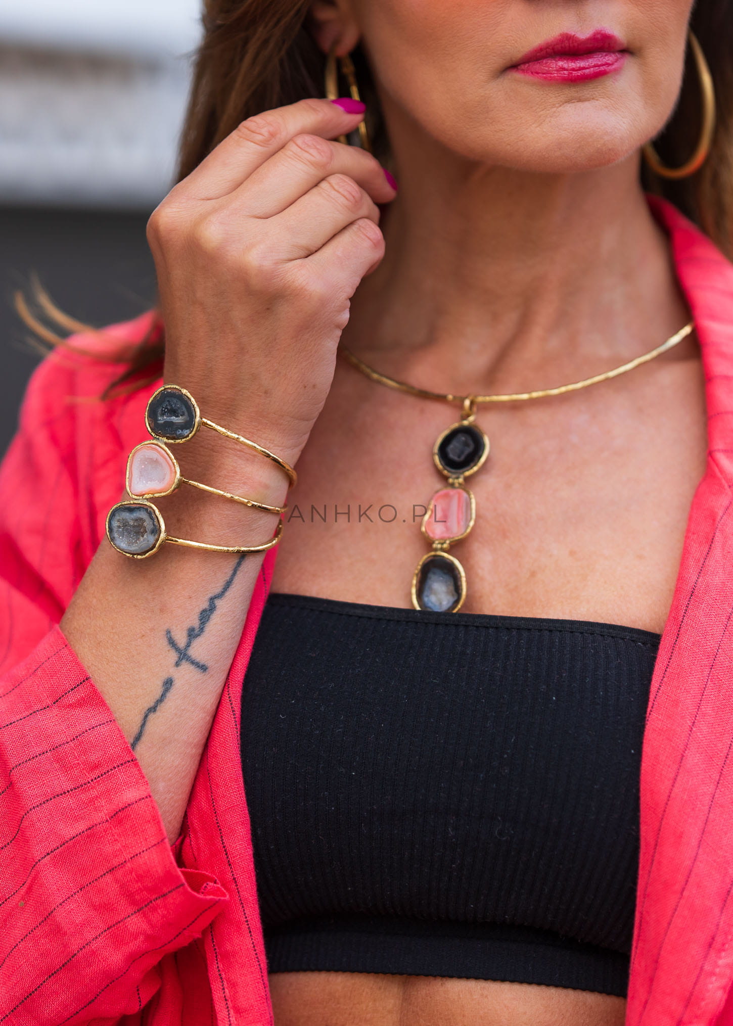 Bransoleta Geo Line to połączenie naturalnego piękna kamienia i nowoczesnego designu. Dwa surowe fragmenty Agatu osadzone są w chropowatej opasce, której otwarty fason pozwala na lekkie dopasowanie do nadgarstka. Ten unikatowy dodatek doskonale podkreśli rockowe lub boho stylizacje — skórzane kurtki, czarne sukienki maxi czy minimalistyczne topy i garnitury. Sprawdzi się na koncerty, wieczorne wyjścia i artystyczne spotkania, gdzie chcesz zwrócić na siebie uwagę nietuzinkowym detalem. Lekka konstrukcja i regulowany kształt zapewniają komfort noszenia od rana aż po nocne przyjęcia.