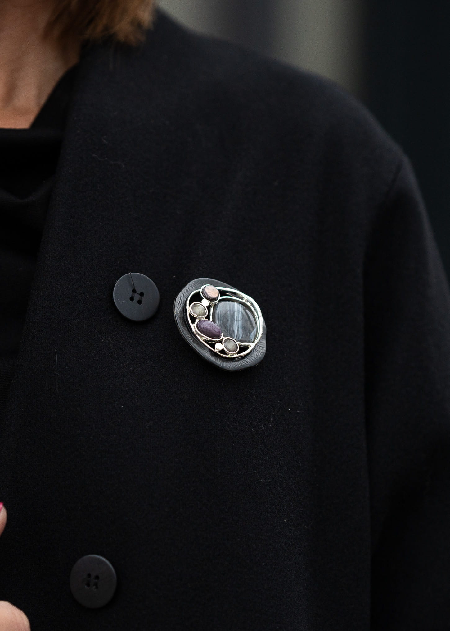 Unikatowy dodatek inspirowany naturalnymi kształtami i kosmiczną harmonią. Owalna forma z dekoracyjnymi elementami tworzy elegancką, artystyczną kompozycję, która przyciąga wzrok i nadaje stylizacji indywidualnego charakteru. Magnetyczne zapięcie pozwala bezpiecznie i wygodnie przypiąć broszkę bez uszkadzania tkaniny, co czyni ją idealnym wyborem do delikatnych materiałów. Broszka doskonale sprawdzi się jako akcent do płaszczy, żakietów, kardiganów, sukienek czy prostych bluzek. To ponadczasowy dodatek, który podkreśli zarówno codzienne, jak i bardziej eleganckie stylizacje.