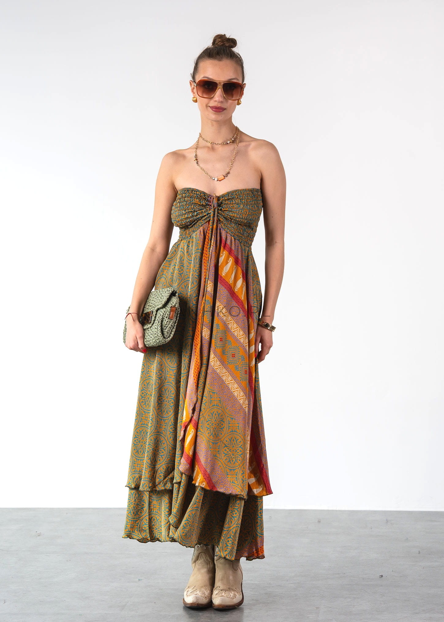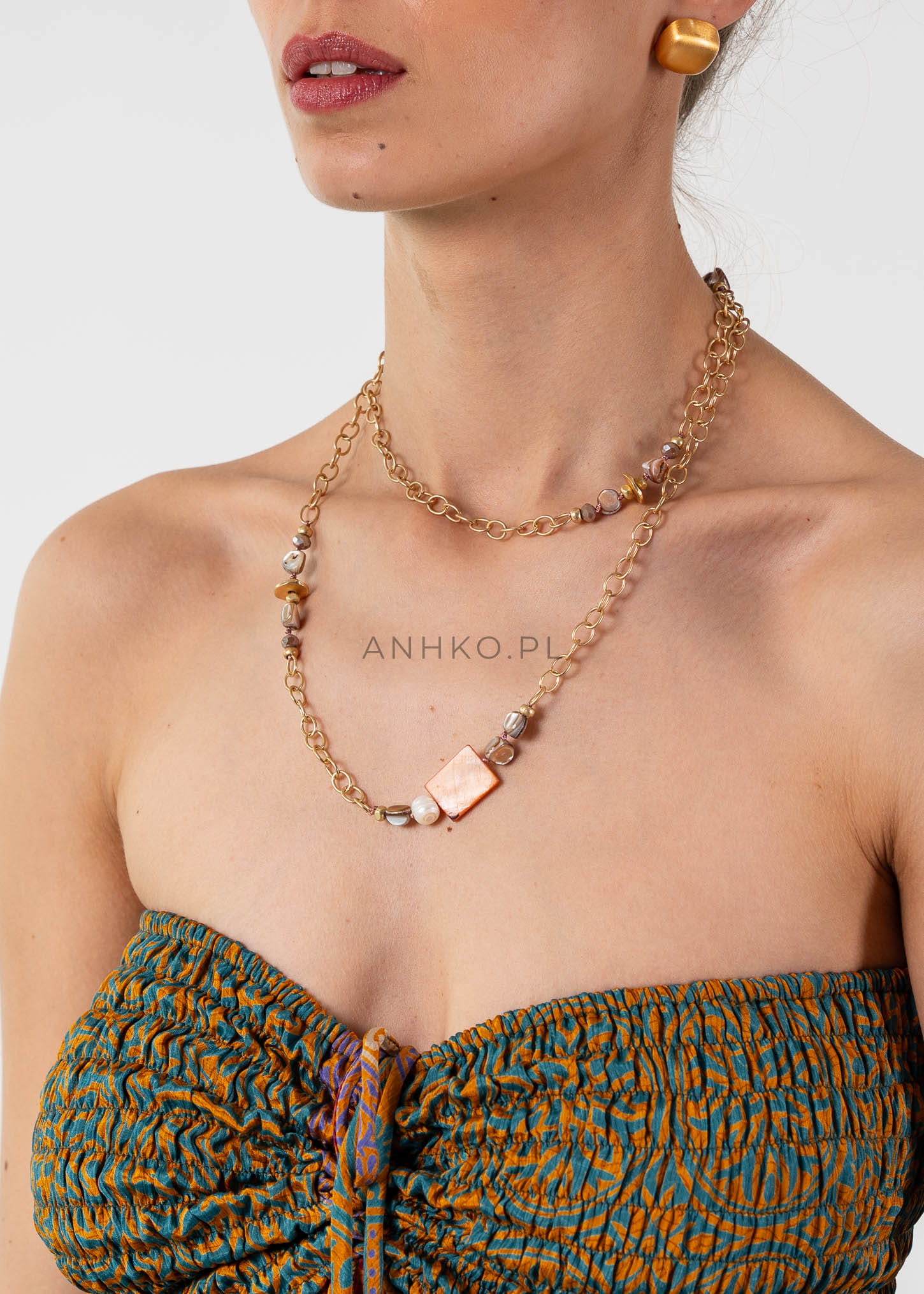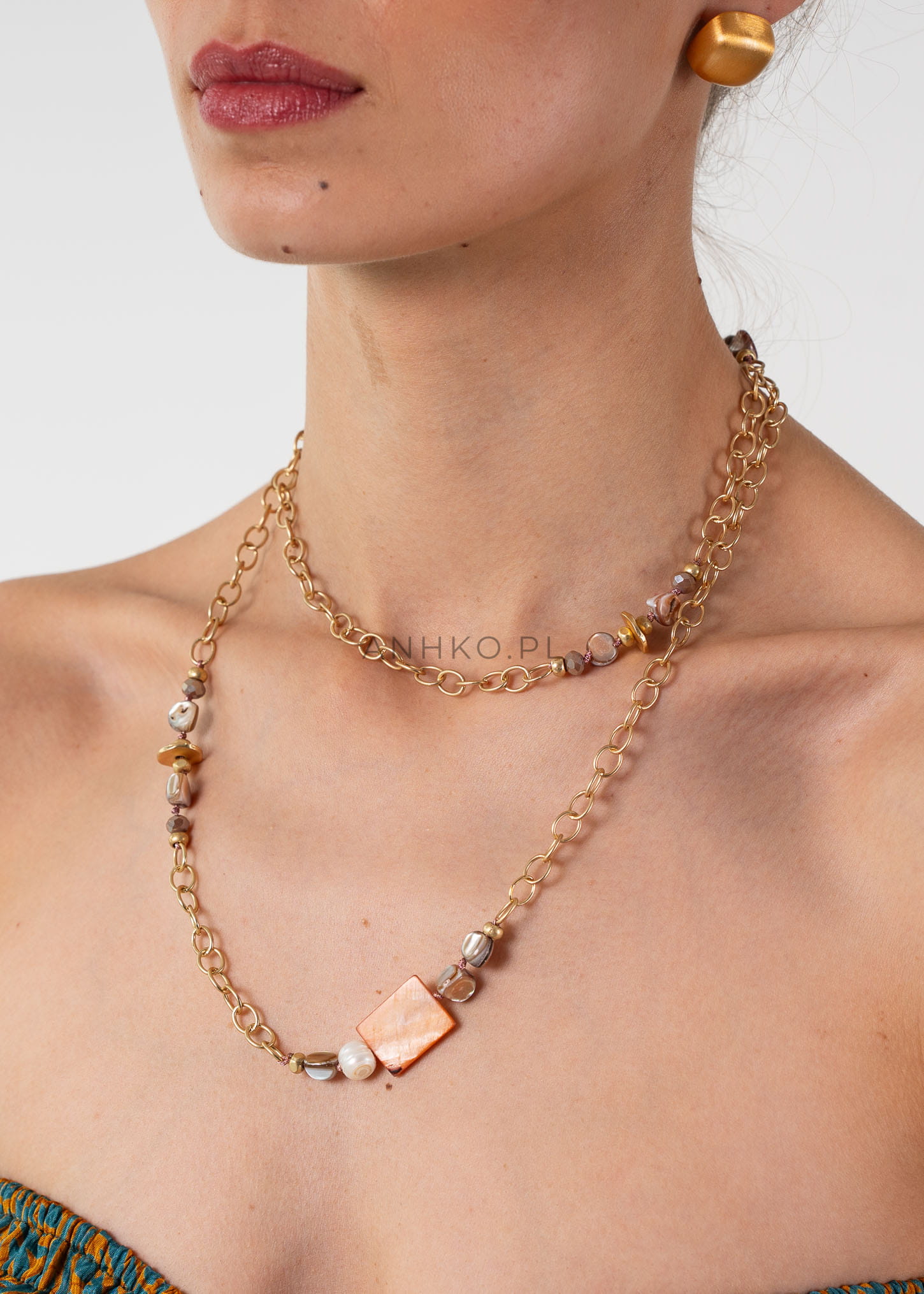 Naszyjnik Coll to doskonały wybór dla osób, które cenią subtelną elegancję i naturalne piękno. Długi łańcuszek kabelkowy w złotym kolorze idealnie współgra z kamieniami i koralikami w odcieniach brązu, beżu oraz pomarańczy. Naszyjnik jest bez regulacji długości, dzięki czemu ma prostą i elegancką formę.