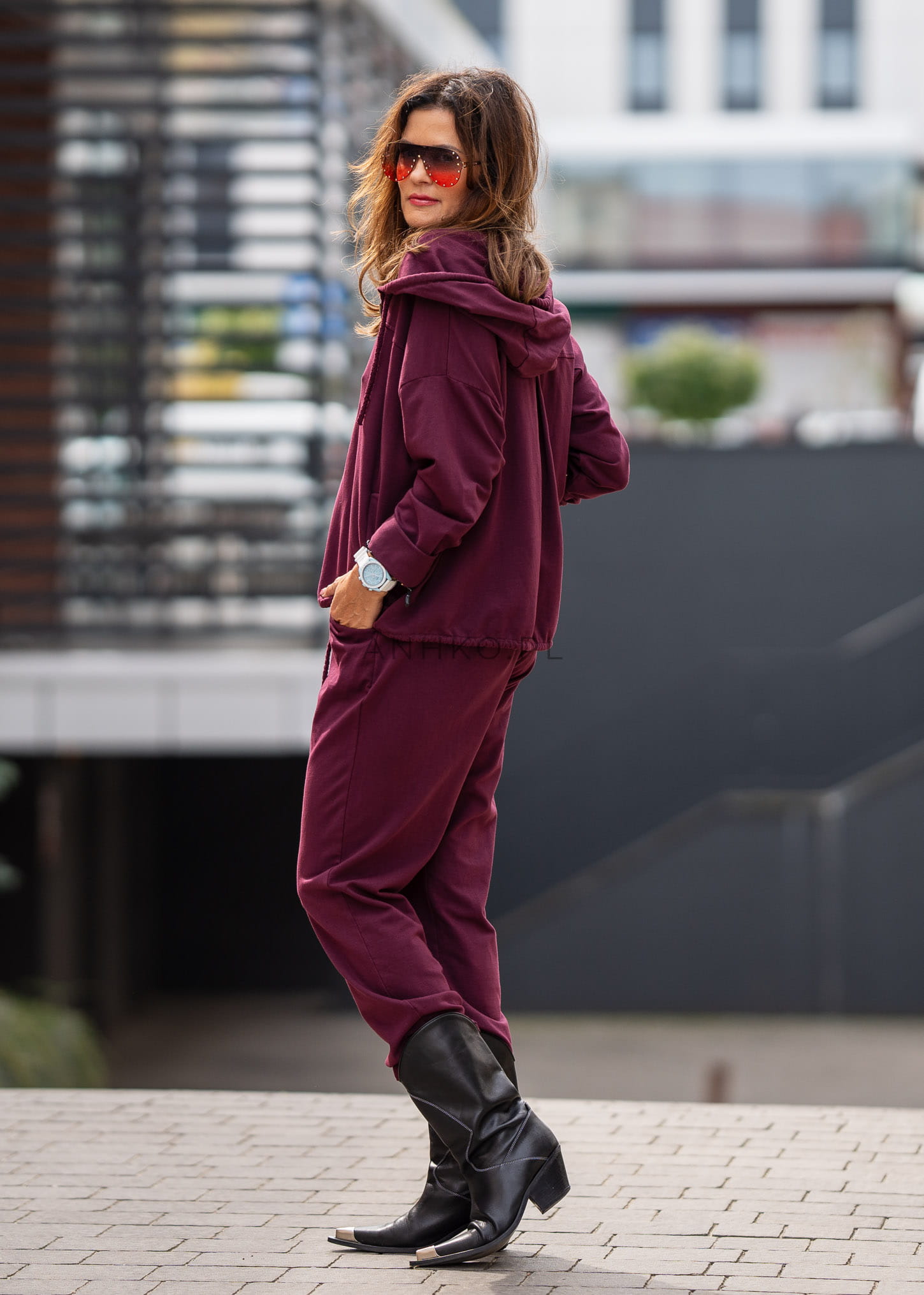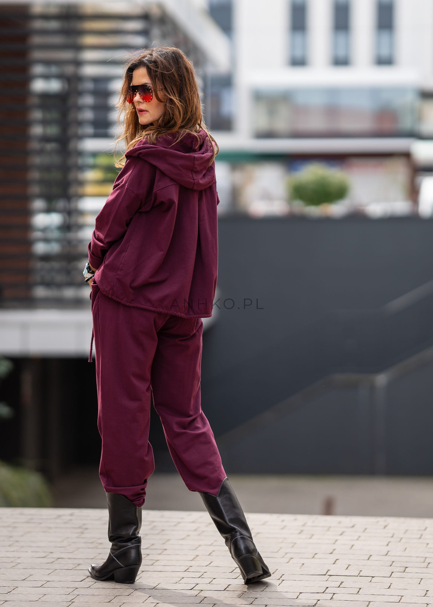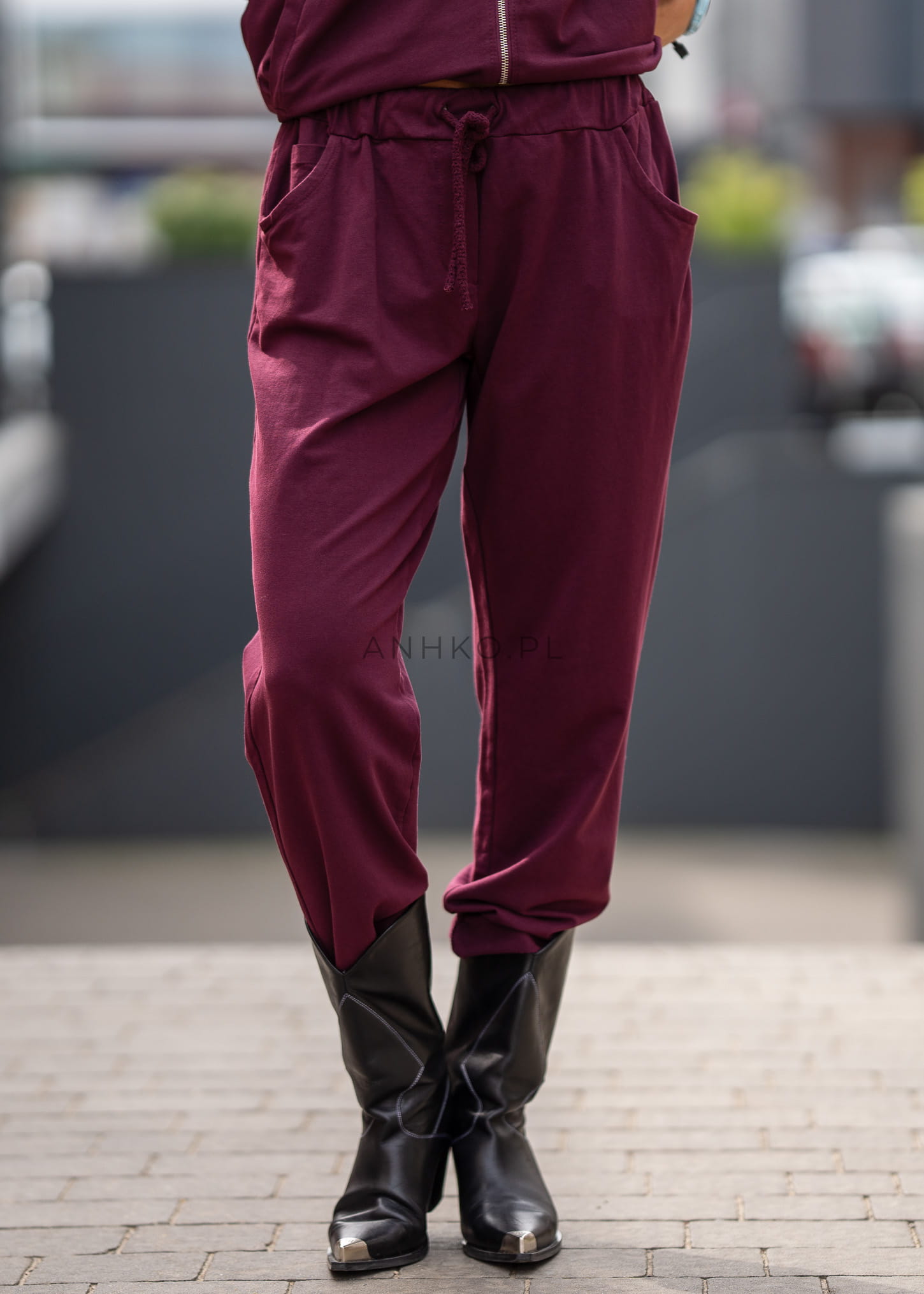 Ten dres damski w głębokim odcieniu bordo układa się miękko na sylwetce, tworząc spójną, nowoczesną formę. Luźniejsza góra delikatnie opada na biodra, a spodnie z elastycznym pasem podkreślają komfort noszenia bez uczucia skrępowania.