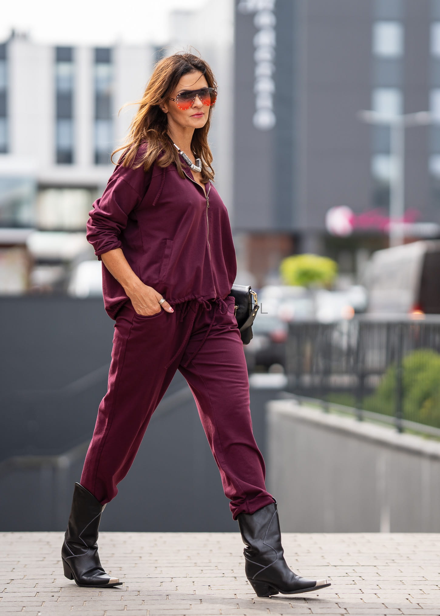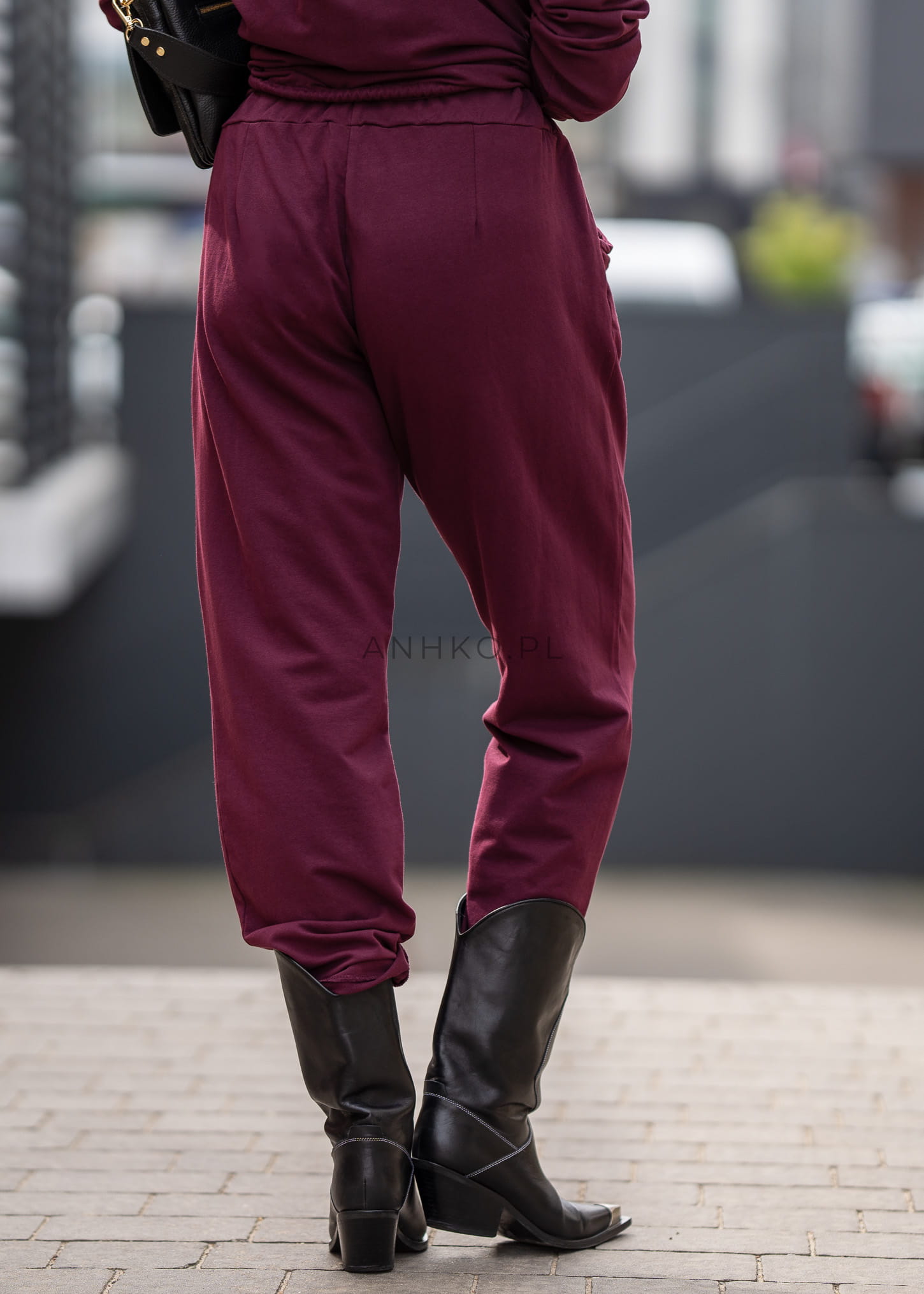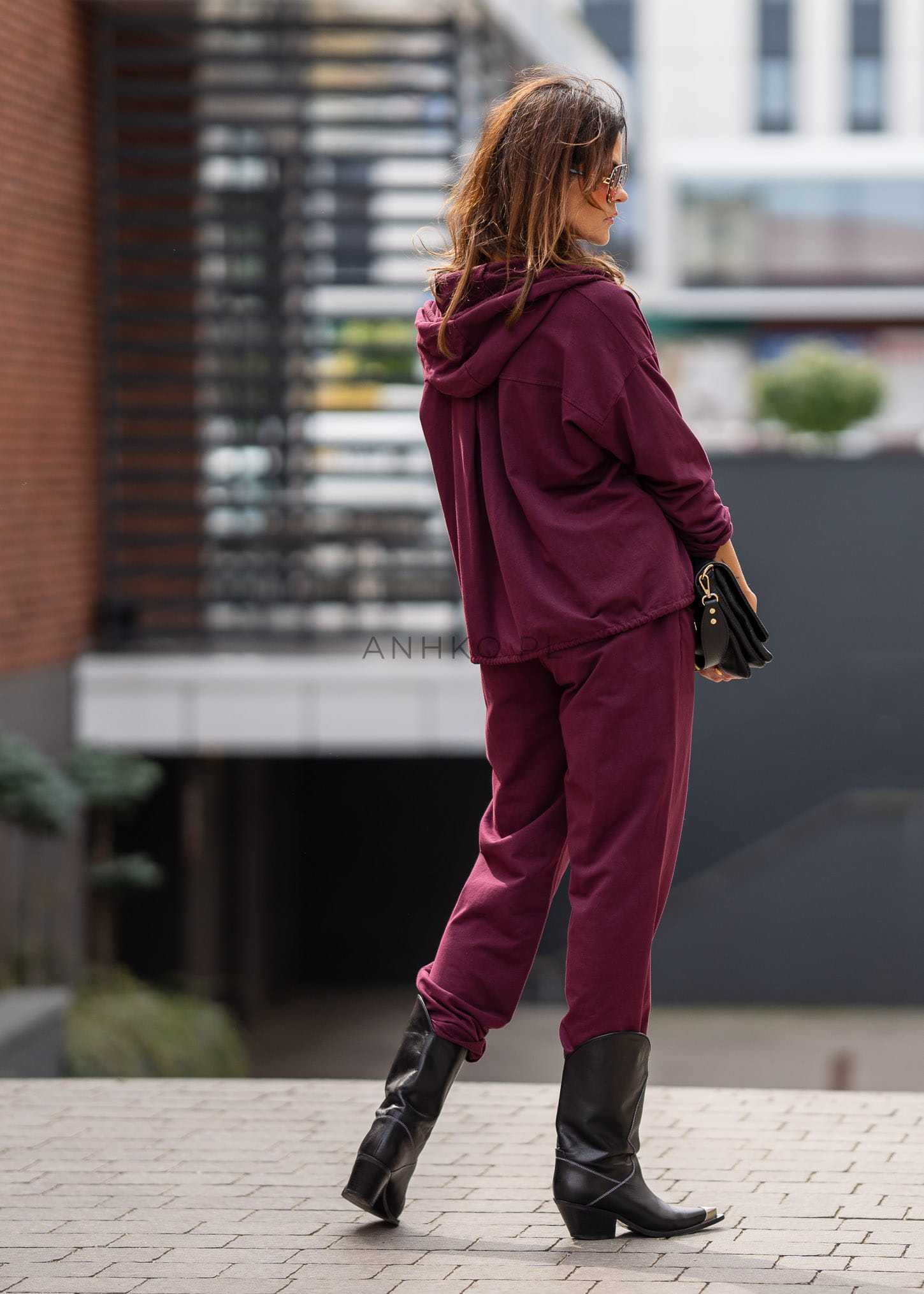 Ten dres damski w głębokim odcieniu bordo układa się miękko na sylwetce, tworząc spójną, nowoczesną formę. Luźniejsza góra delikatnie opada na biodra, a spodnie z elastycznym pasem podkreślają komfort noszenia bez uczucia skrępowania.