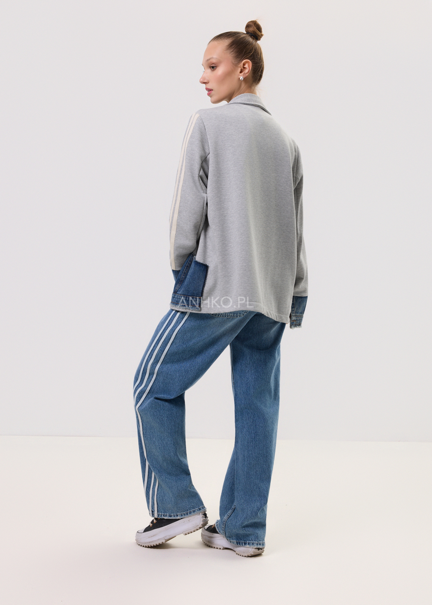 Marynarka Stron Denim Szara - Nowoczesna marynarka, która łączy komfort bluzy z charakterem denimu. Szary melanż i surowe jeansowe wykończenia tworzą mocny, streetowy akcent w codziennych stylizacjach.