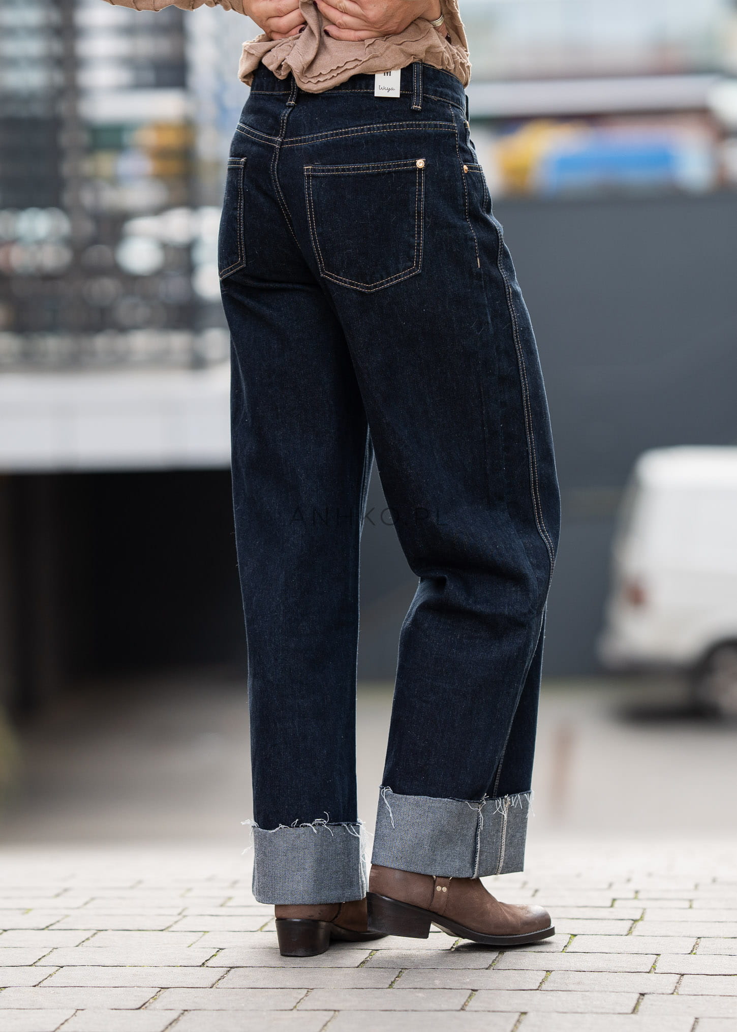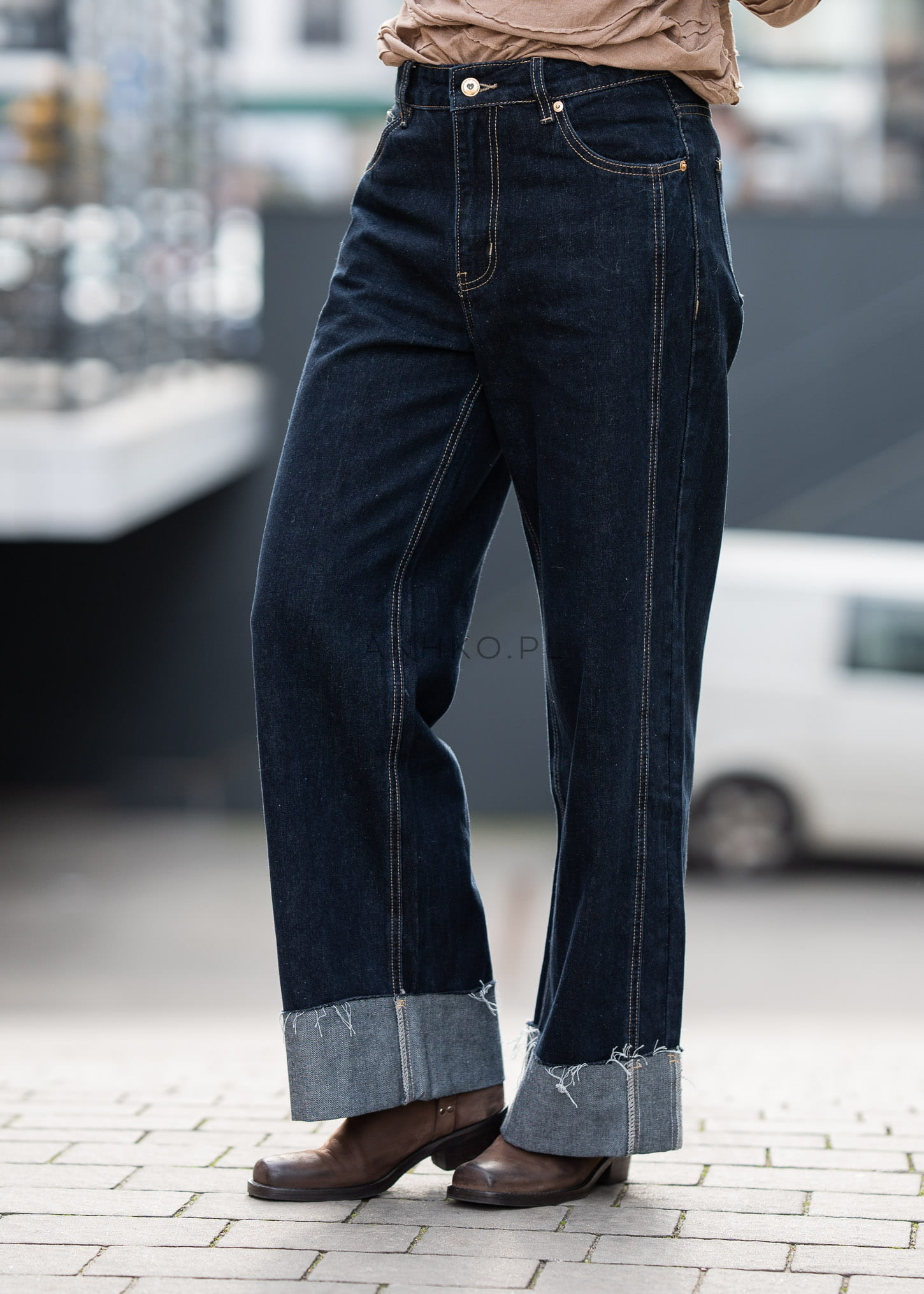 Jeansy Mona Granatowe - Przedstawiamy stylowe i wygodne jeansy, idealne dla osób ceniących modę i komfort. Te wyjątkowe spodnie wyróżniają się prostym krojem, nieco szerszymi nogawkami oraz charakterystycznymi, postrzępionymi mankietami, które nadają im nonszalancki, casualowy wygląd. Doskonałe na co dzień, ale równie dobrze komponują się z bardziej eleganckimi stylizacjami, tworząc unikalny, nowoczesny look.