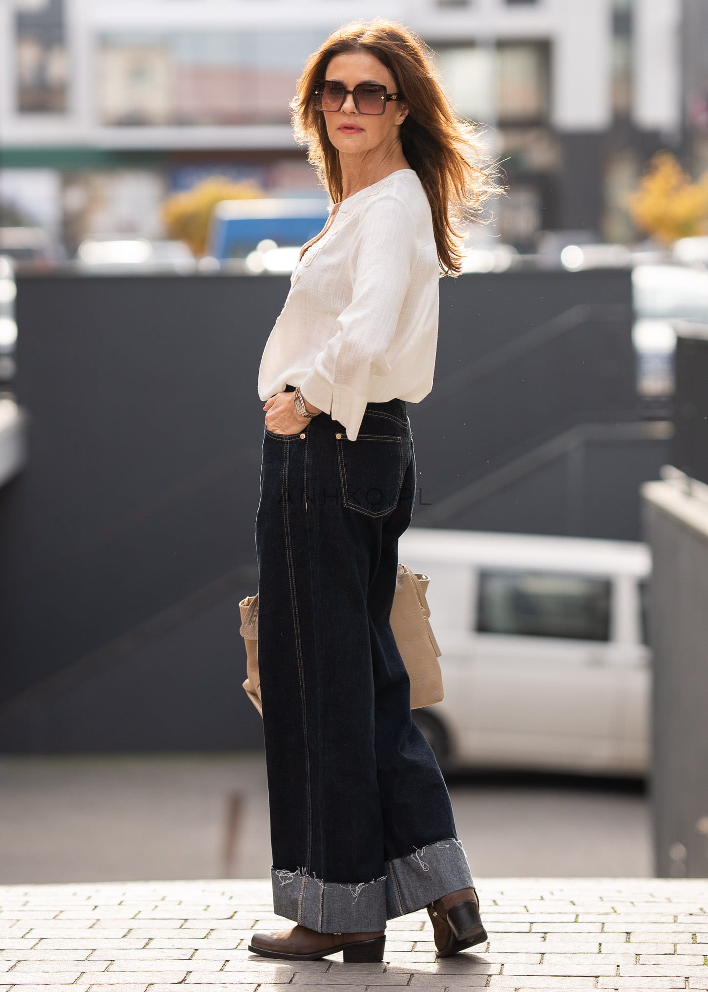 - Proste, szersze nogawki z postrzępionymi mankietami