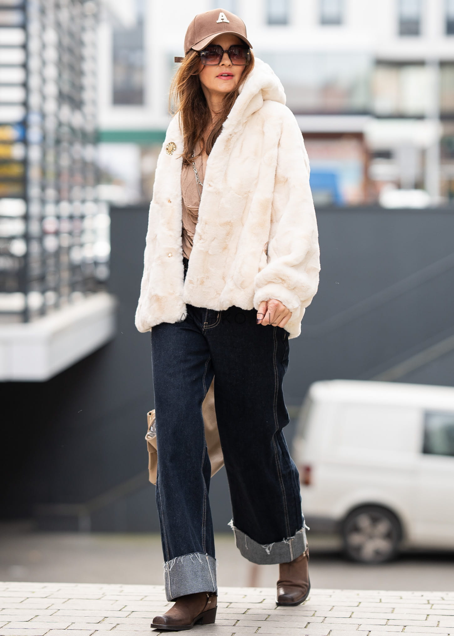- Metalowe nity oraz subtelne zdobienia przy kieszeniach podkreślają nowoczesny design