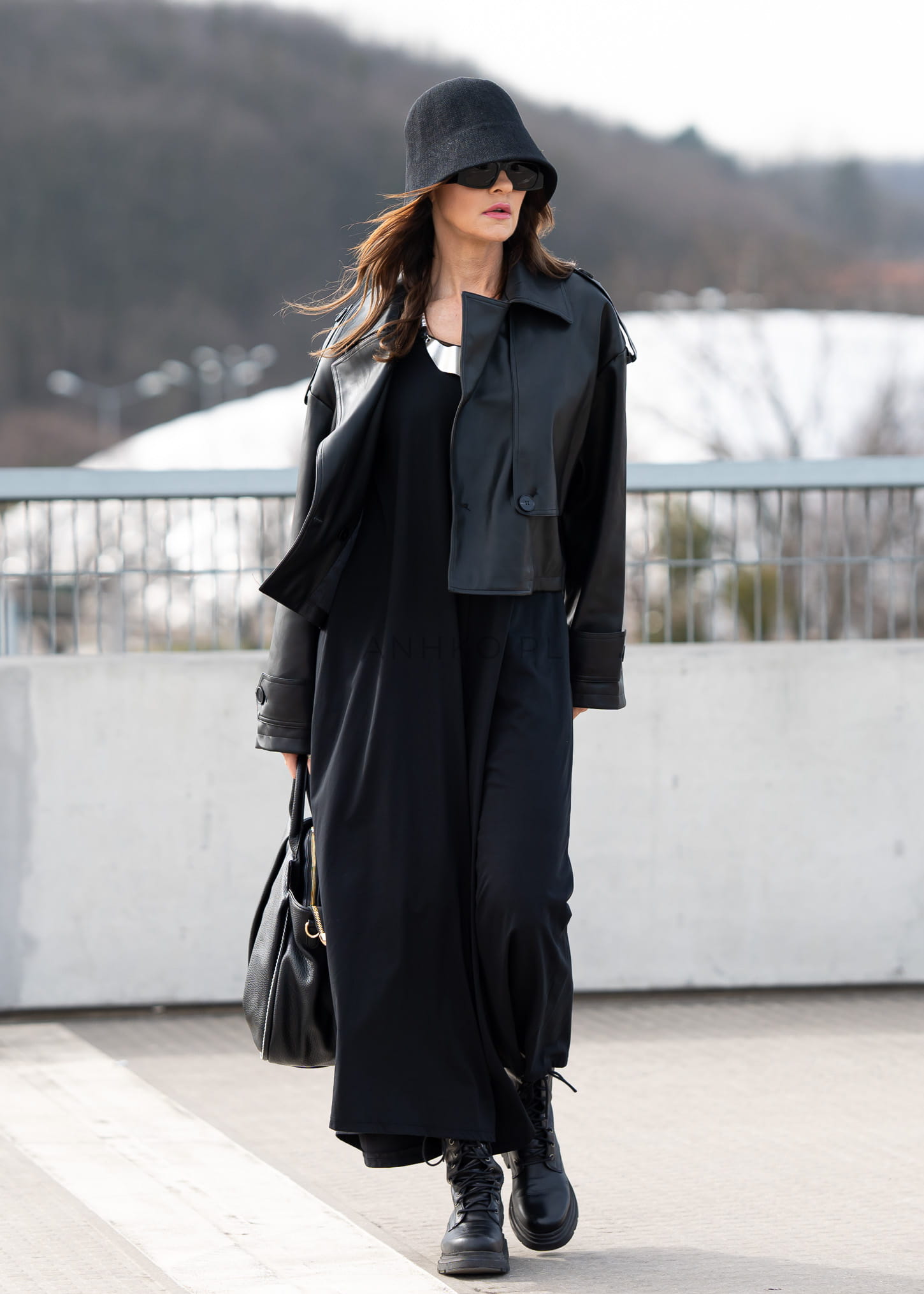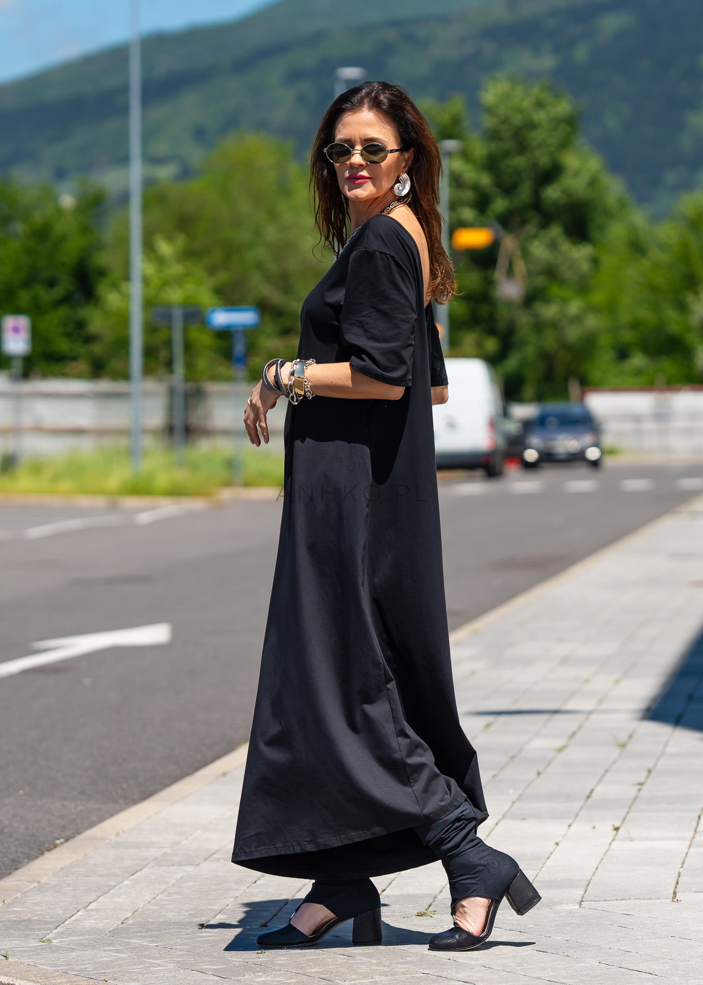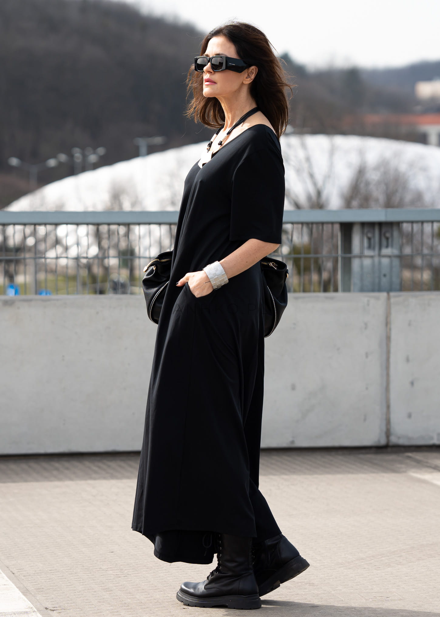 Model wyróżnia się bardzo szeroką nogawką, która przy chodzeniu daje efekt niemal sukienkowej formy, zachowując jednocześnie funkcjonalność kombinezonu. Minimalistyczny design oraz luźna linia sprawiają, że to idealna baza do stylizacji – od codziennych po bardziej wyraziste zestawy z dodatkami.