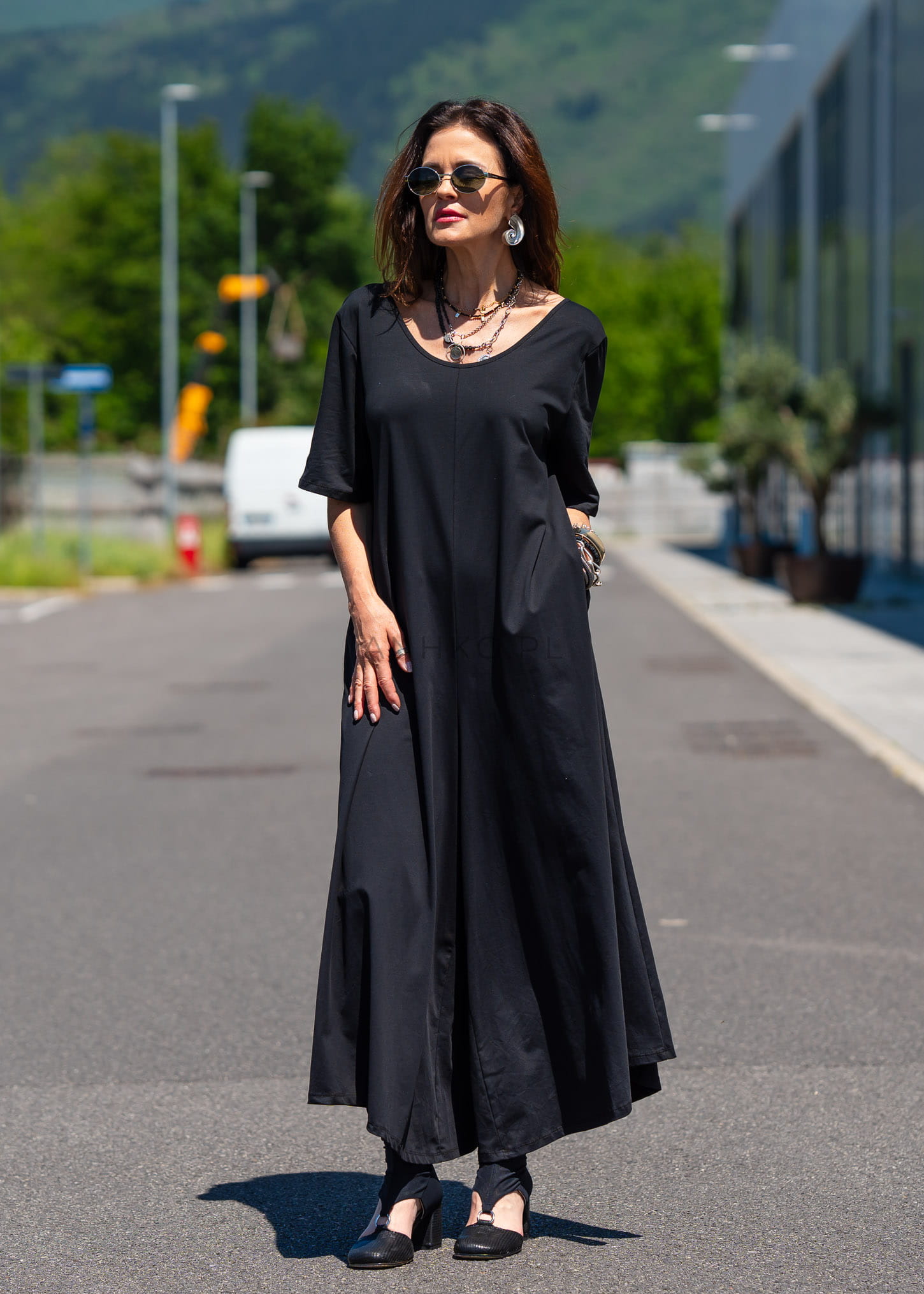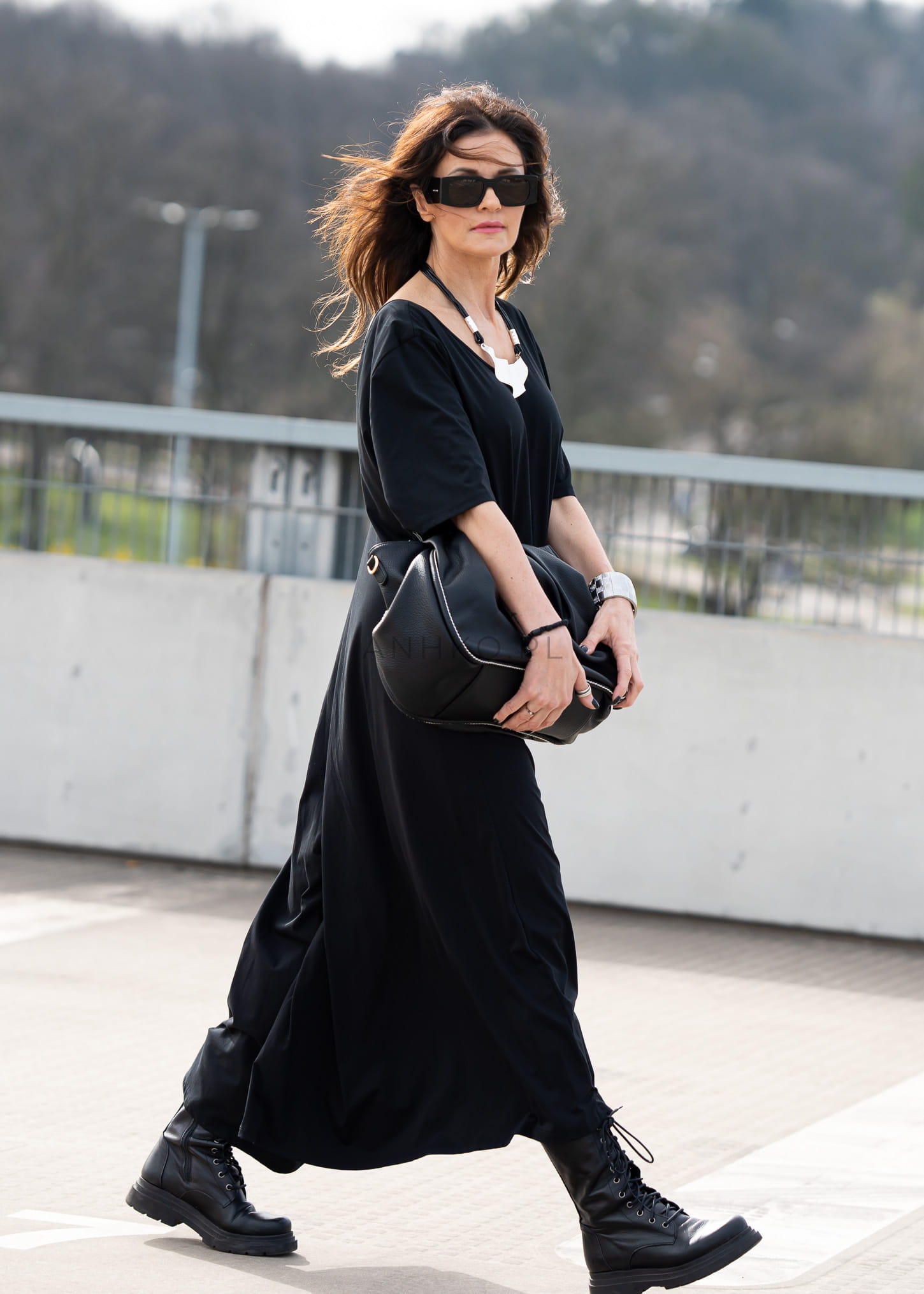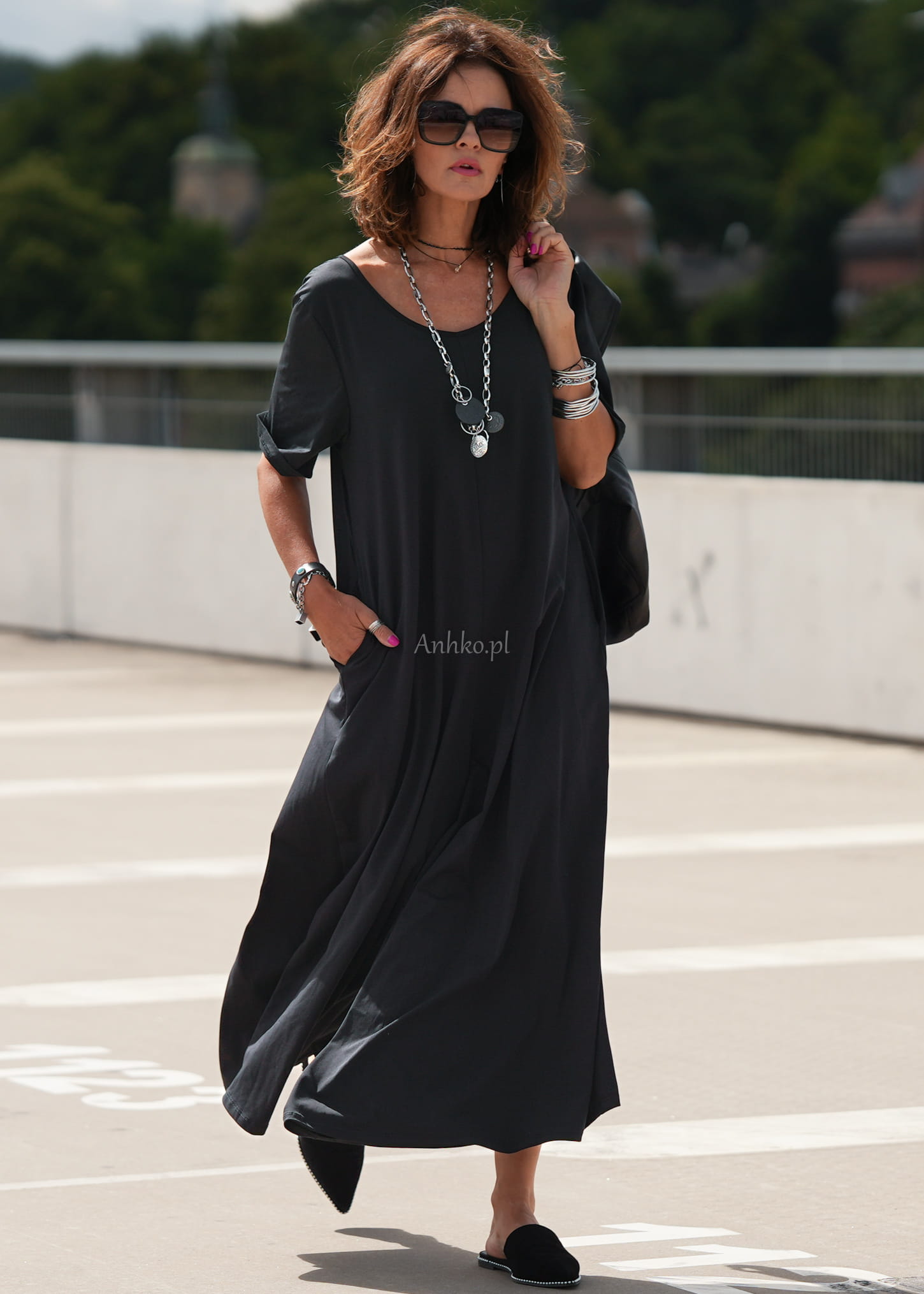 Model wyróżnia się bardzo szeroką nogawką, która przy chodzeniu daje efekt niemal sukienkowej formy, zachowując jednocześnie funkcjonalność kombinezonu. Minimalistyczny design oraz luźna linia sprawiają, że to idealna baza do stylizacji – od codziennych po bardziej wyraziste zestawy z dodatkami.