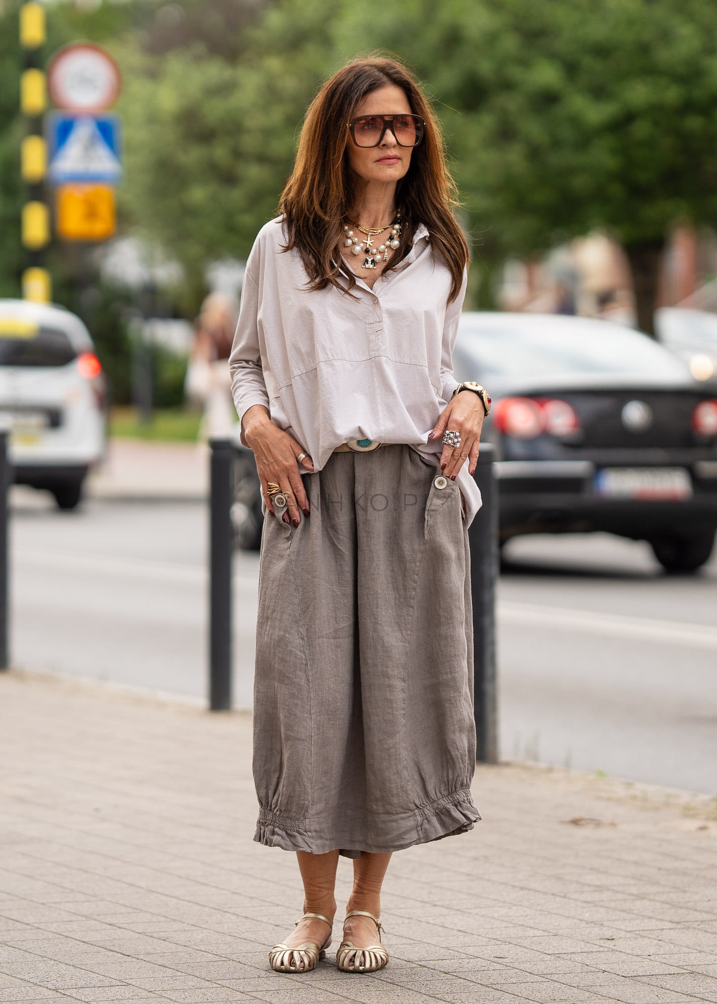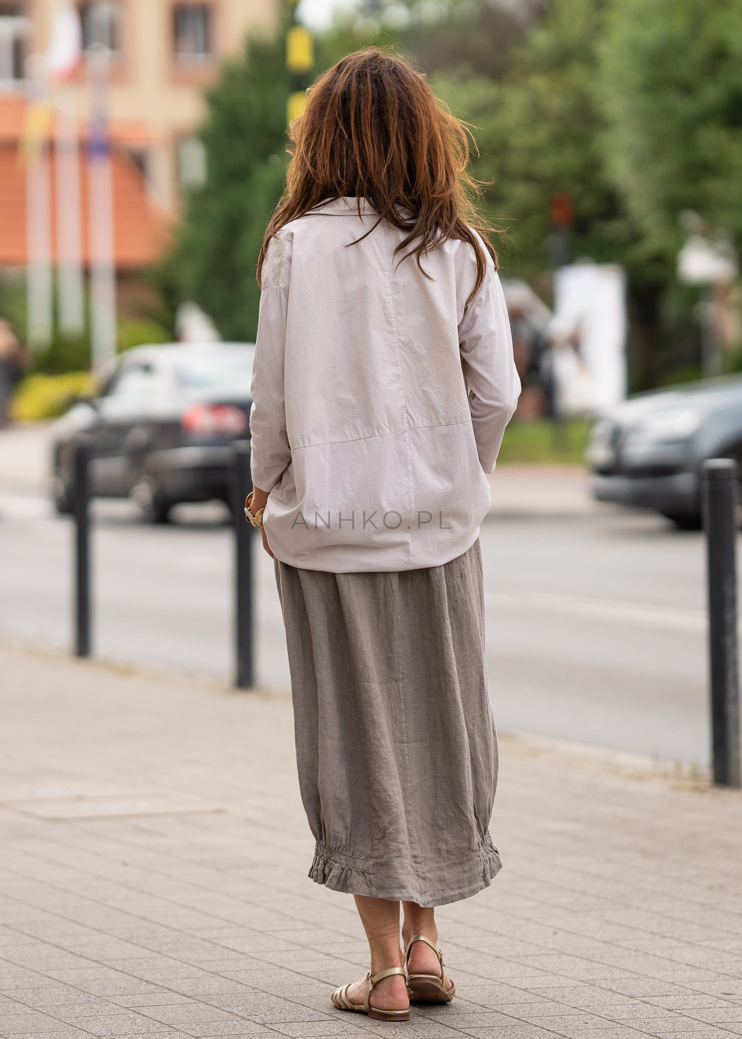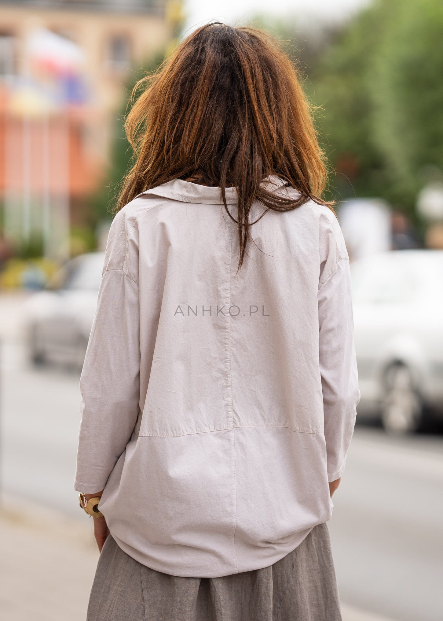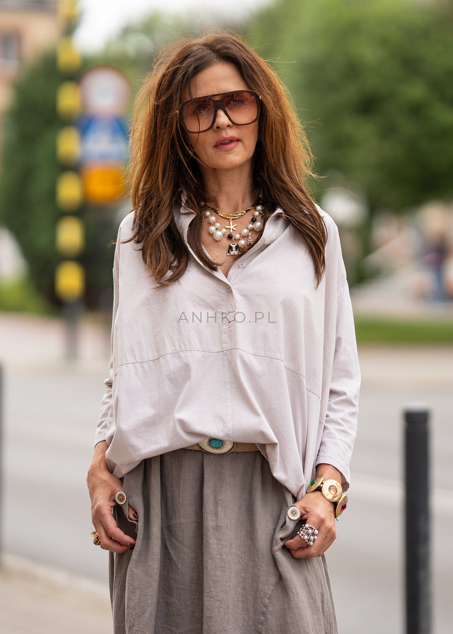 Ta koszula damska o oversize’owym kroju swobodnie układa się na sylwetce, tworząc efekt kontrolowanego luzu. Delikatny, beżowy odcień podkreśla naturalny charakter stylizacji, a subtelne przeszycie poniżej linii biustu optycznie porządkuje proporcje i nadaje formie nowoczesny akcent.