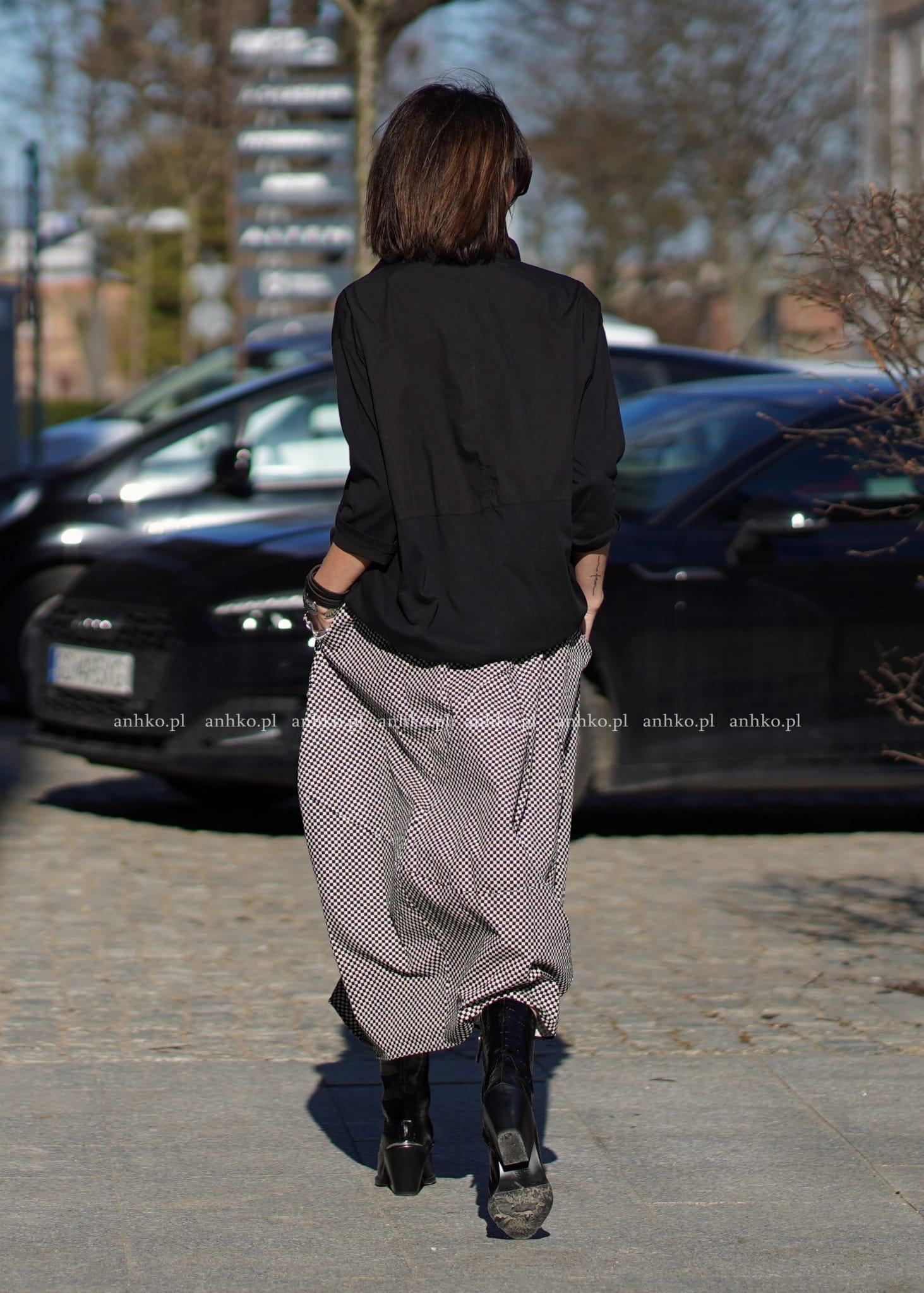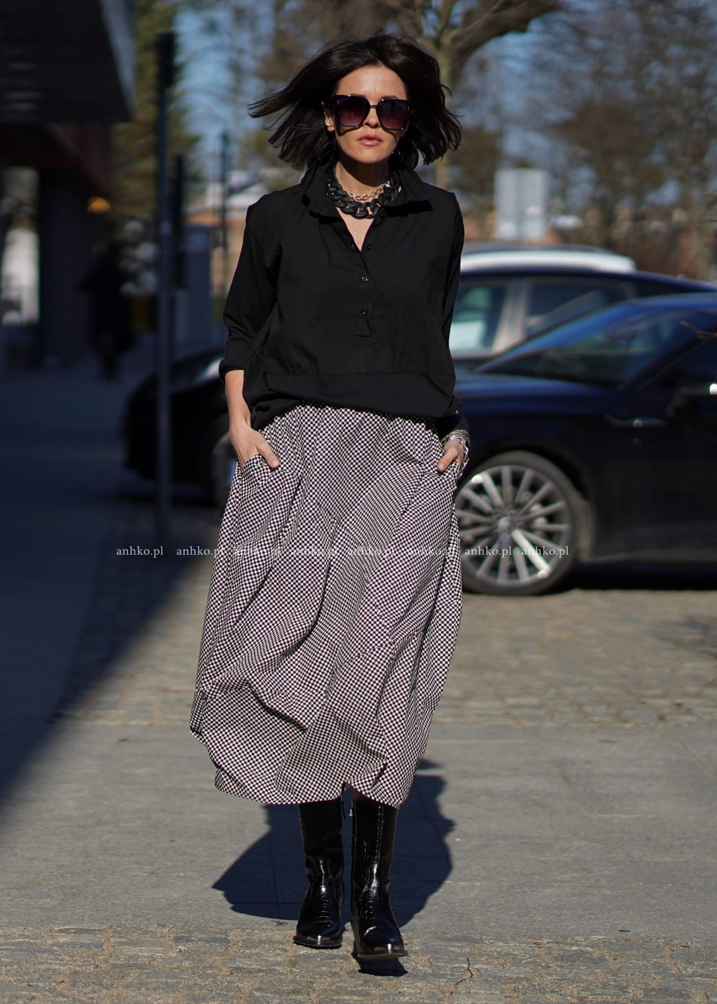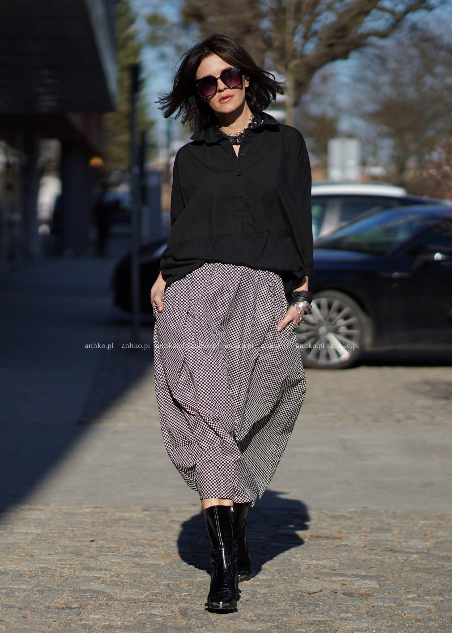 Góra utrzymana w koszulowej estetyce z kołnierzykiem i zapięciem na guziki kontrastuje z miękkim, bawełnianym dołem, tworząc harmonijną całość. Czerń sprawia, że model staje się ponadczasową bazą stylizacji – od monochromatycznych zestawów po odważniejsze połączenia z printem czy mocnymi dodatkami.