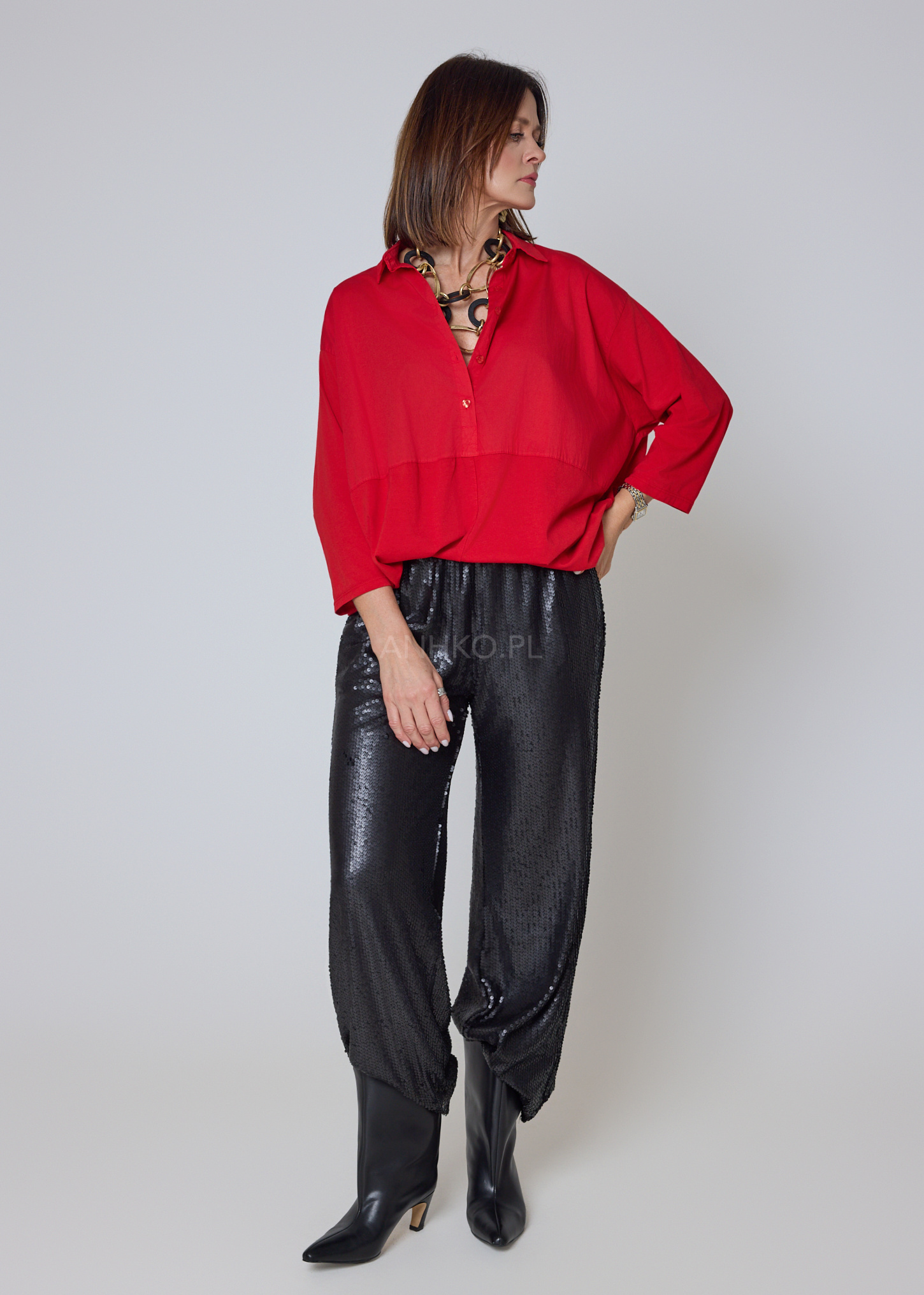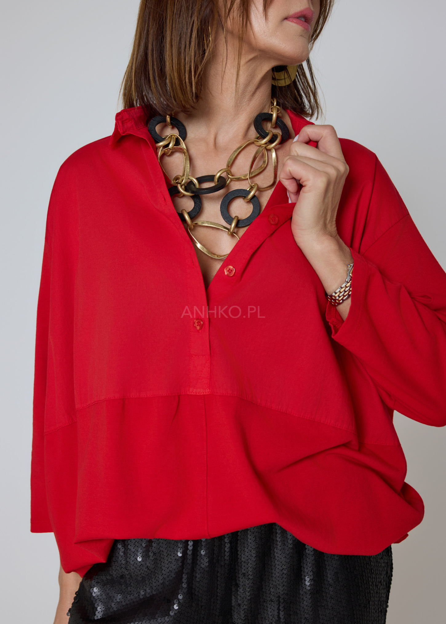 Klasyczny kołnierzyk i zapięcie na guziki balansują mocny kolor, dzięki czemu model pozostaje elegancki i uniwersalny. Czerwień w tym wydaniu świetnie współgra zarówno z czernią, denimem, jak i metalicznymi akcentami, budując odważną, ale ponadczasową bazę stylizacji.
