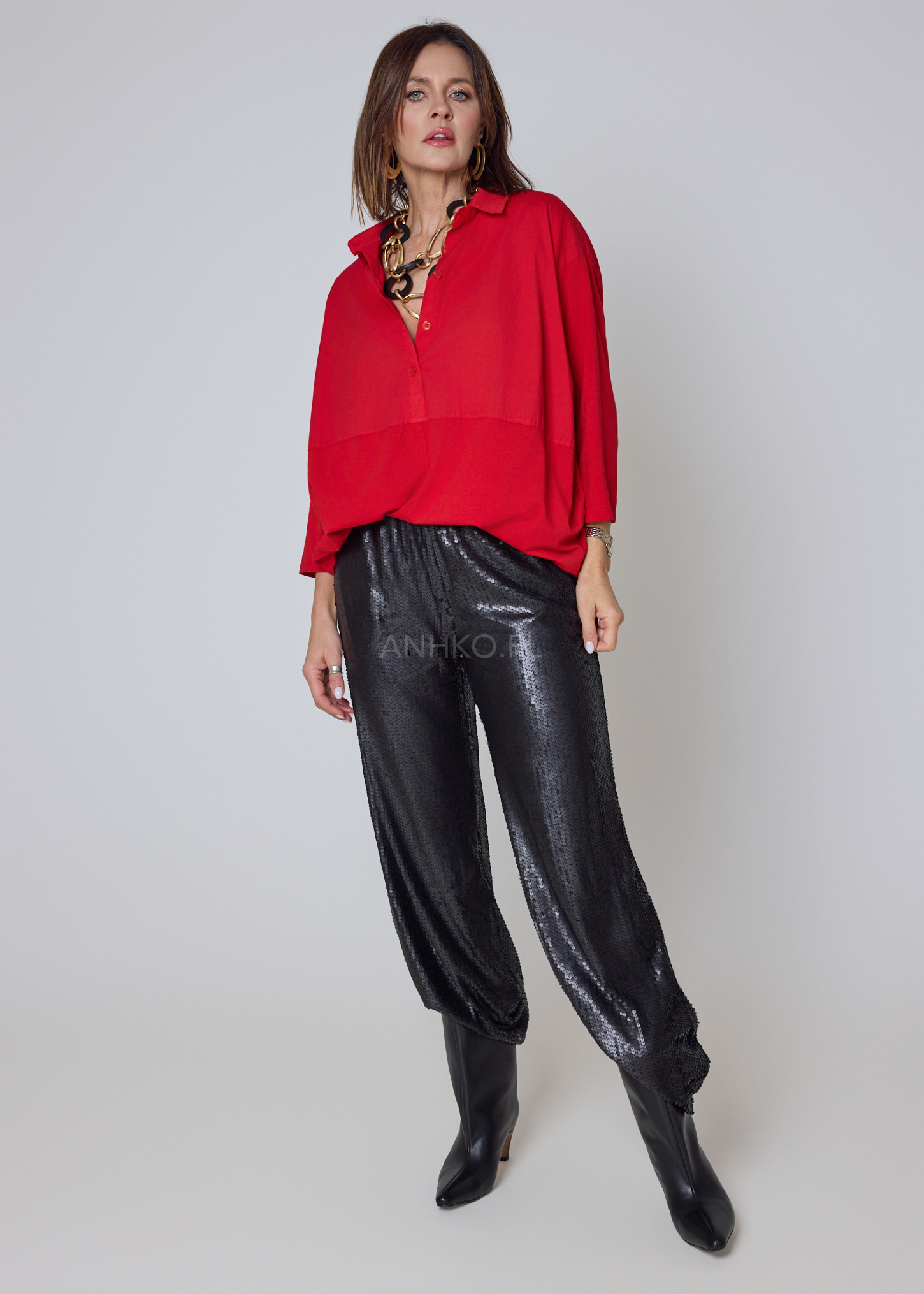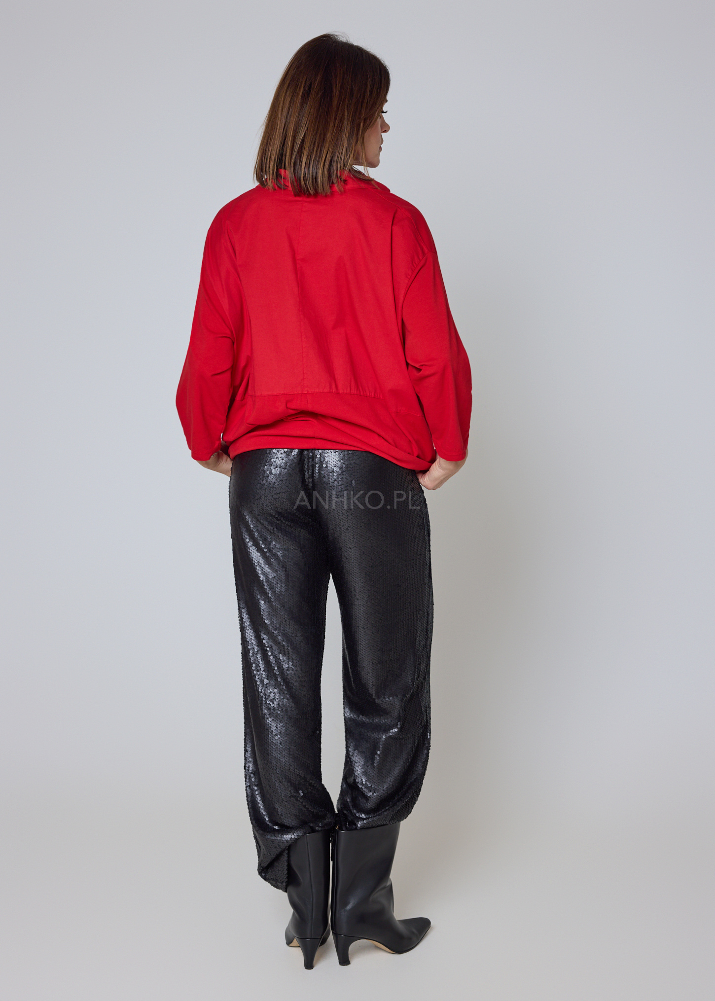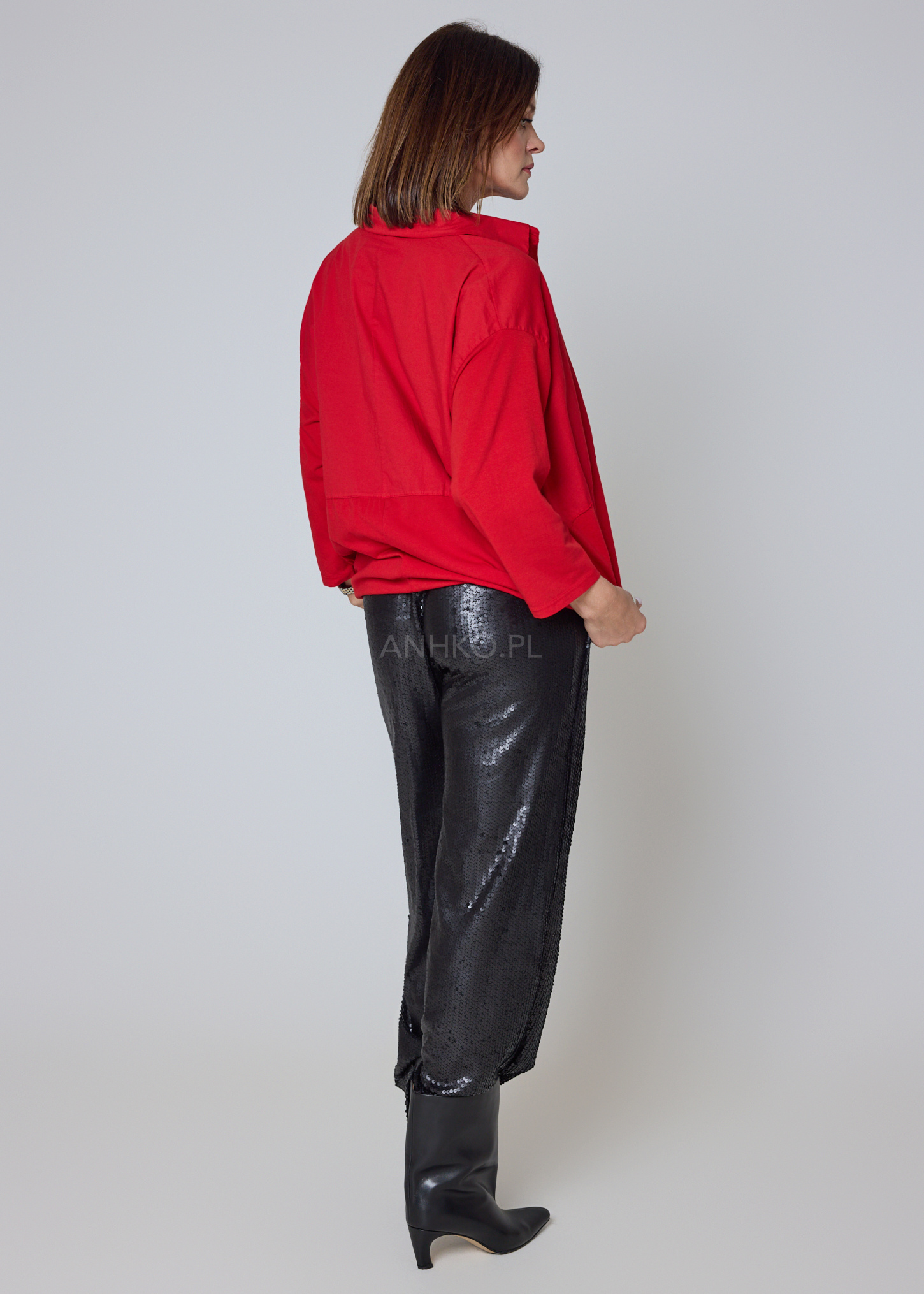 - Kolor: Intensywna, nasycona czerwień podkreślająca charakter stylizacji.