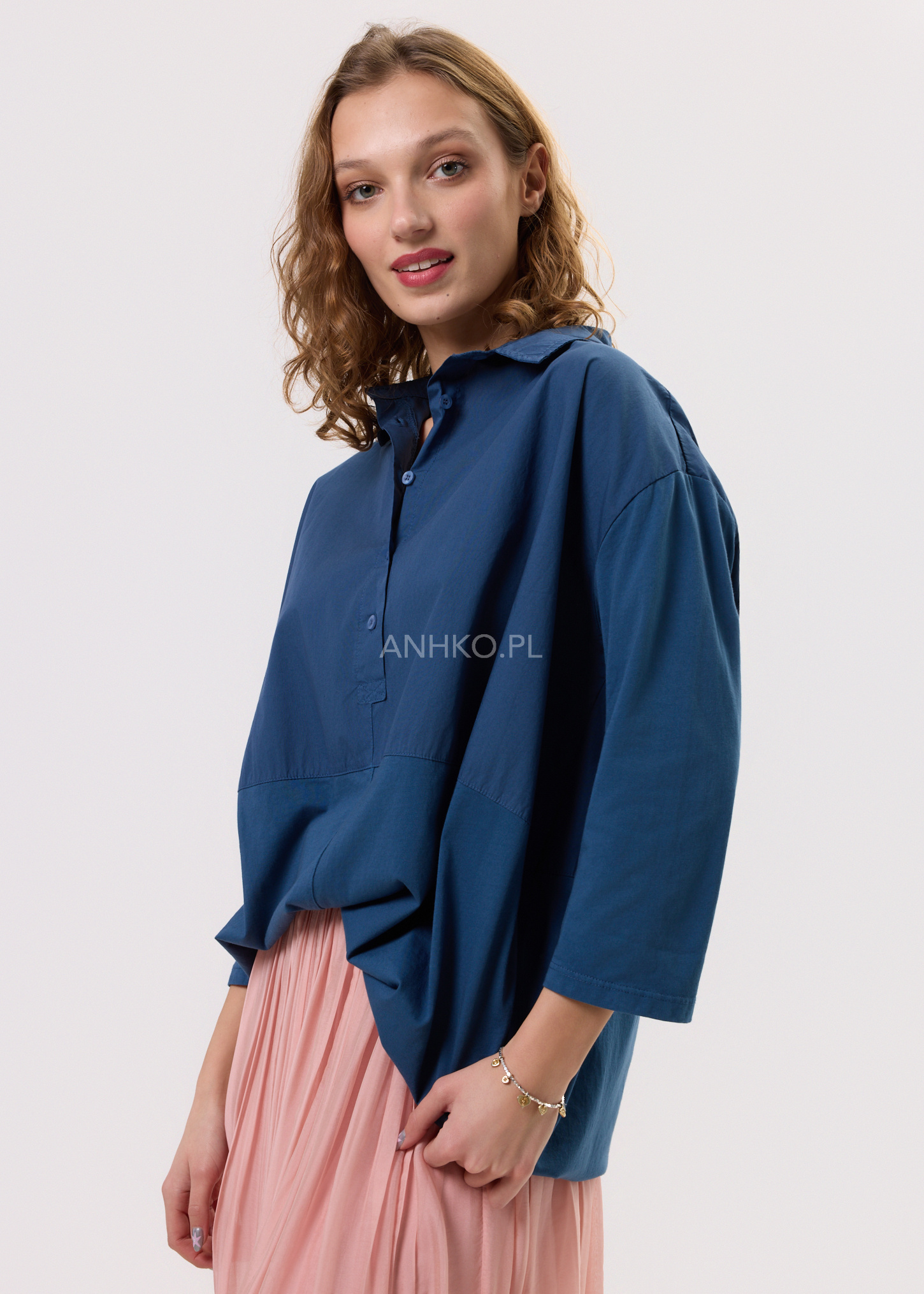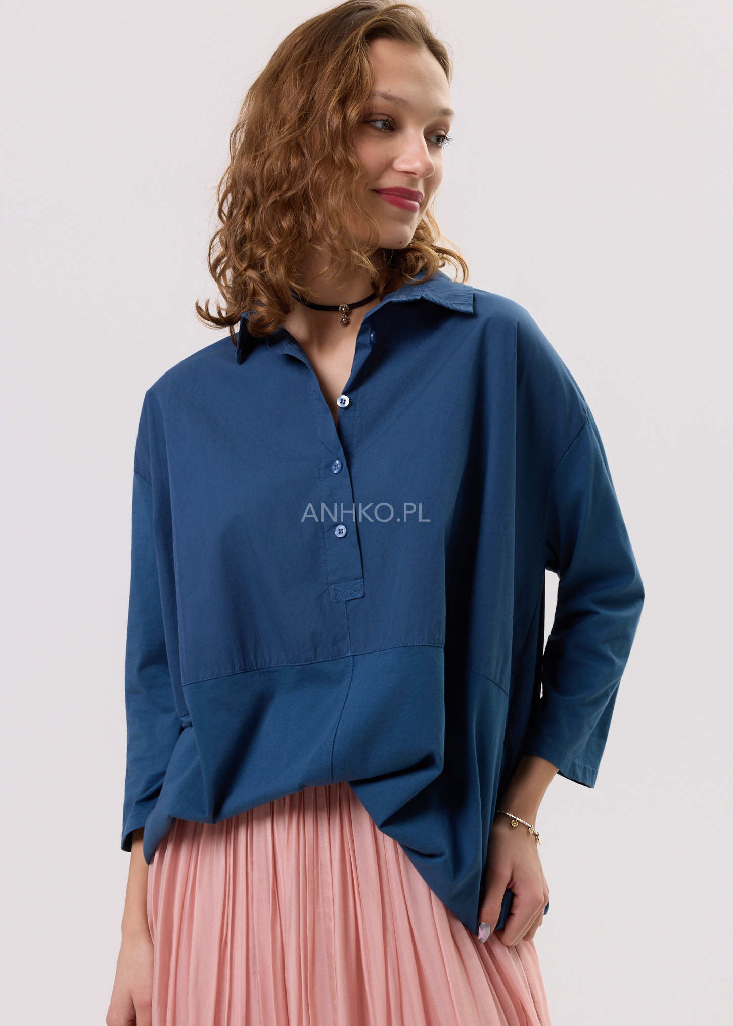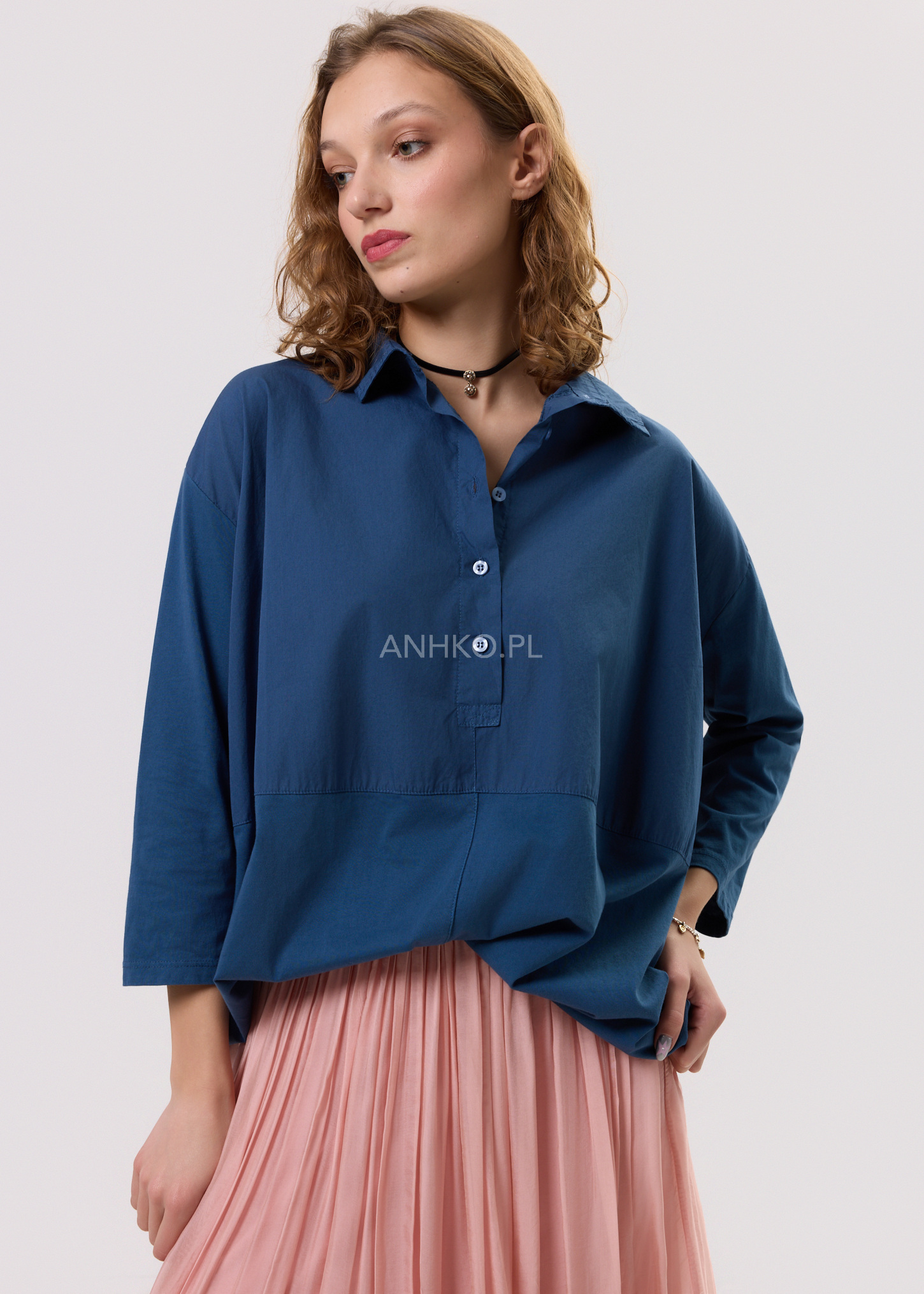 Koszula stworzona z myślą o kobietach ceniących komfort, naturalność i niewymuszoną elegancję. Luźny fason zapewnia swobodę ruchów i pięknie układa się na sylwetce, a miękka, lekka tkanina sprawia, że koszula doskonale sprawdza się przez cały dzień. Klasyczny kołnierzyk nadaje jej uniwersalnego charakteru, dzięki czemu łatwo zestawić ją zarówno ze spódnicami, jak i spodniami. Głęboki granatowy kolor podkreśla styl casual i boho, a jednocześnie pasuje do bardziej stonowanych zestawów. Idealna do pracy, na spotkania, spacery, wyjazdy oraz codzienne stylizacje w miejskim rytmie.