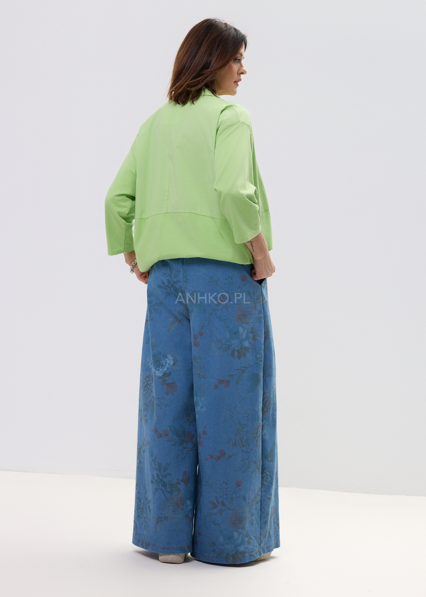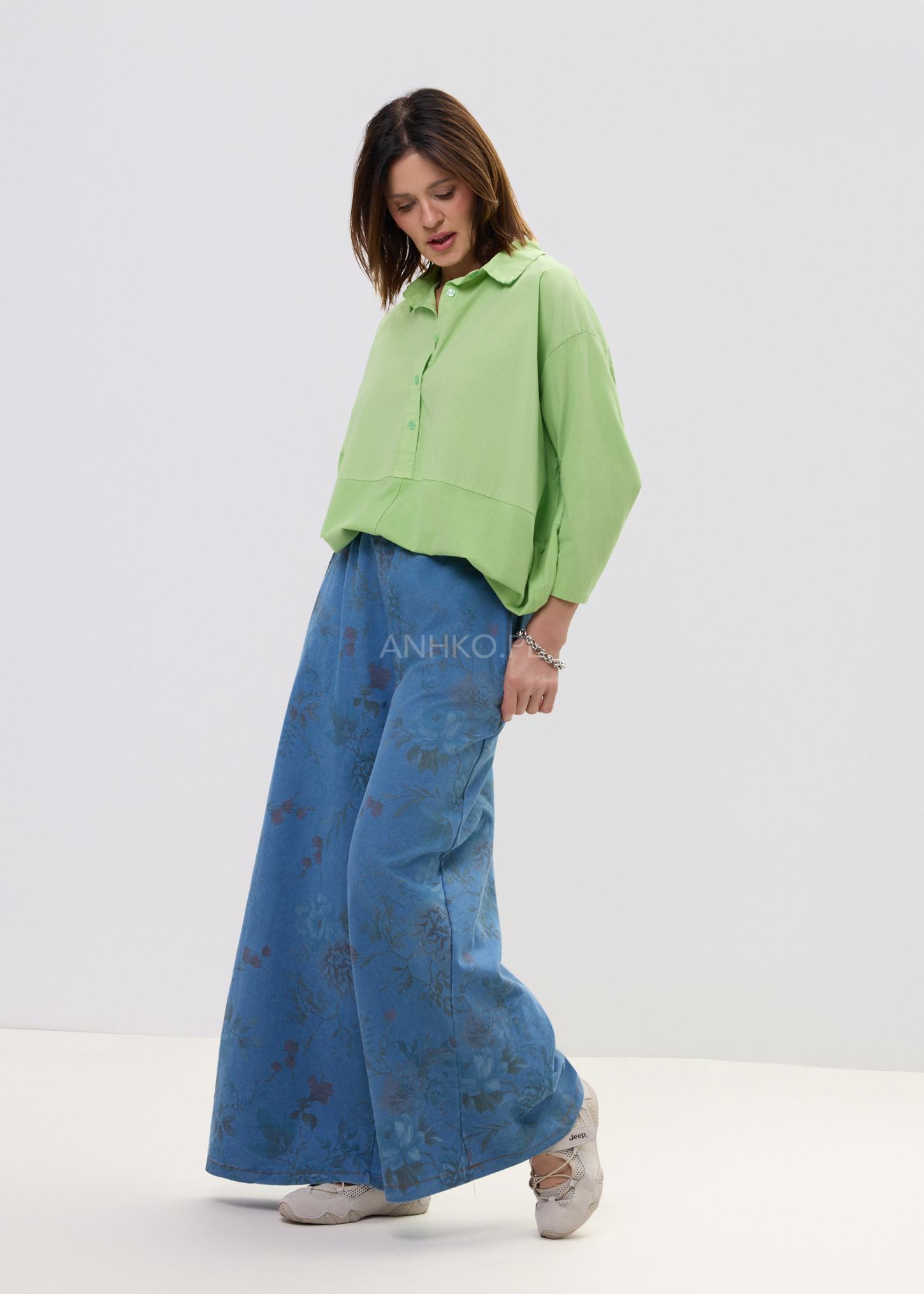 Spodnie Bordelin Niebieskie - Luźne spodnie w stylu denim z subtelnym, kwiatowym printem. Wygodna gumka w pasie i troczek sprawiają, że dopasowują się idealnie. Stylowe, lekkie i totalnie na luzie – idealne na co dzień.