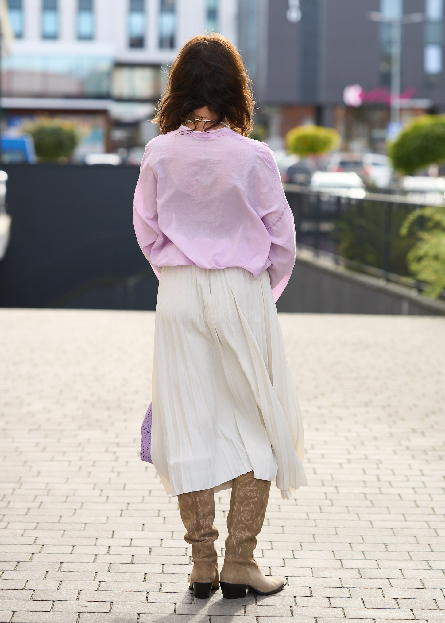 Spódnica Plisana Kremowa -Spódnica o długości midi, klasycznie plisowana, z elastyczną gumką w pasie to ponadczasowy i wygodny wybór na wiele okazji.