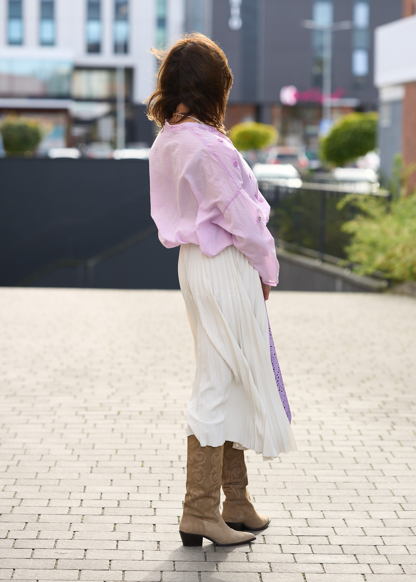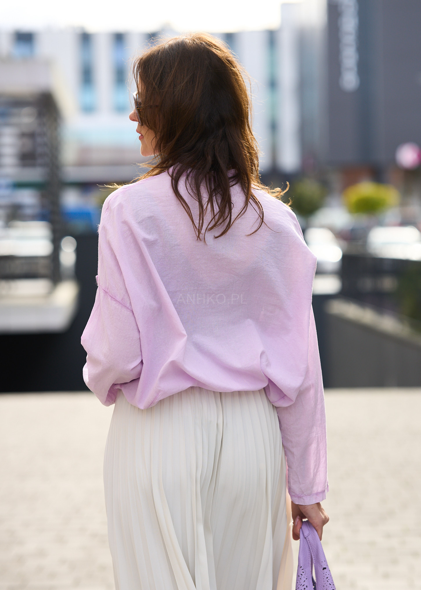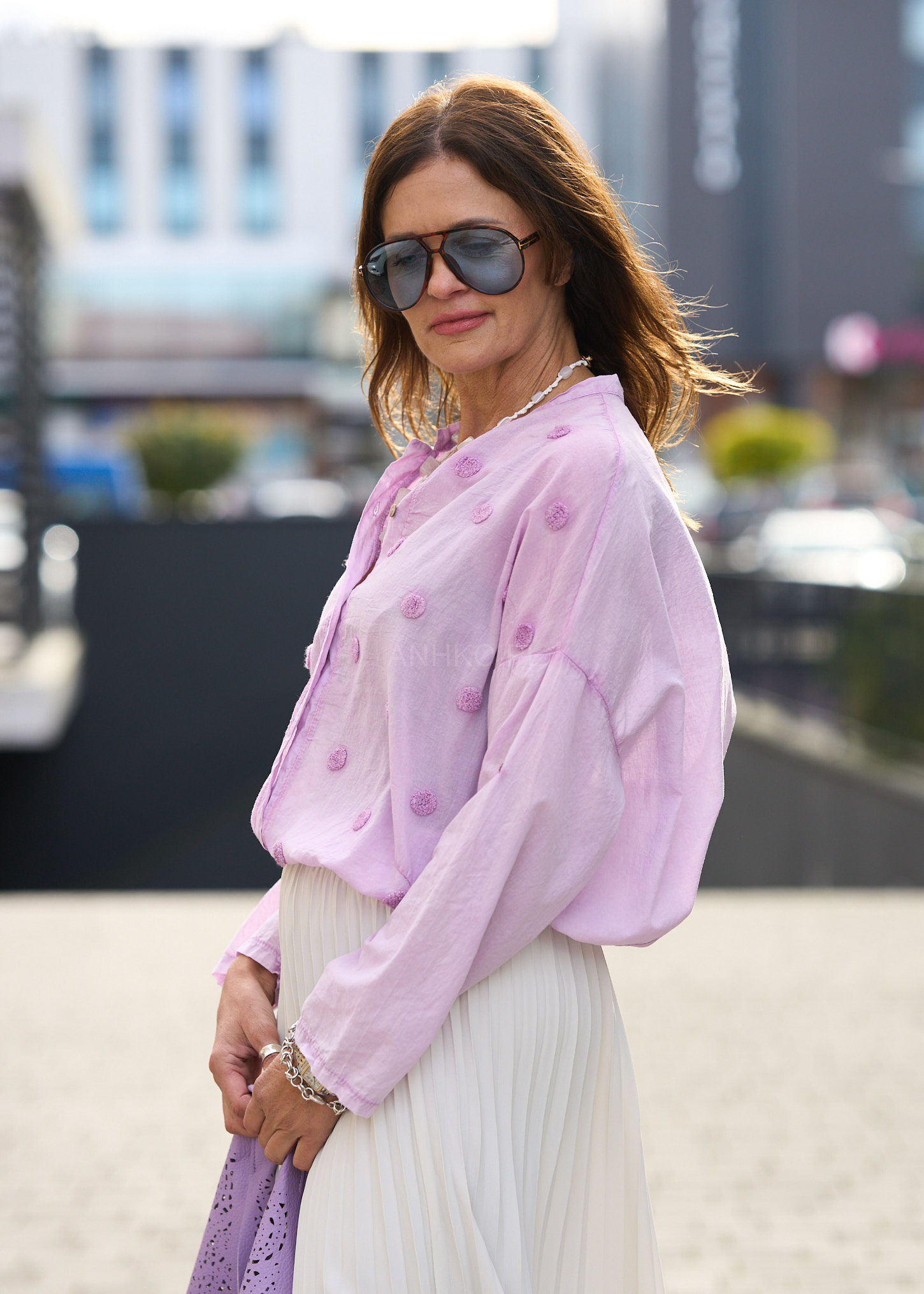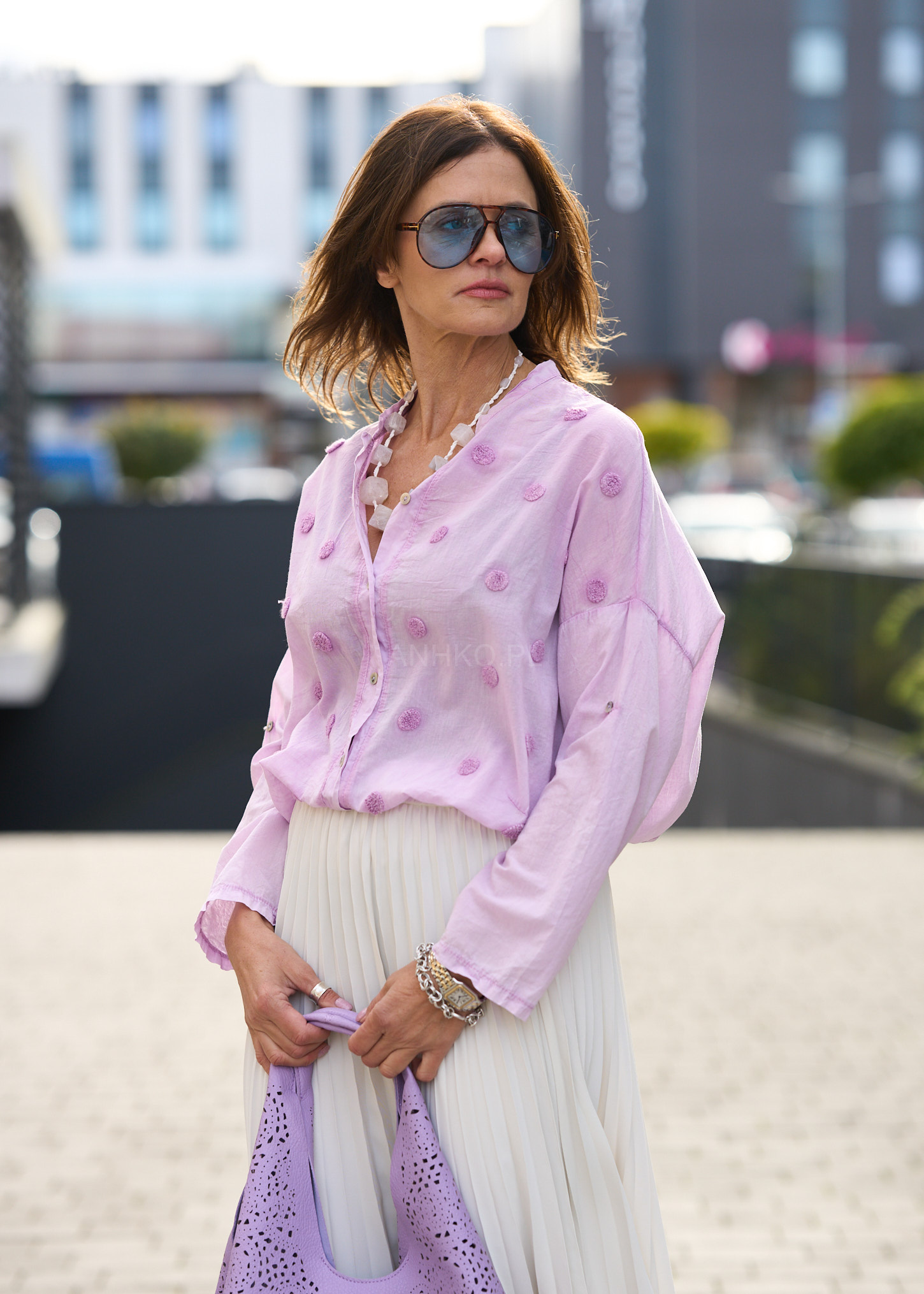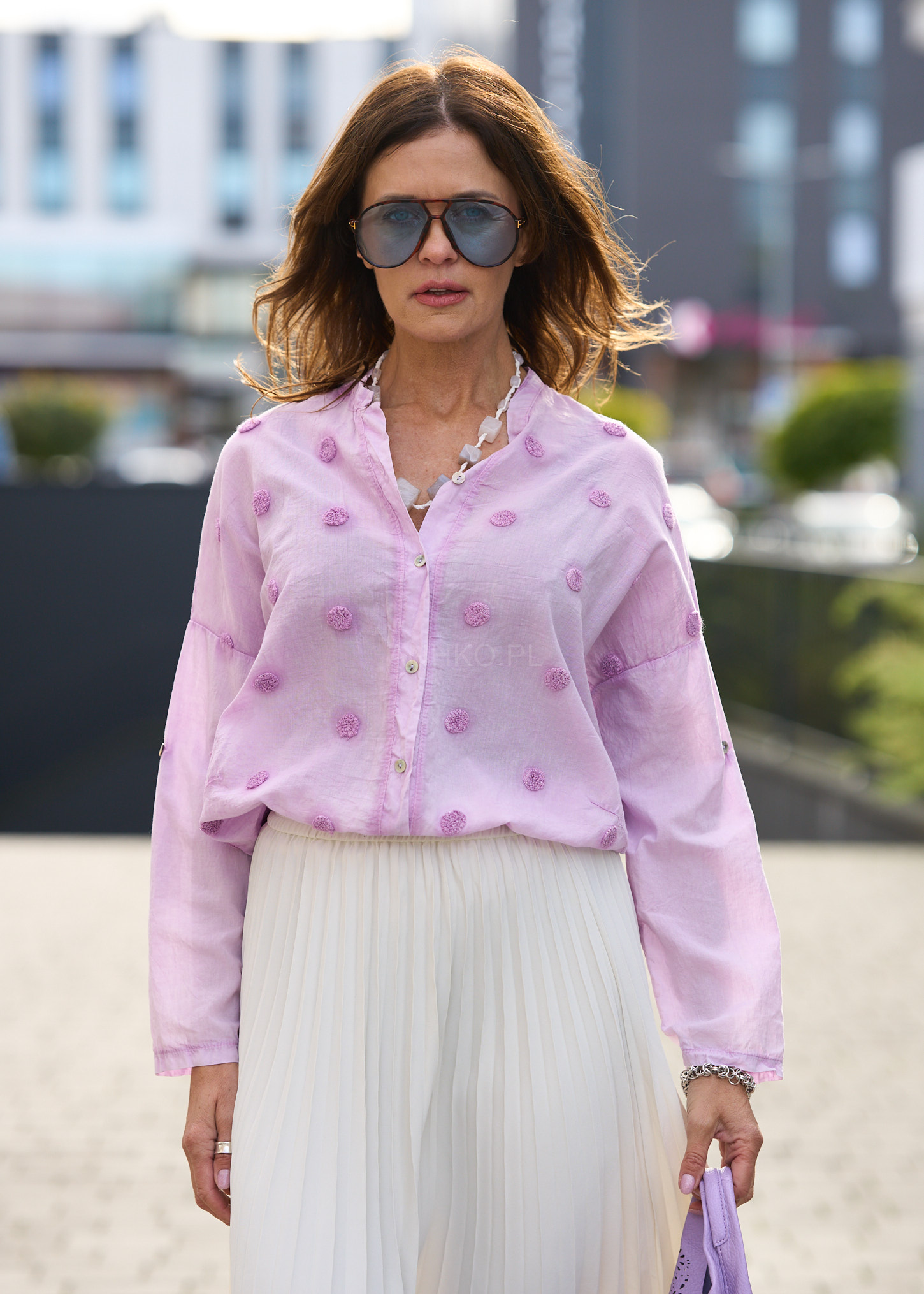 Delikatna, luźna liliowa bluzka z oryginalnymi, subtelnie wypukłymi kropkami to idealny wybór dla kobiet, które cenią stylowy wygląd i wygodę. Wykonana w 100% z lekkiej bawełny, bluzka zapewnia przewiewność i komfort nawet w cieplejsze dni. Model posiada zapięcie na guziki z przodu oraz rękawy o regulowanej długości, które można podwinąć i zapiąć na guzik, co sprawia, że bluzka jest niezwykle funkcjonalna. Okrągły dekolt i luźny krój sprawiają, że bluzka świetnie prezentuje się zarówno z jeansami, jak i spódnicami, tworząc niezobowiązujący, ale elegancki look.