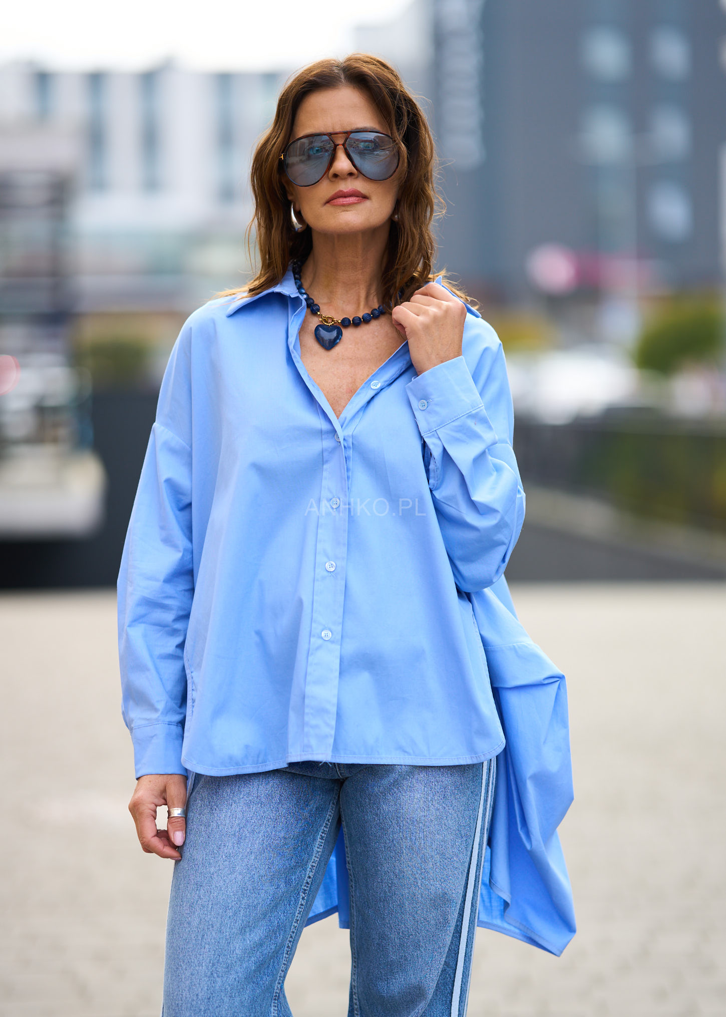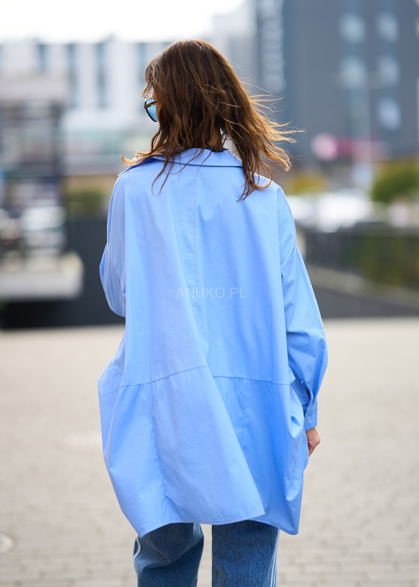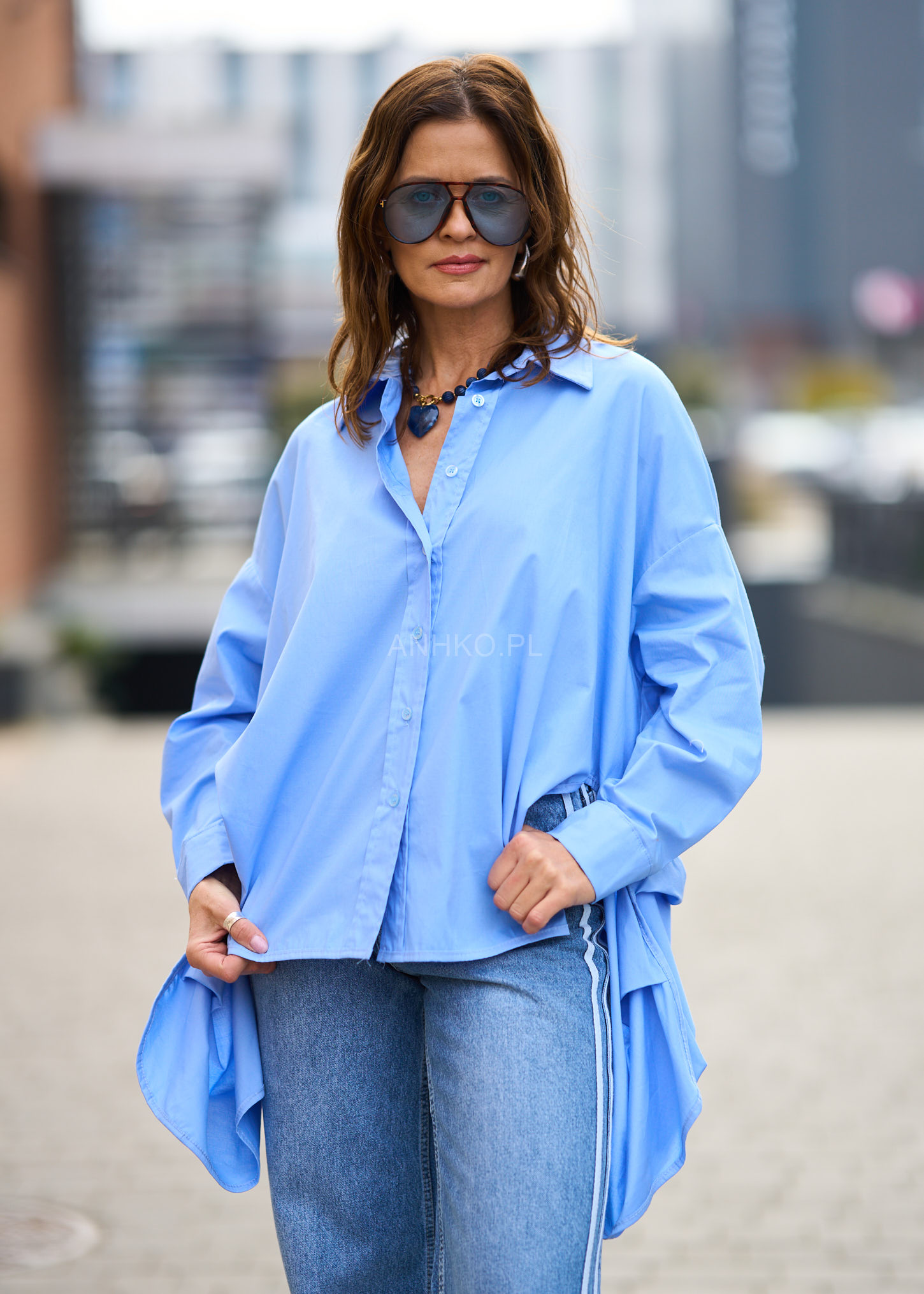Koszula, która łączy luz, wygodę i modowy charakter. Jej oversize’owy krój z wyraźnie wydłużonym tyłem pięknie układa się na sylwetce, dodając lookowi lekkości i nowoczesności. Klasyczny kołnierzyk oraz zapinany front nadają jej ponadczasowego stylu, a jasnobłękitny odcień sprawia, że koszula świetnie komponuje się z denimem, bielą i neutralnymi barwami. To doskonały wybór na codzienne wyjścia, miejskie spacery, luźne spotkania czy smart-casualowe zestawy. Możesz nosić ją zarówno luźno, jak i wpuszczoną częściowo w spodnie, tworząc modny, niewymuszony look.