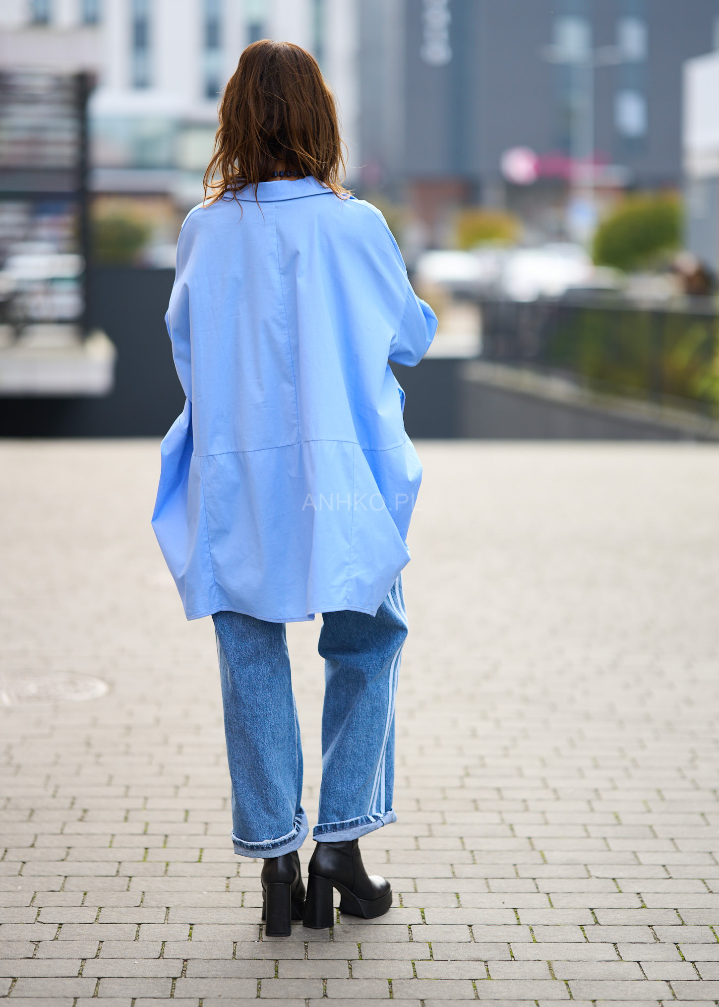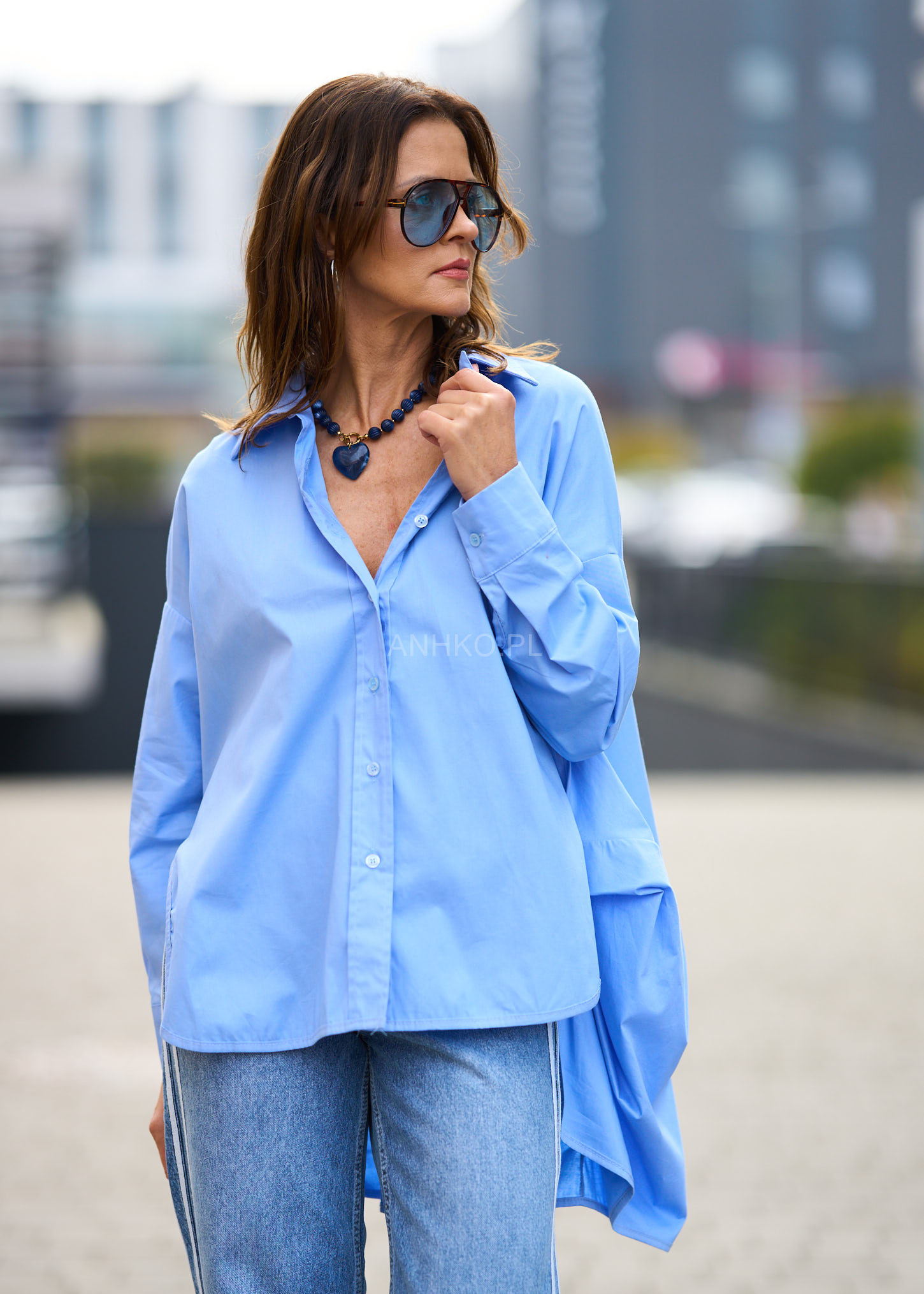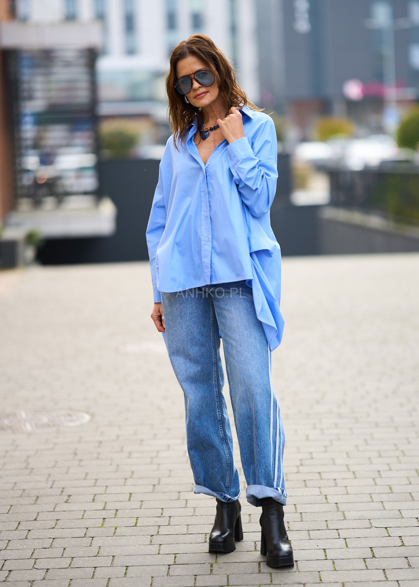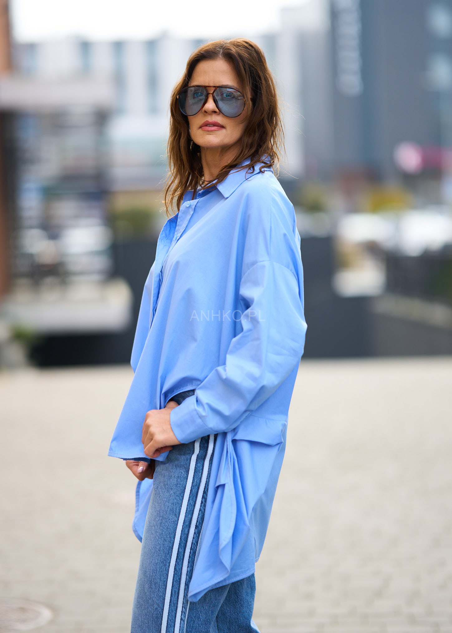Koszula, która łączy luz, wygodę i modowy charakter. Jej oversize’owy krój z wyraźnie wydłużonym tyłem pięknie układa się na sylwetce, dodając lookowi lekkości i nowoczesności. Klasyczny kołnierzyk oraz zapinany front nadają jej ponadczasowego stylu, a jasnobłękitny odcień sprawia, że koszula świetnie komponuje się z denimem, bielą i neutralnymi barwami. To doskonały wybór na codzienne wyjścia, miejskie spacery, luźne spotkania czy smart-casualowe zestawy. Możesz nosić ją zarówno luźno, jak i wpuszczoną częściowo w spodnie, tworząc modny, niewymuszony look.