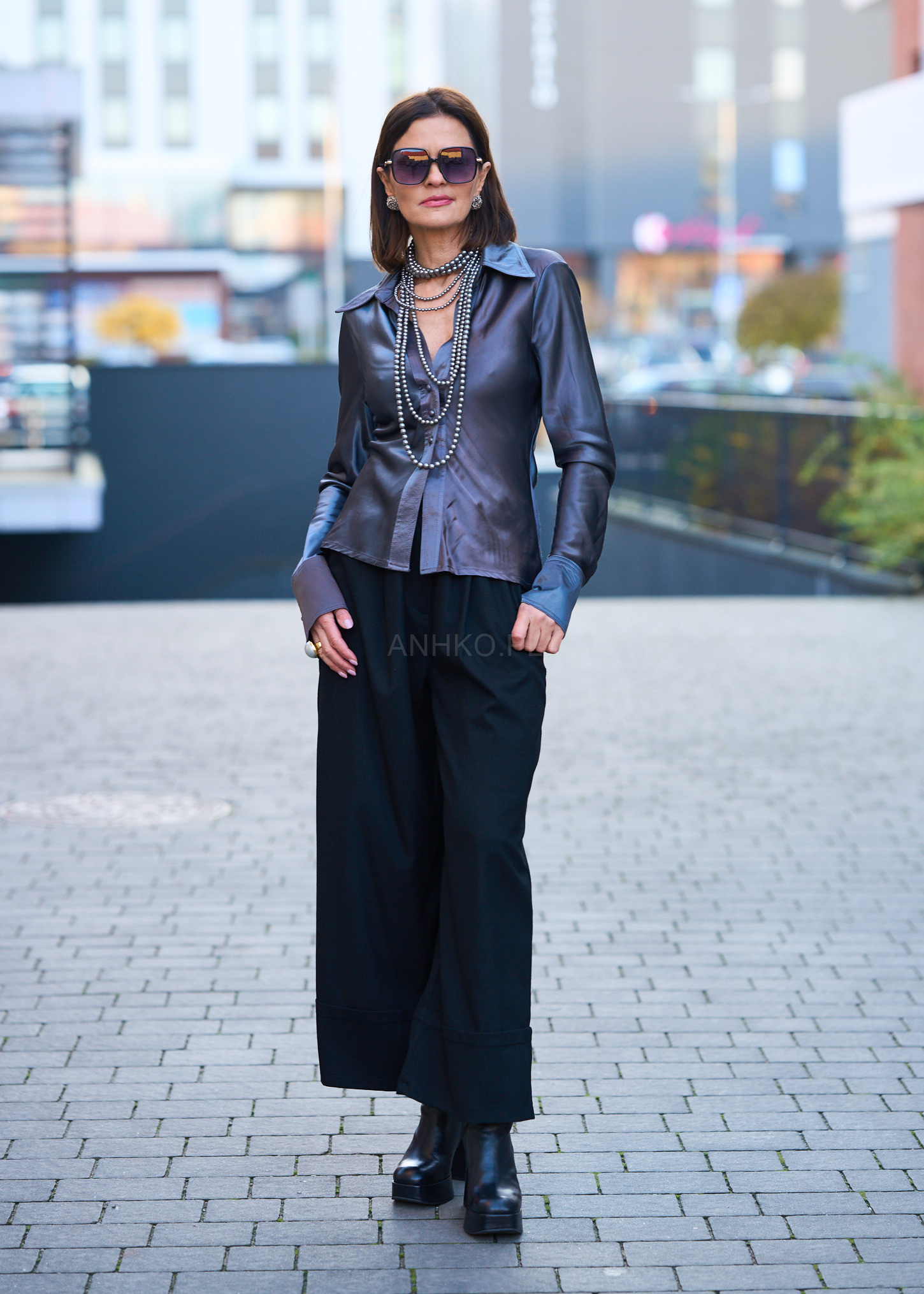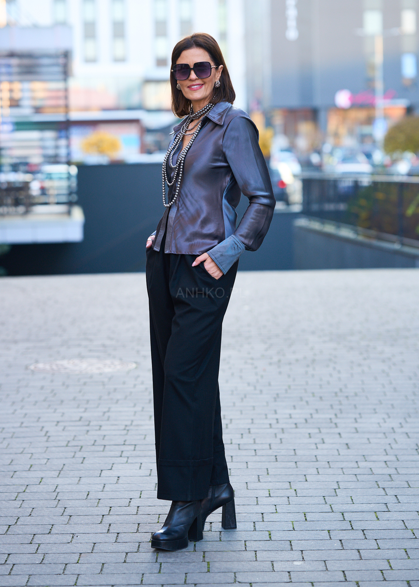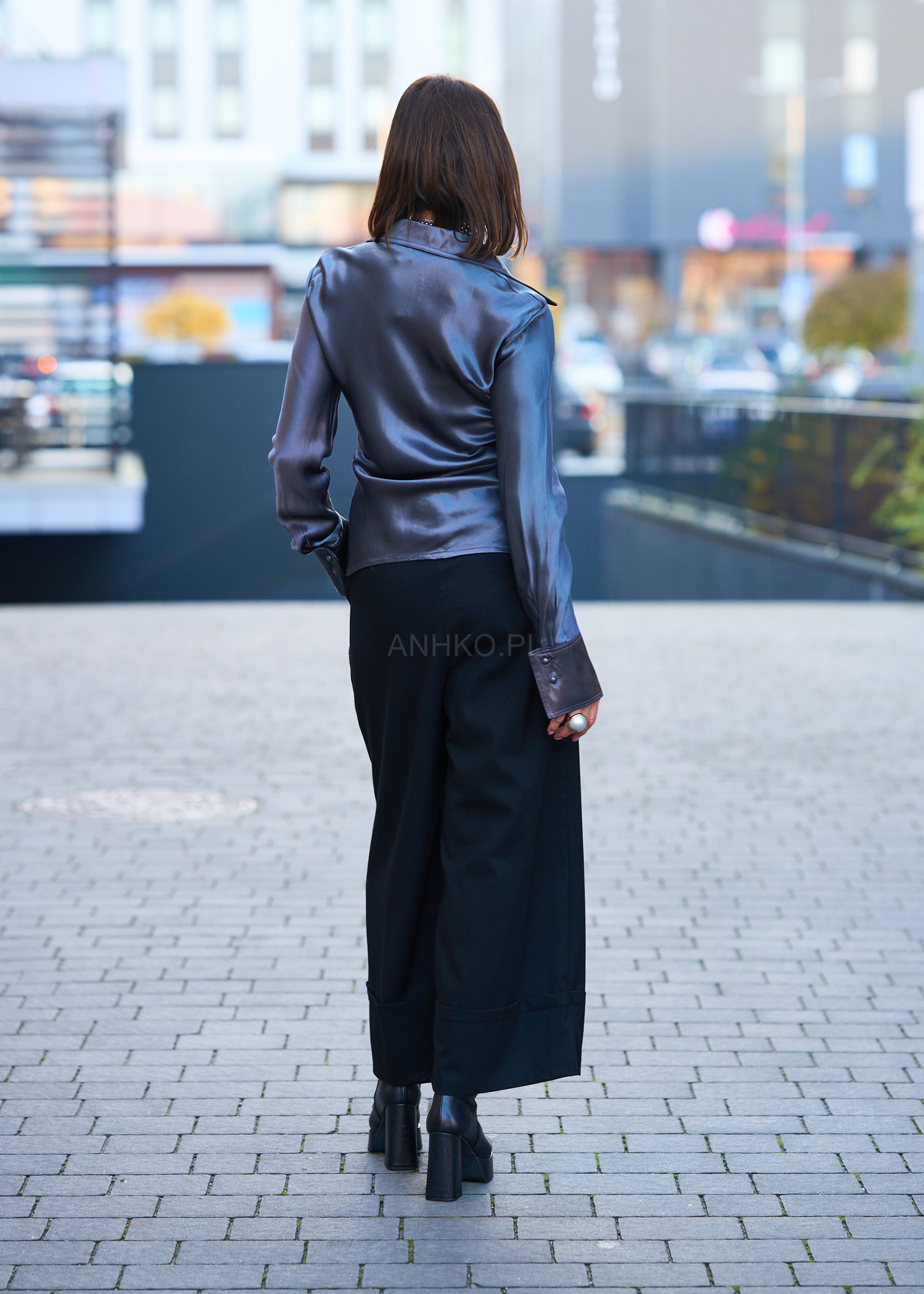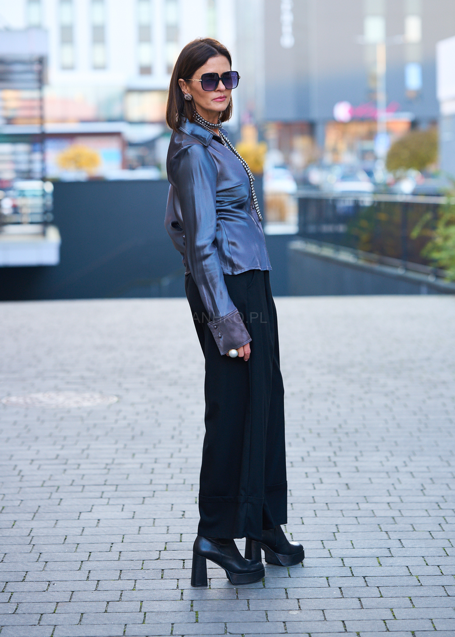 Elegancka koszula satynowa w odcieniu szarości. Koszula zapinana jest na 3 ozdobne guziki. Ta koszula stanowi idealne uzupełnienie dla spodni z kompletu Nova, tworząc kompletny i stylowy zestaw, doskonały na bardziej formalne okazje, doskonale się sprawdzi również na co dzień.