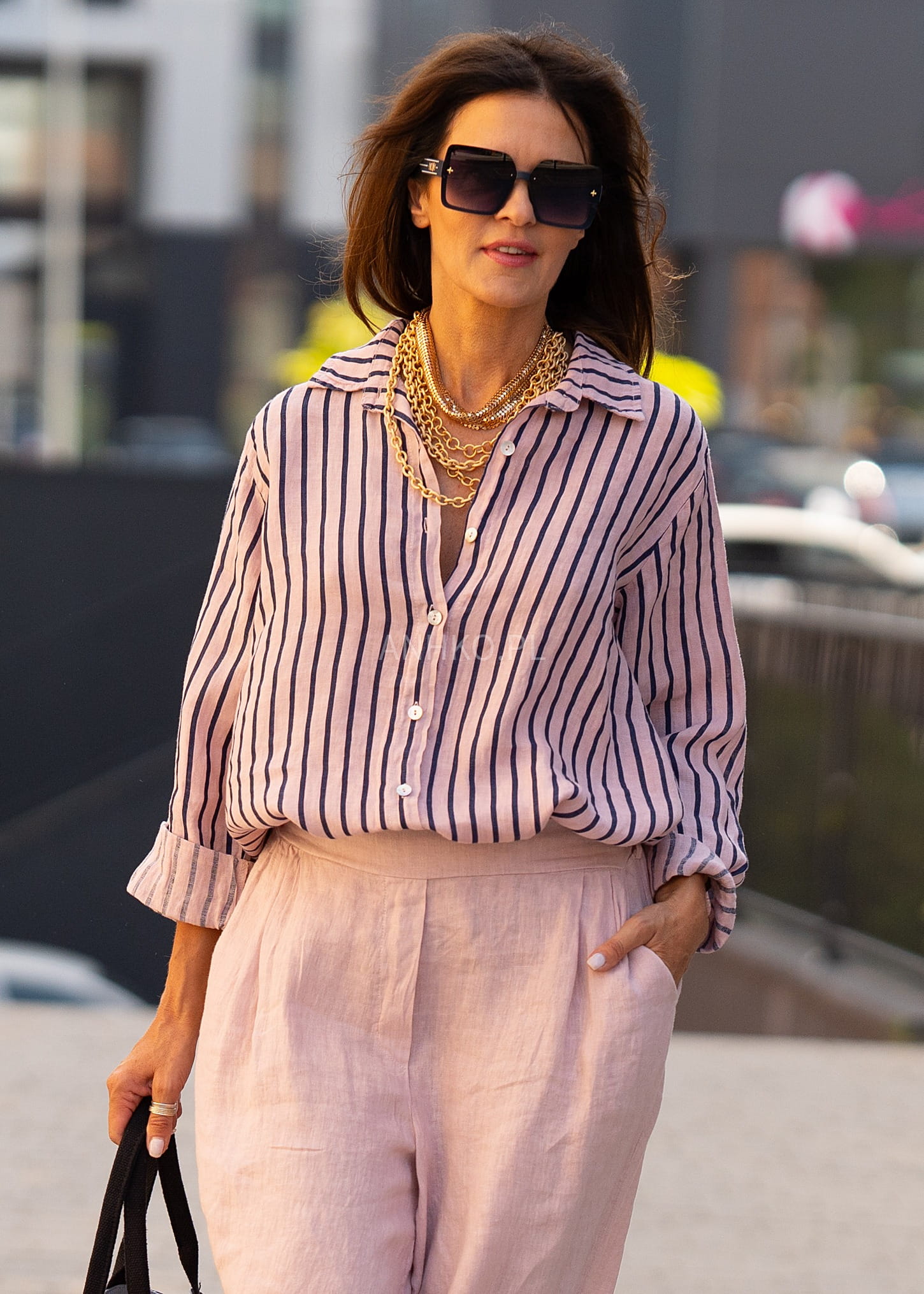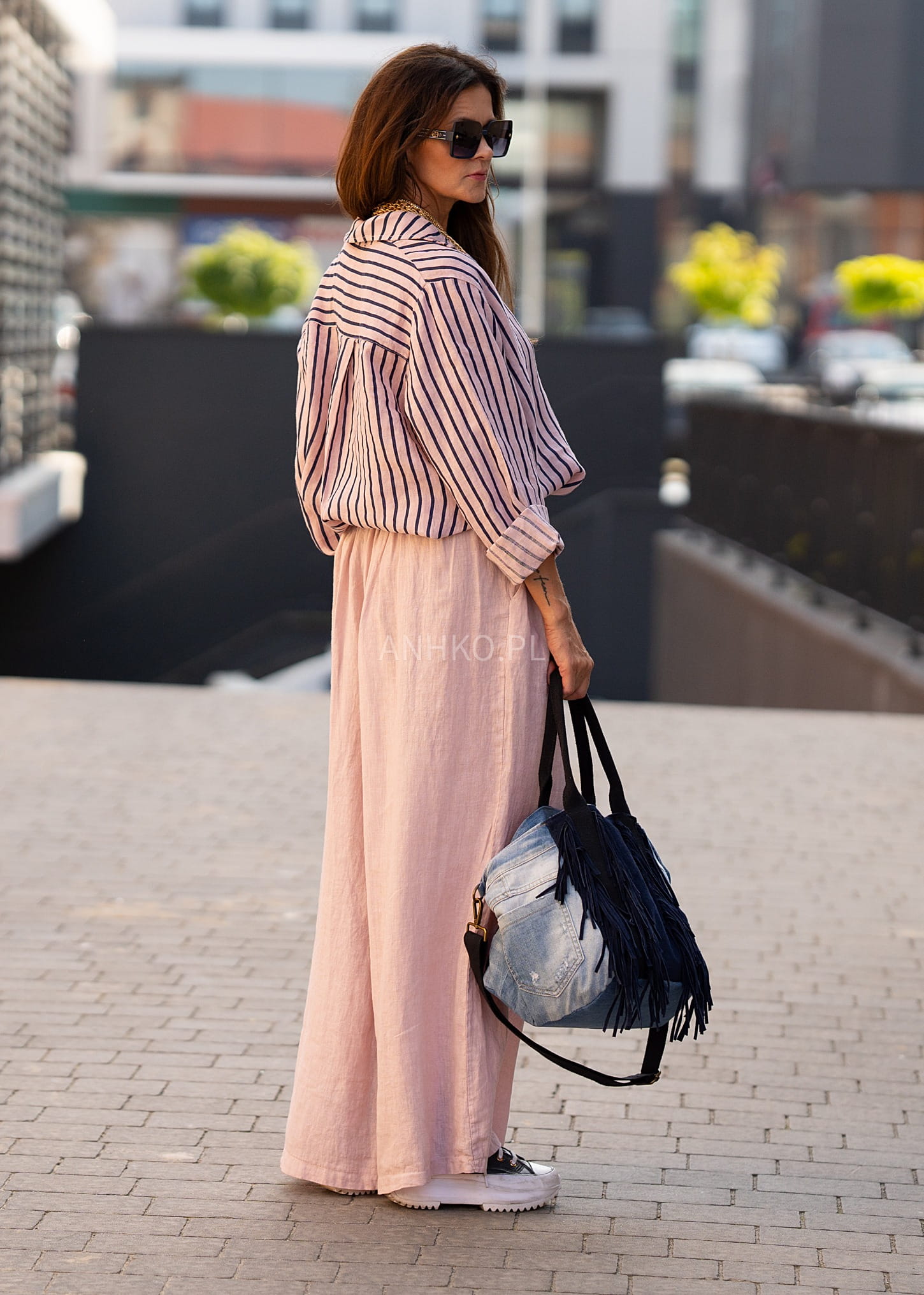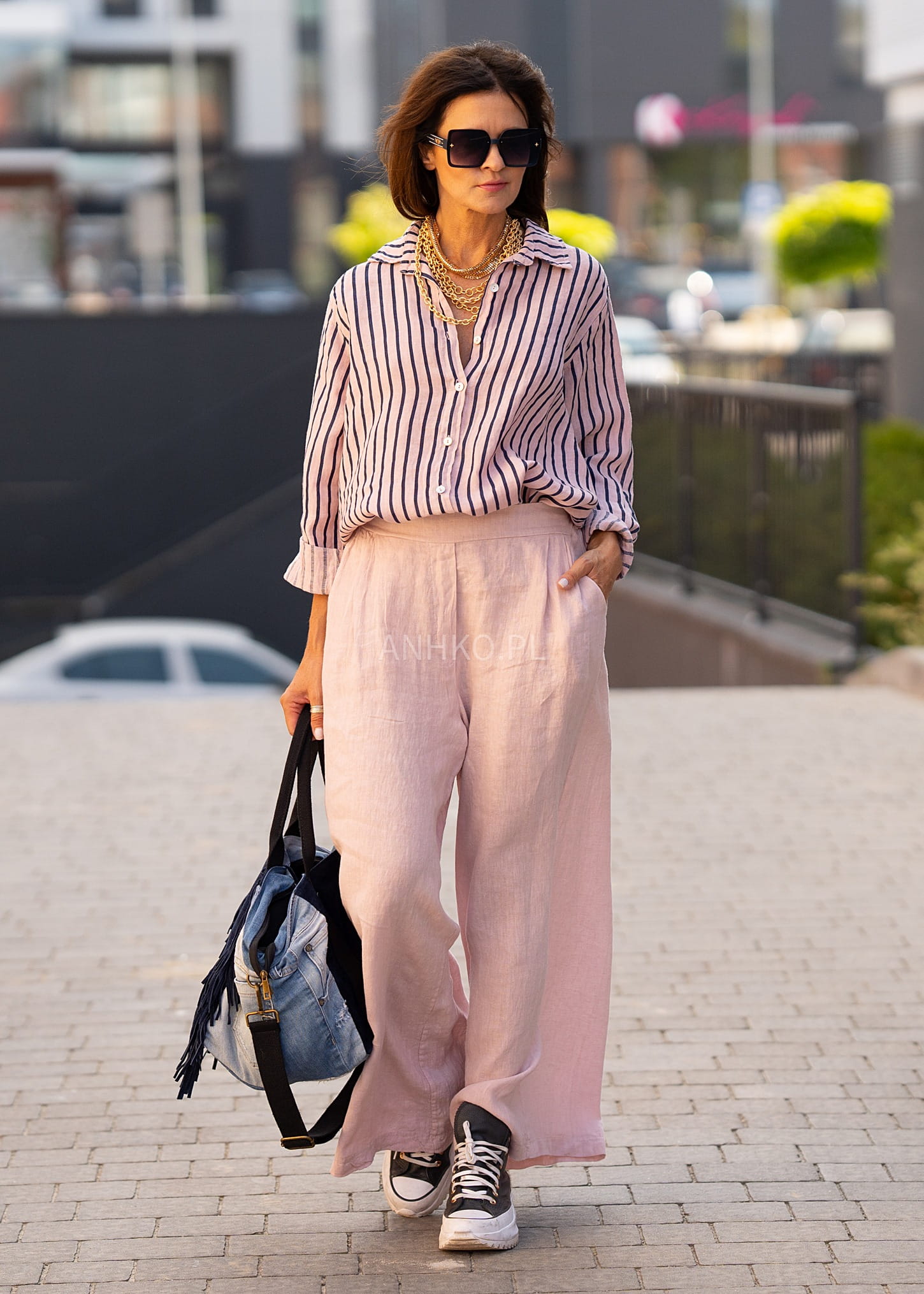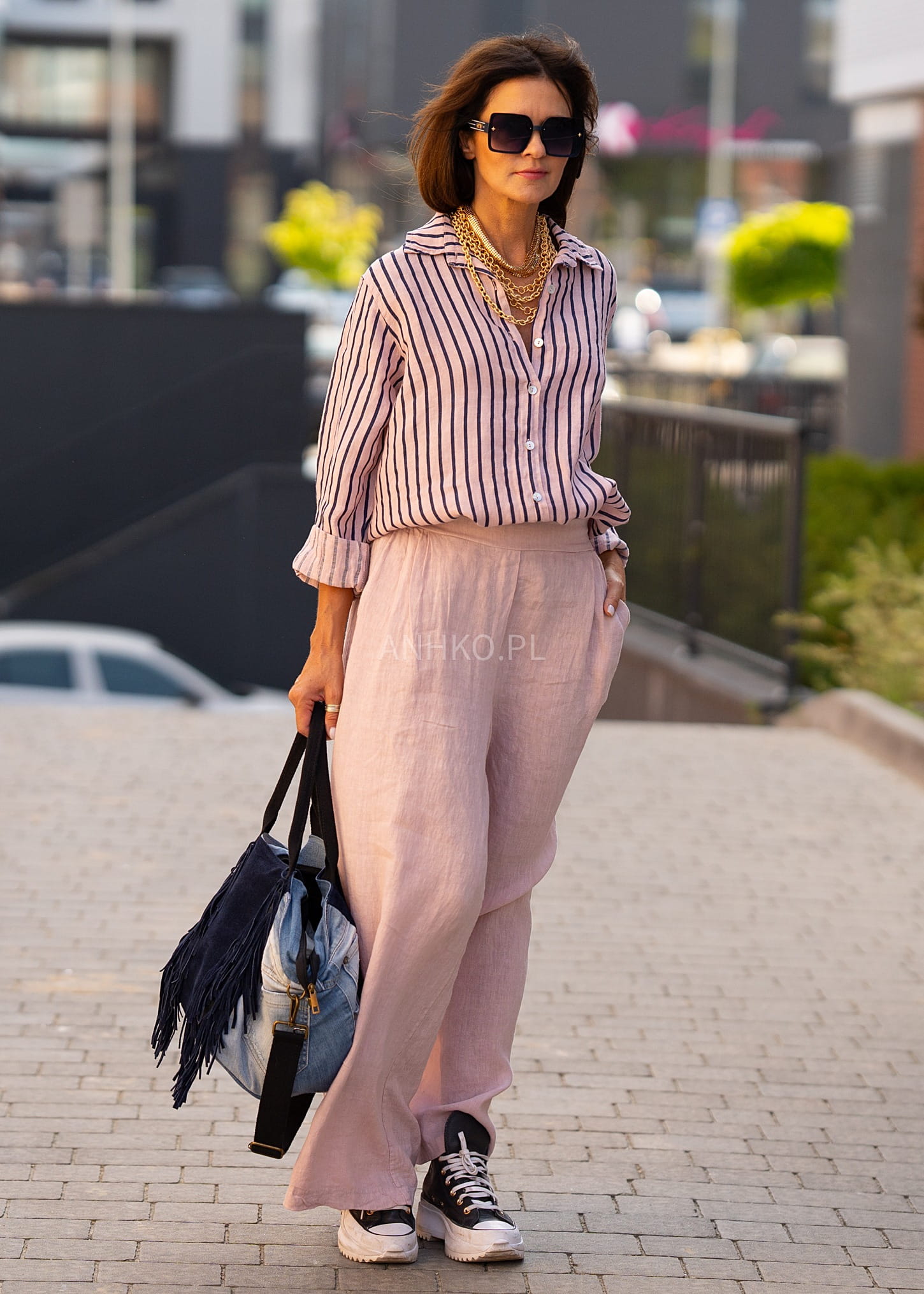 - Wzór: Pionowe paski optycznie wydłużające sylwetkę.