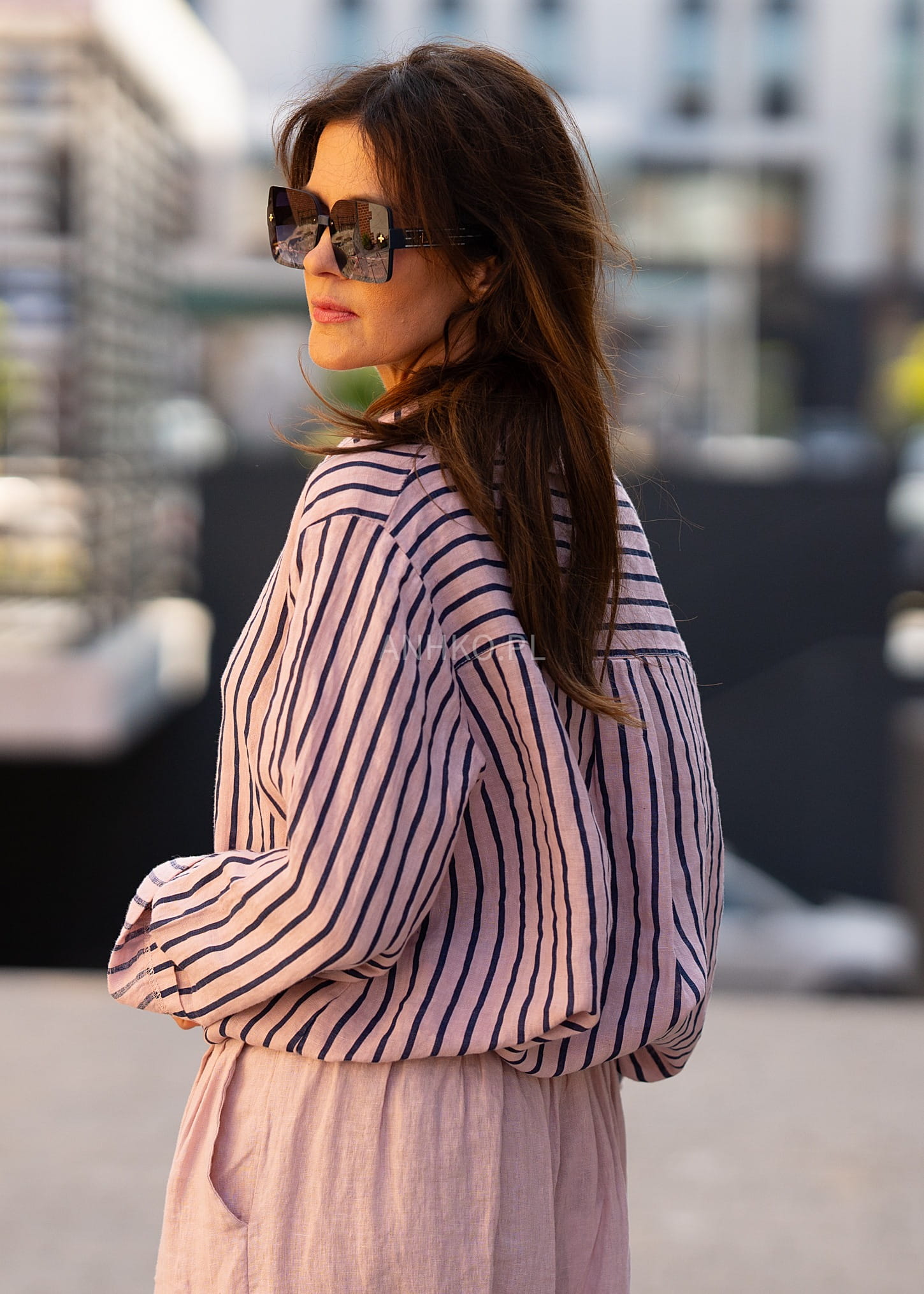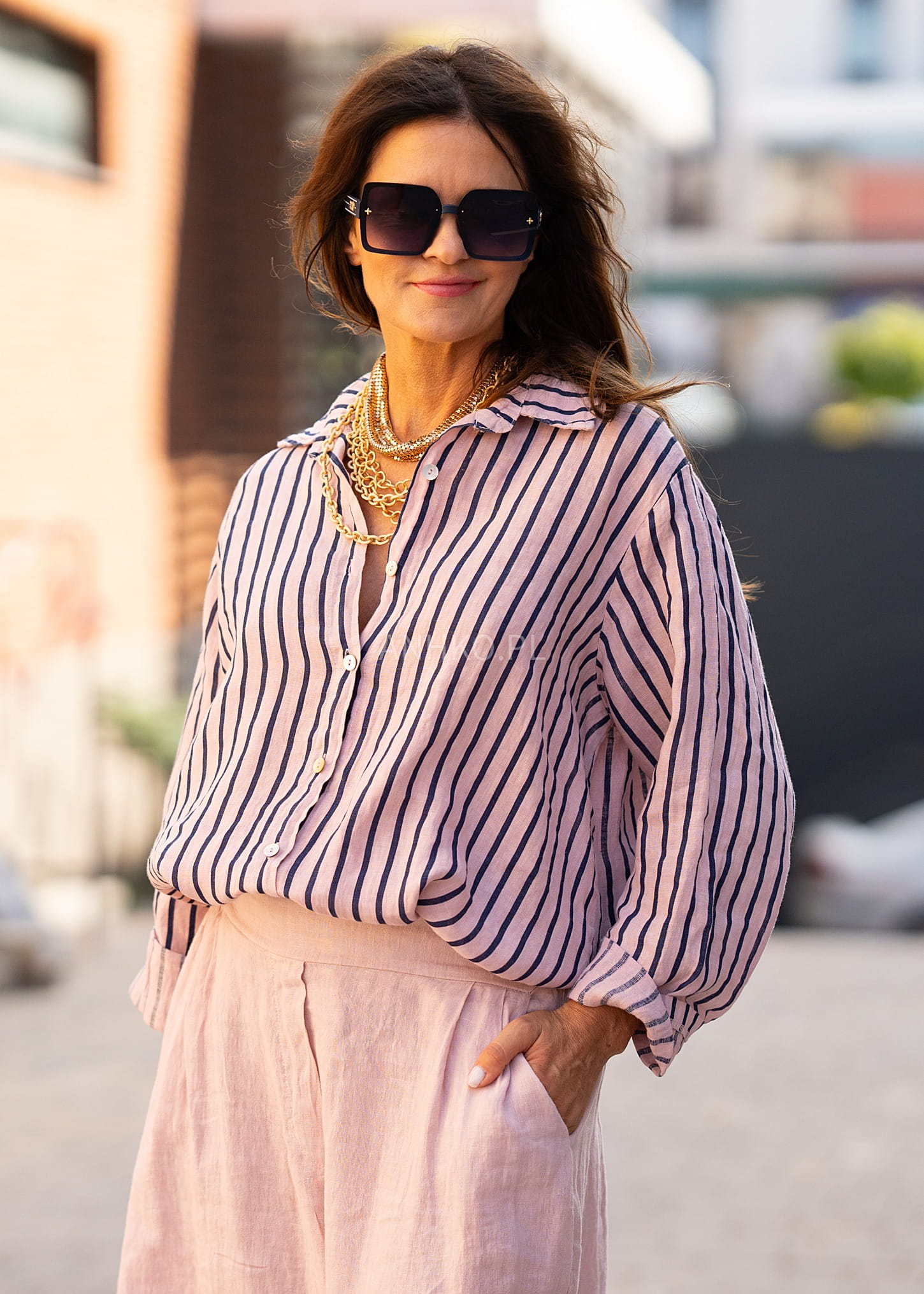 Ta lniana koszula damska o swobodnym kroju miękko układa się na sylwetce, tworząc efekt niewymuszonej elegancji. Delikatnie opuszczona linia ramion oraz luźniejszy fason zapewniają komfort noszenia i naturalny ruch materiału. Pionowe paski optycznie wysmuklają sylwetkę, nadając całości lekkości i stylowego charakteru.
