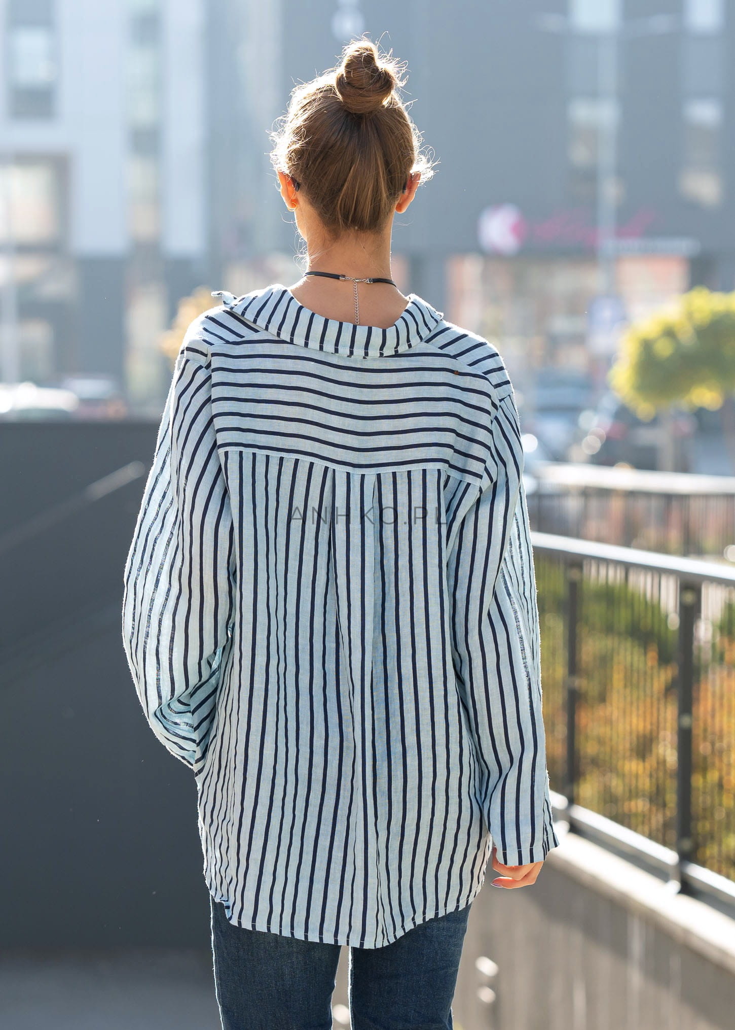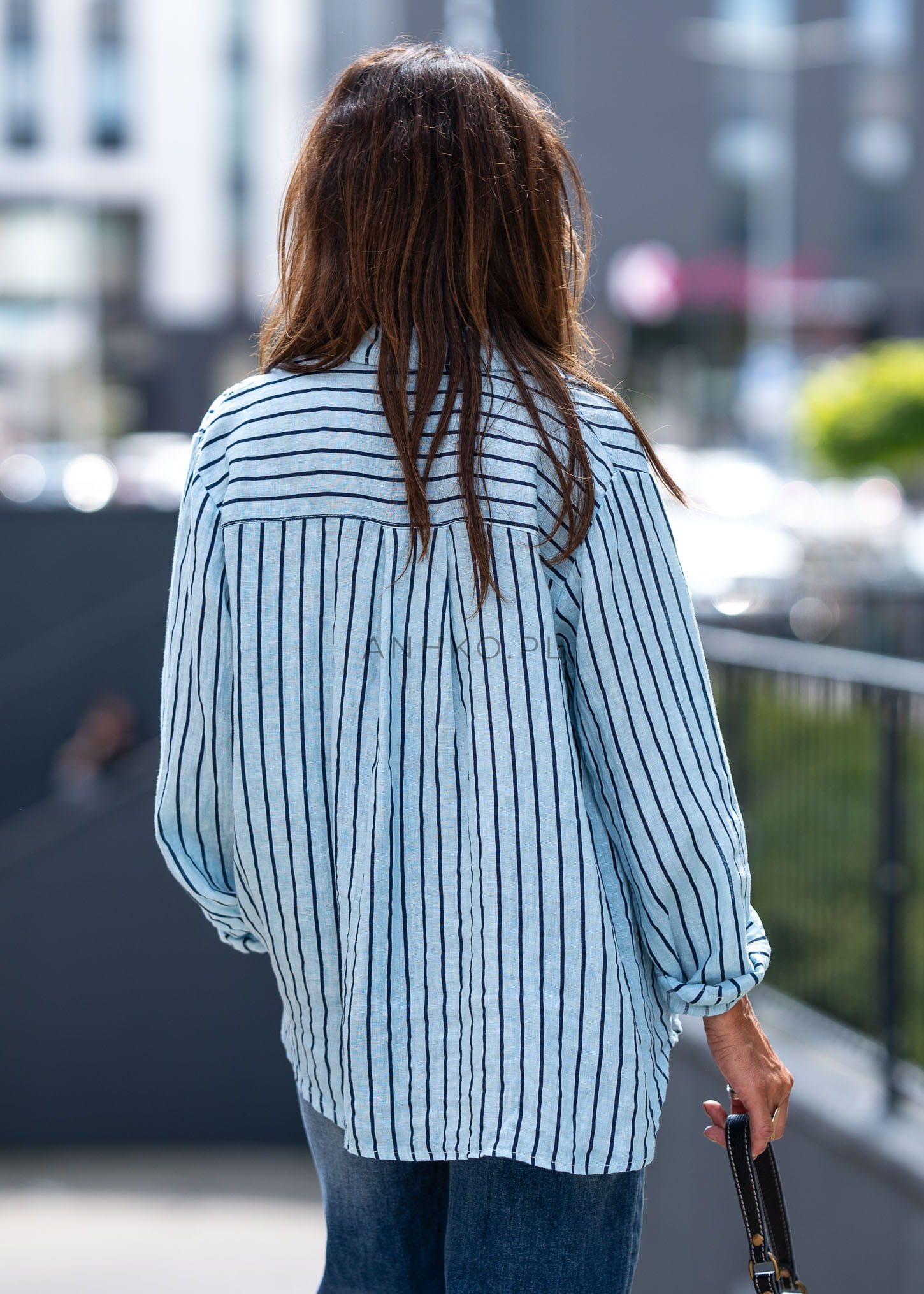 Ta lniana koszula damska o luźnym kroju subtelnie układa się na sylwetce, tworząc efekt lekkiego, naturalnego ruchu materiału. Opuszczona linia ramion oraz oversize’owy fason zapewniają wygodę noszenia i swobodny charakter stylizacji, a pionowe paski optycznie wysmuklają sylwetkę.