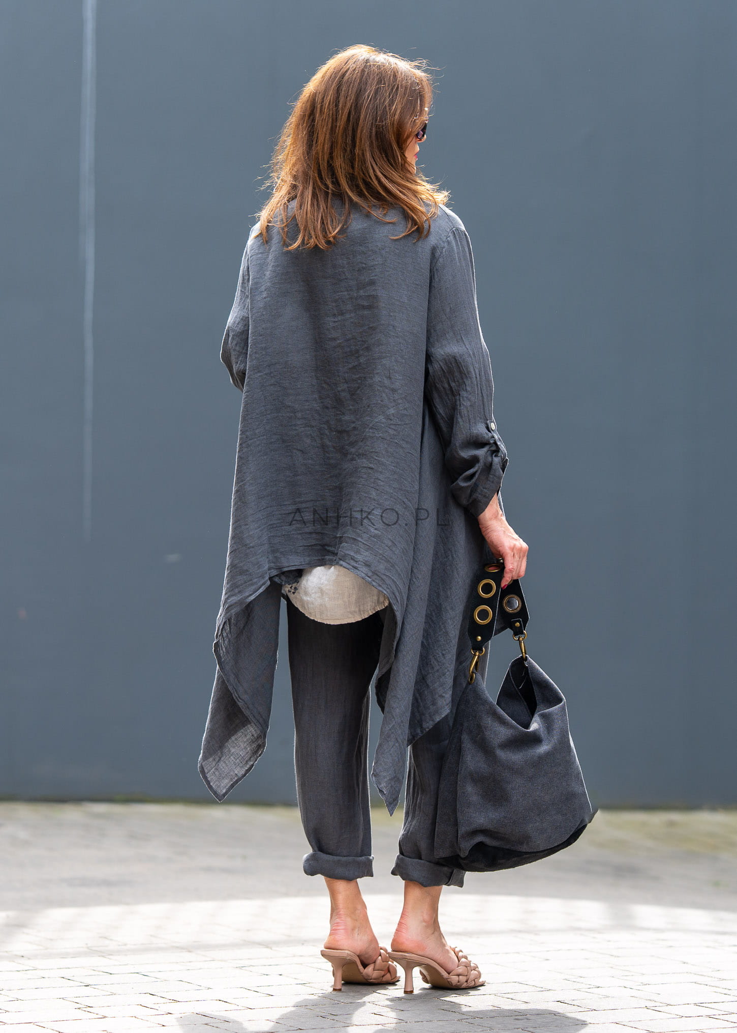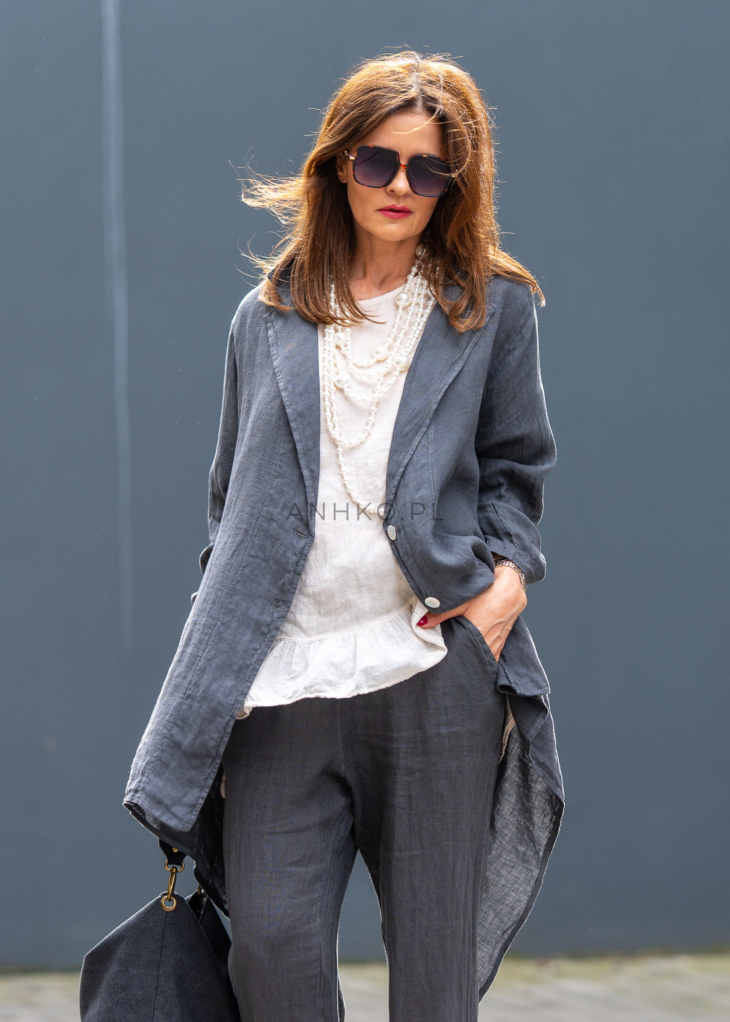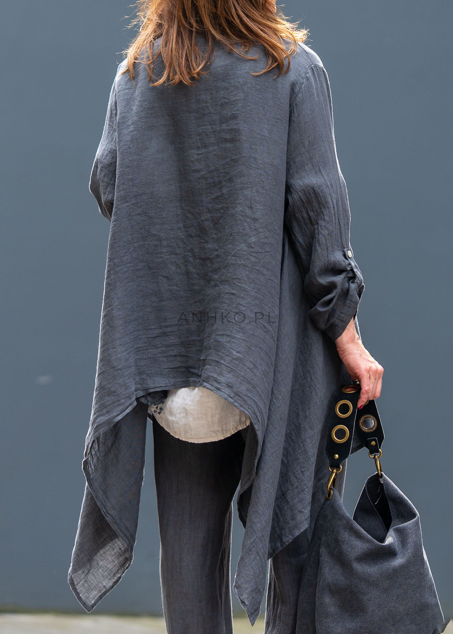 Ta lniana marynarka damska miękko układa się na sylwetce, tworząc efekt lekkiej, otulającej warstwy. Asymetryczny dół, luźny fason i wydłużona linia sprawiają, że model prezentuje się niezwykle nowocześnie, a przy tym daje pełną swobodę ruchów. Antracytowy odcień podkreśla jego ponadczasowy charakter i świetnie wpisuje się w garderobę opartą na jakościowych bazach.