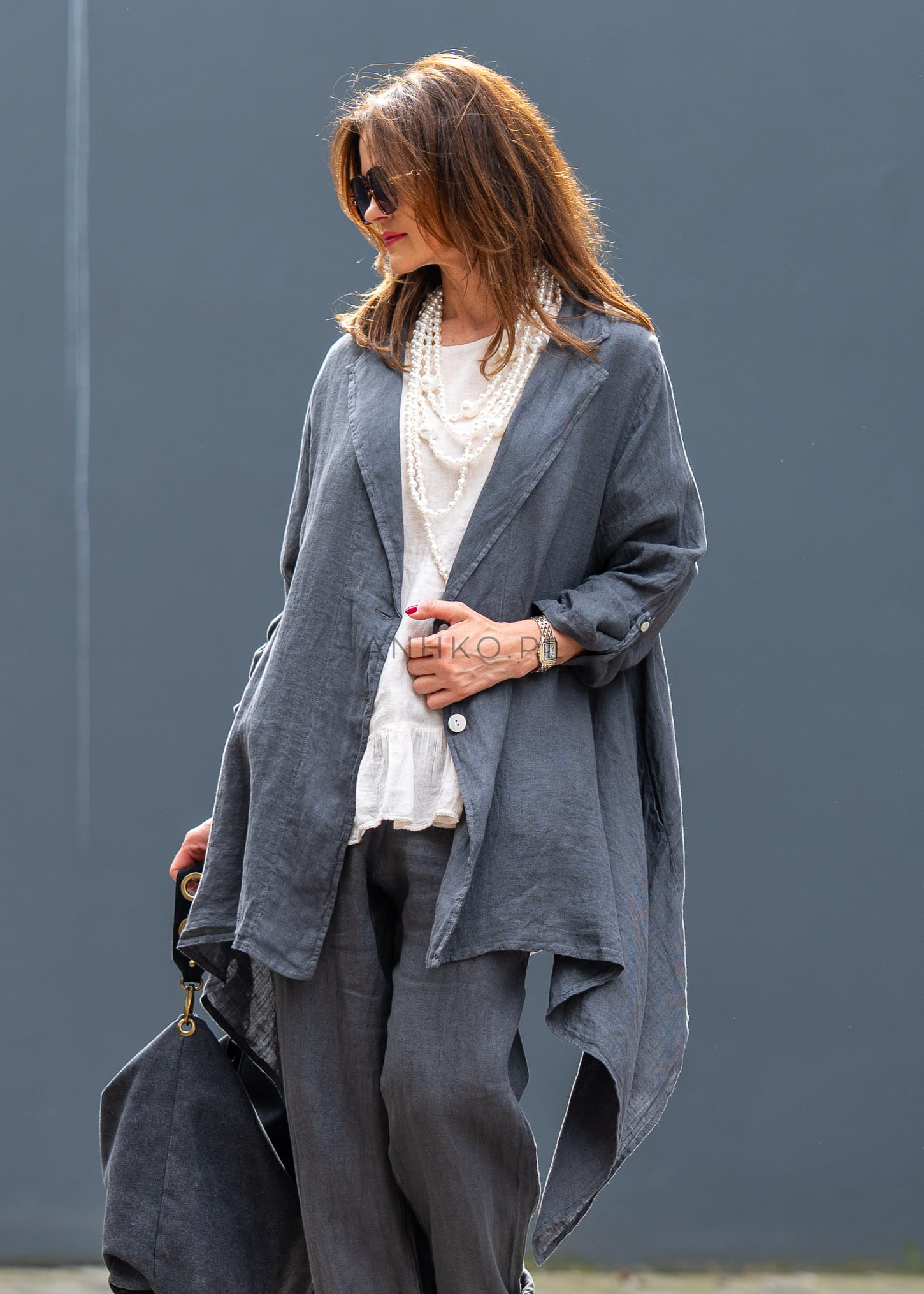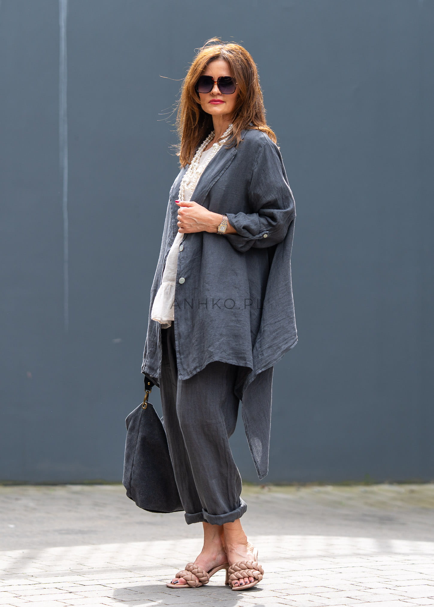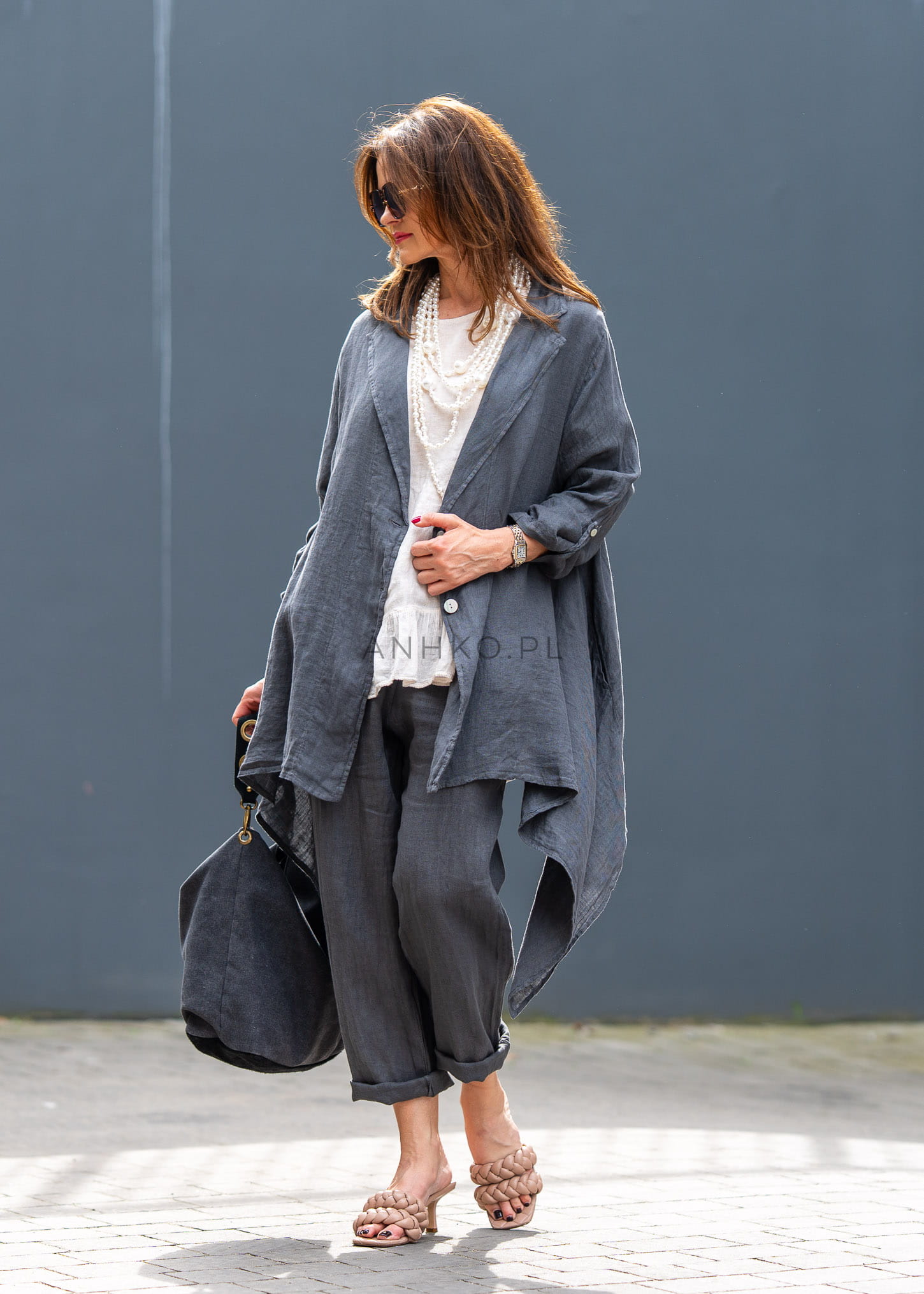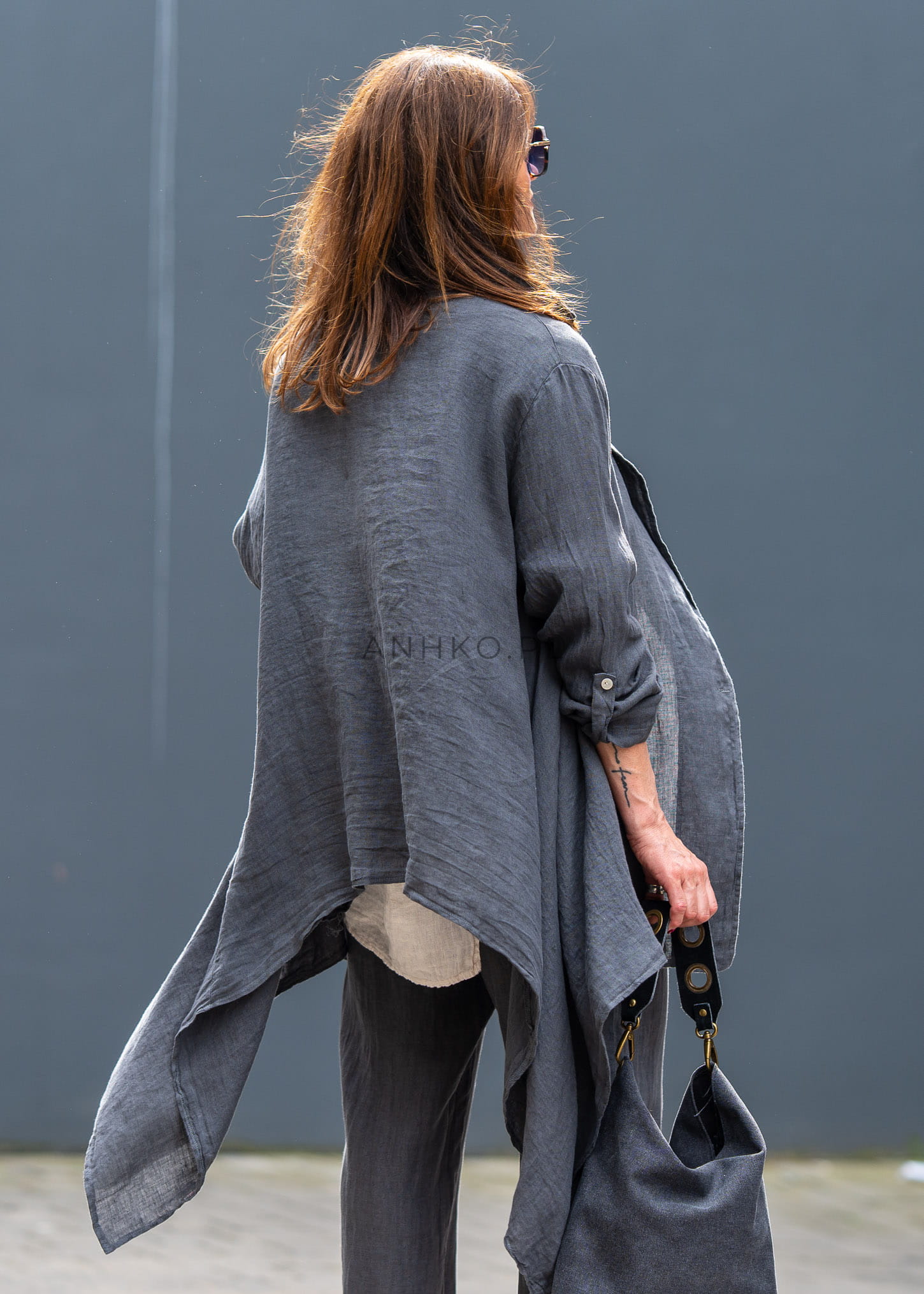 Ta lniana marynarka damska miękko układa się na sylwetce, tworząc efekt lekkiej, otulającej warstwy. Asymetryczny dół, luźny fason i wydłużona linia sprawiają, że model prezentuje się niezwykle nowocześnie, a przy tym daje pełną swobodę ruchów. Antracytowy odcień podkreśla jego ponadczasowy charakter i świetnie wpisuje się w garderobę opartą na jakościowych bazach.