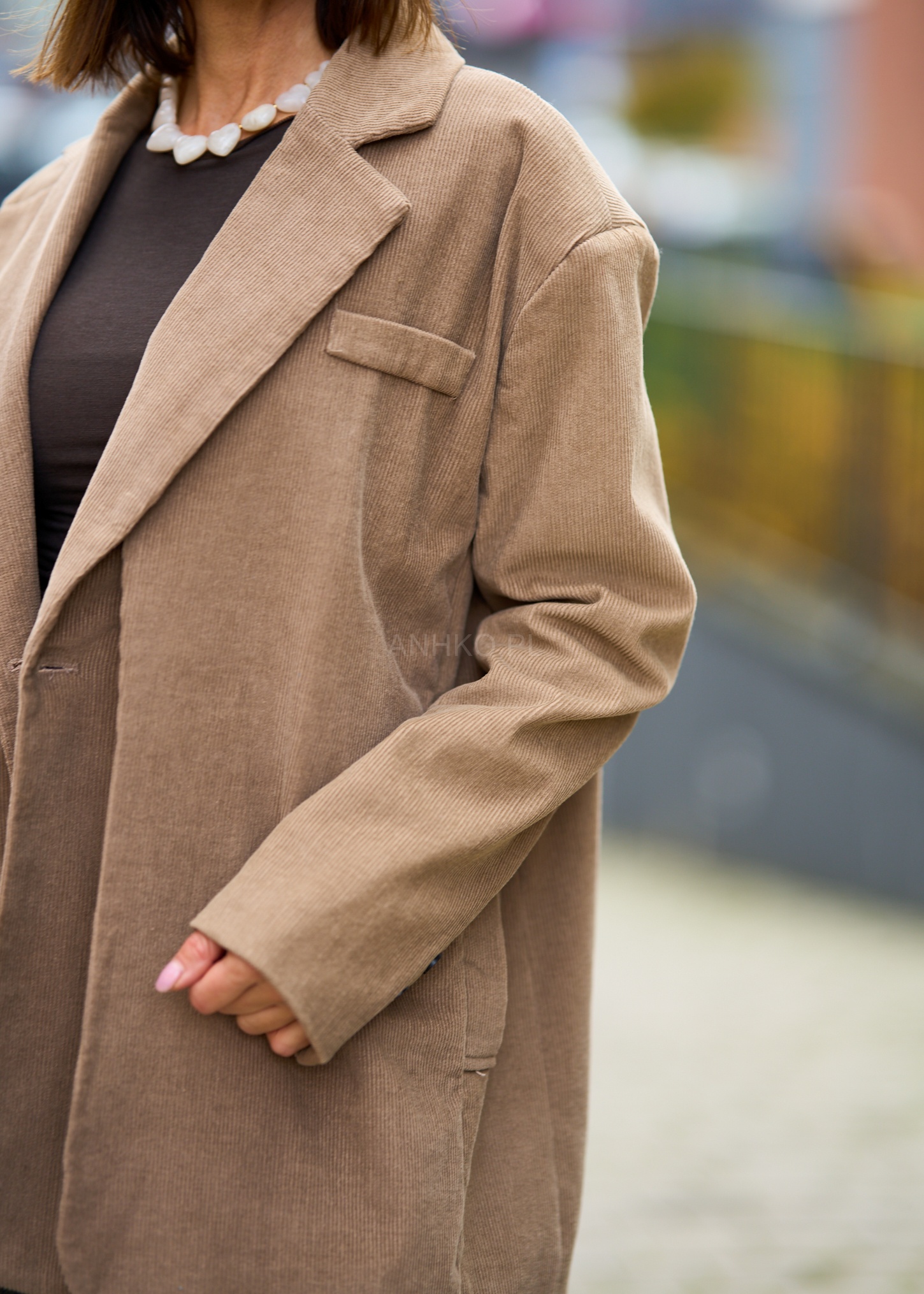 To połączenie ponadczasowej elegancji i komfortu. Wykonany w 100% z miękkiej bawełny o strukturze sztruksu, zapewnia wygodę oraz trwałość na lata. Posiada klasyczny kołnierz z klapami, zapinanie na jeden guzik oraz dwie kieszenie z klapami i jedną ozdobną na piersi. Wnętrze wykończone jest gładką, przyjemną w dotyku podszewką, co gwarantuje idealne ułożenie na sylwetce. Model ten świetnie sprawdzi się do pracy, na spotkania lub eleganckie wyjścia. W połączeniu z jeansami tworzy swobodny, modny look, a z cygaretkami – ponadczasową stylizację smart casual.