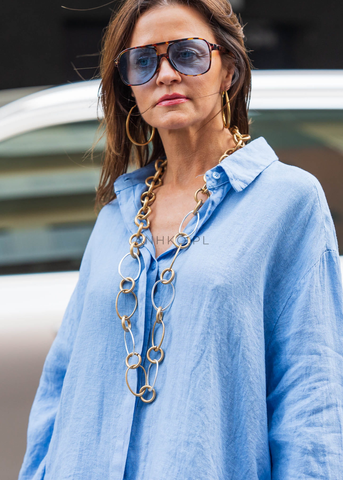 Masywny łańcuch z owalnymi elementami i przedłużeniem to elegancki dodatek biżuteryjny. Kolor złoty nadaje mu klasyki, a owalne elementy dodają mu subtelnego wyrazu. To uniwersalny i ponadczasowy element biżuterii, który można nosić samodzielnie lub łączyć z innymi dodatkami. Zapinany na karabińczyk.