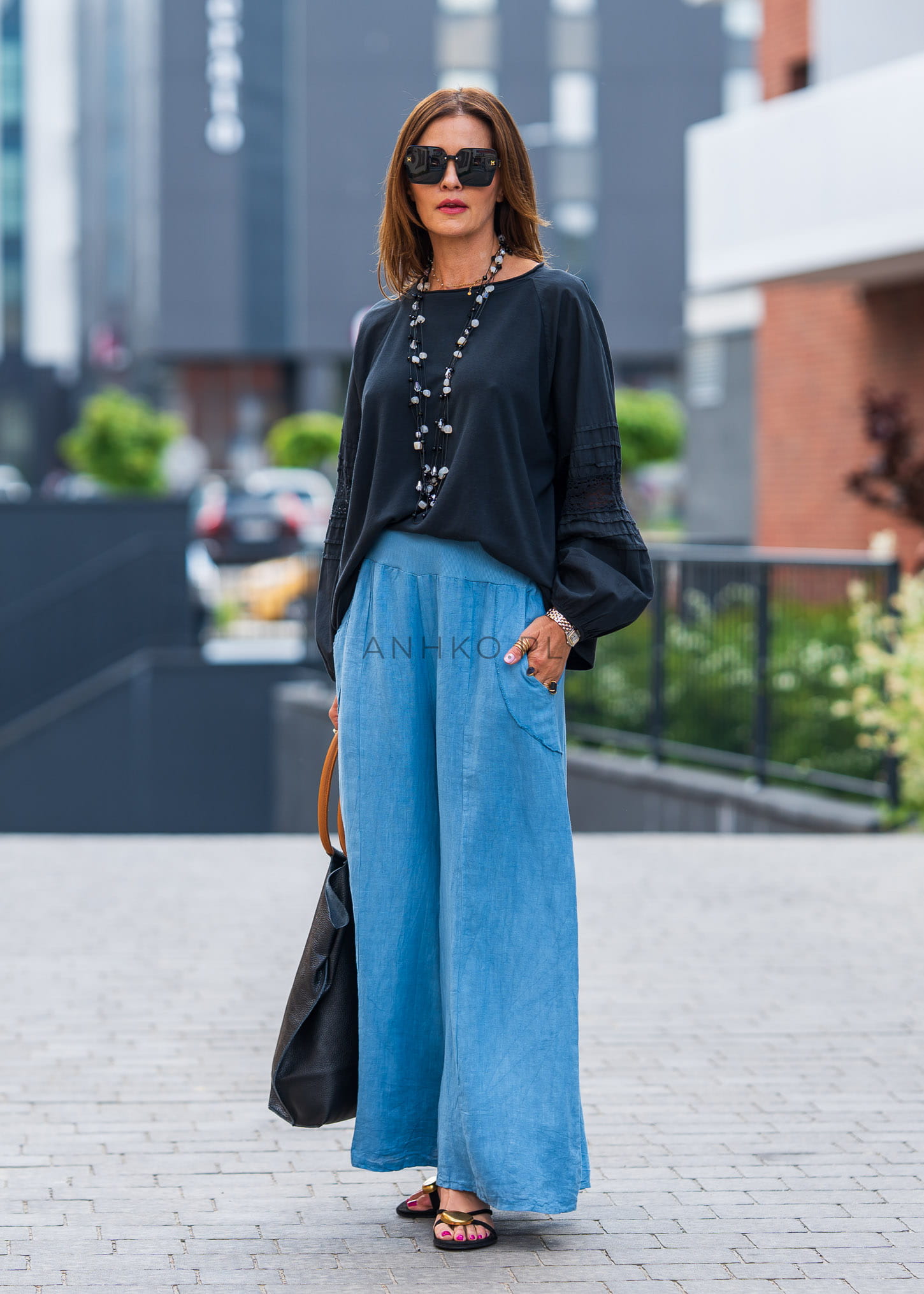 Spodnie Lniane Partita Niebieskie - Lekkie, szerokie spodnie z naturalnego lnu z domieszką bawełny, idealne na lato. Wygodna gumka w pasie i luźny krój zapewniają pełen komfort noszenia.