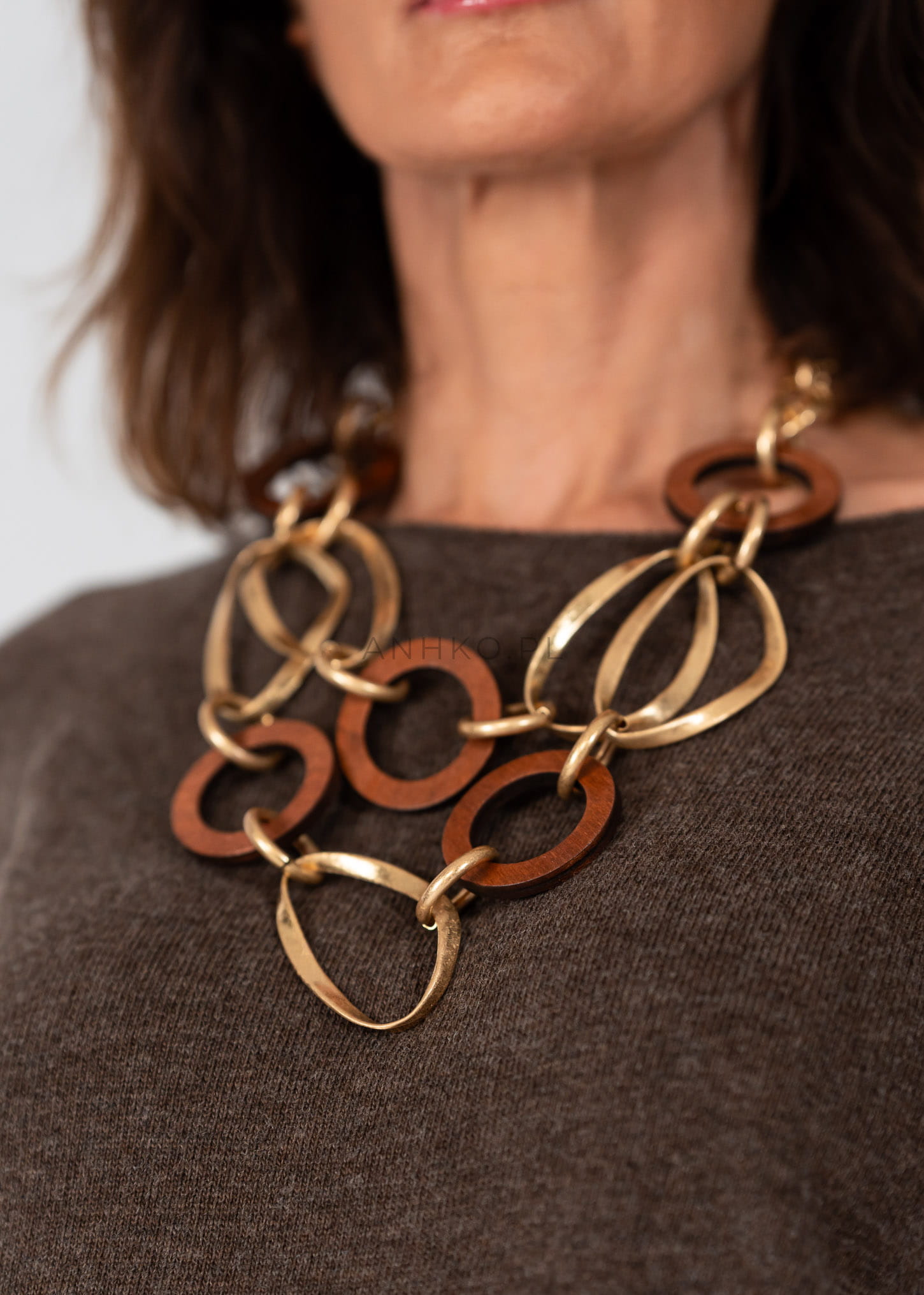 Naszyjnik Emma to naszyjnik wykonany z złotego metalu oraz z lakierowanego drewna w kształcie okręgów. Naszyjnik Emma utrzymany w tonacji brązowo-złotej. Naszyjnik zapinany na karabińczyk z regulacją.