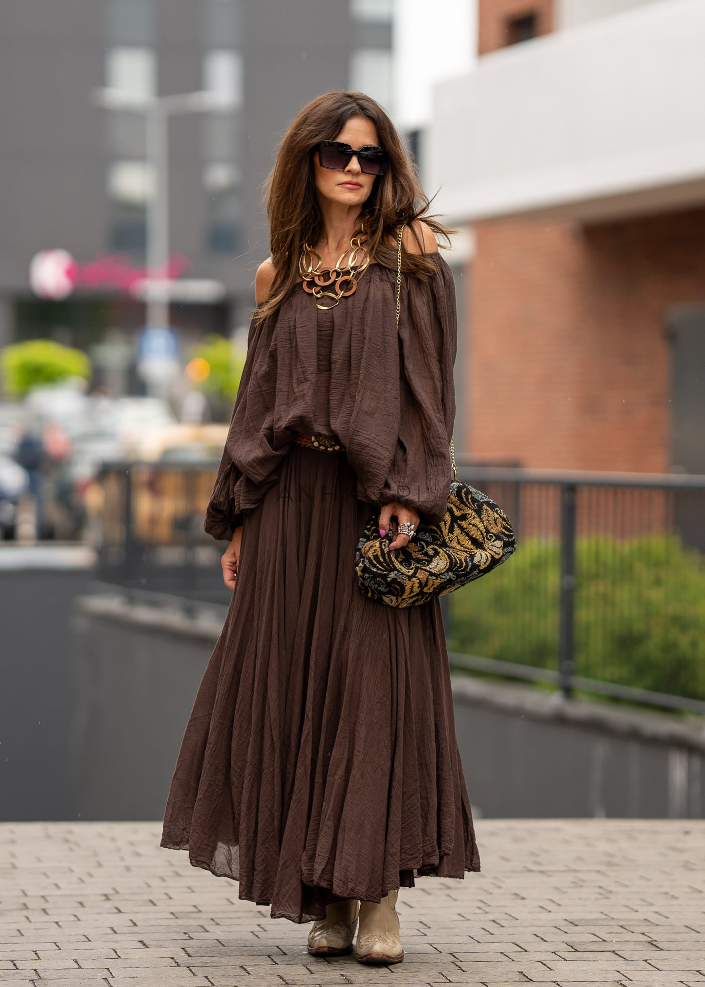 Spódnica Savana-Spódnica maxi to kwintesencja elegancji i wygody. Jej szeroka ozdobna gumka doskonale podkreśla talię, dodając charakteru całej stylizacji.