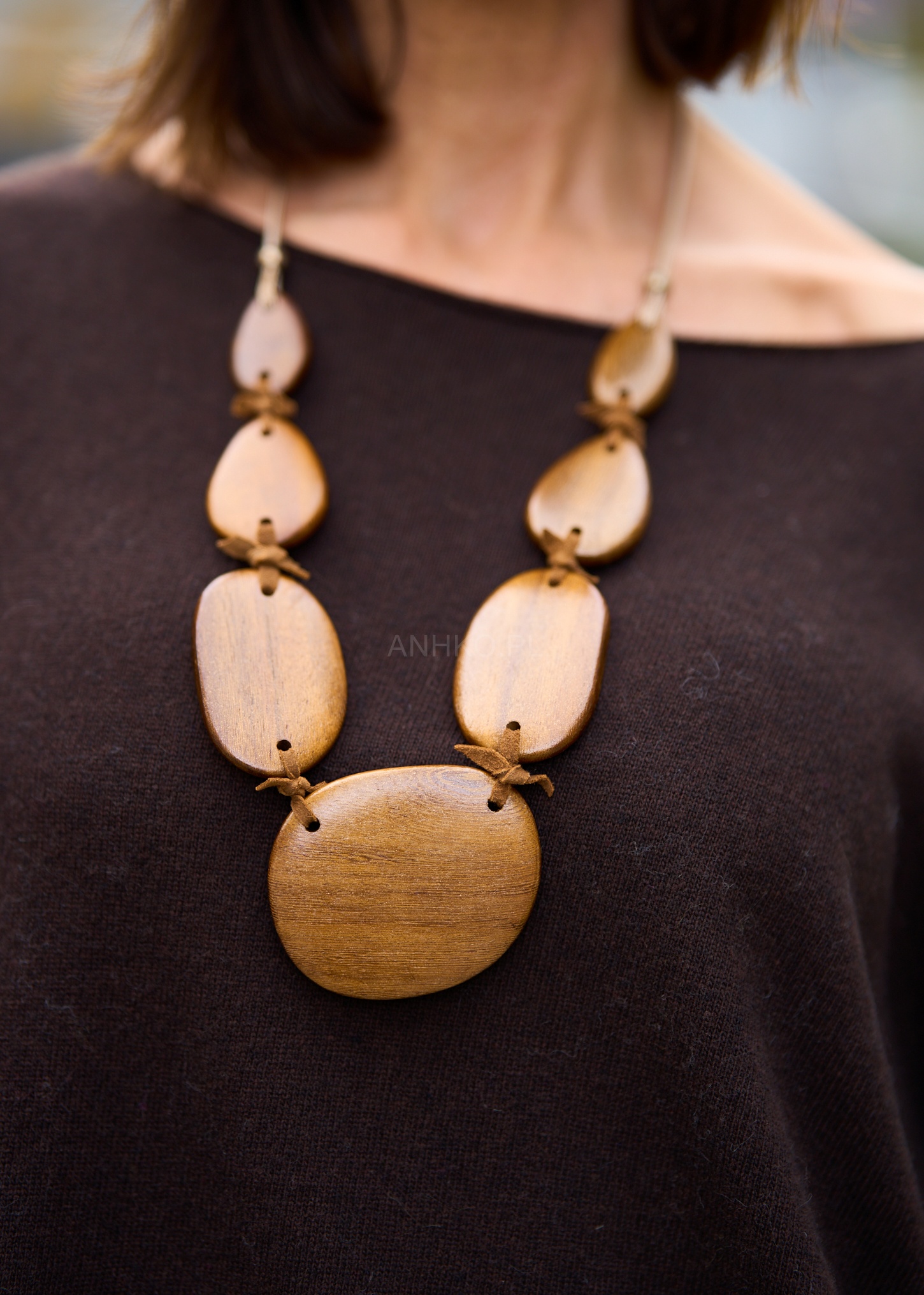 Naszyjnik Niamo Gross utrzymane w kolorze brązowym. Krótki naszyjnik z drewnianymi zawieszkami, przeplatany rzemykami. Naszyjnik zapinany na karabińczyk.