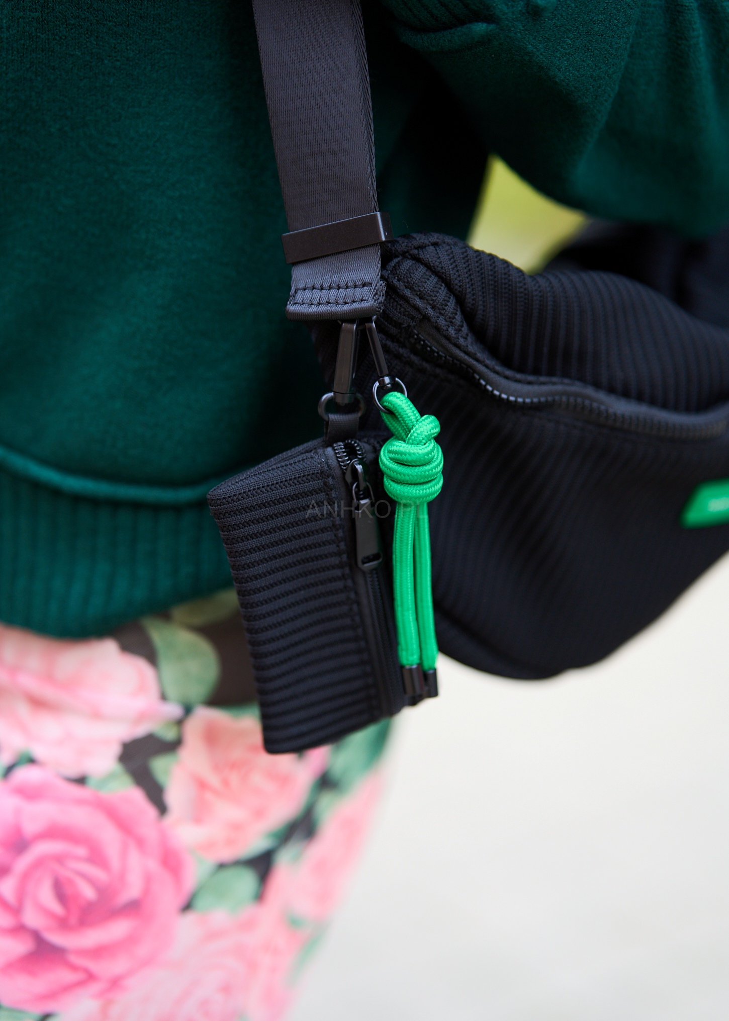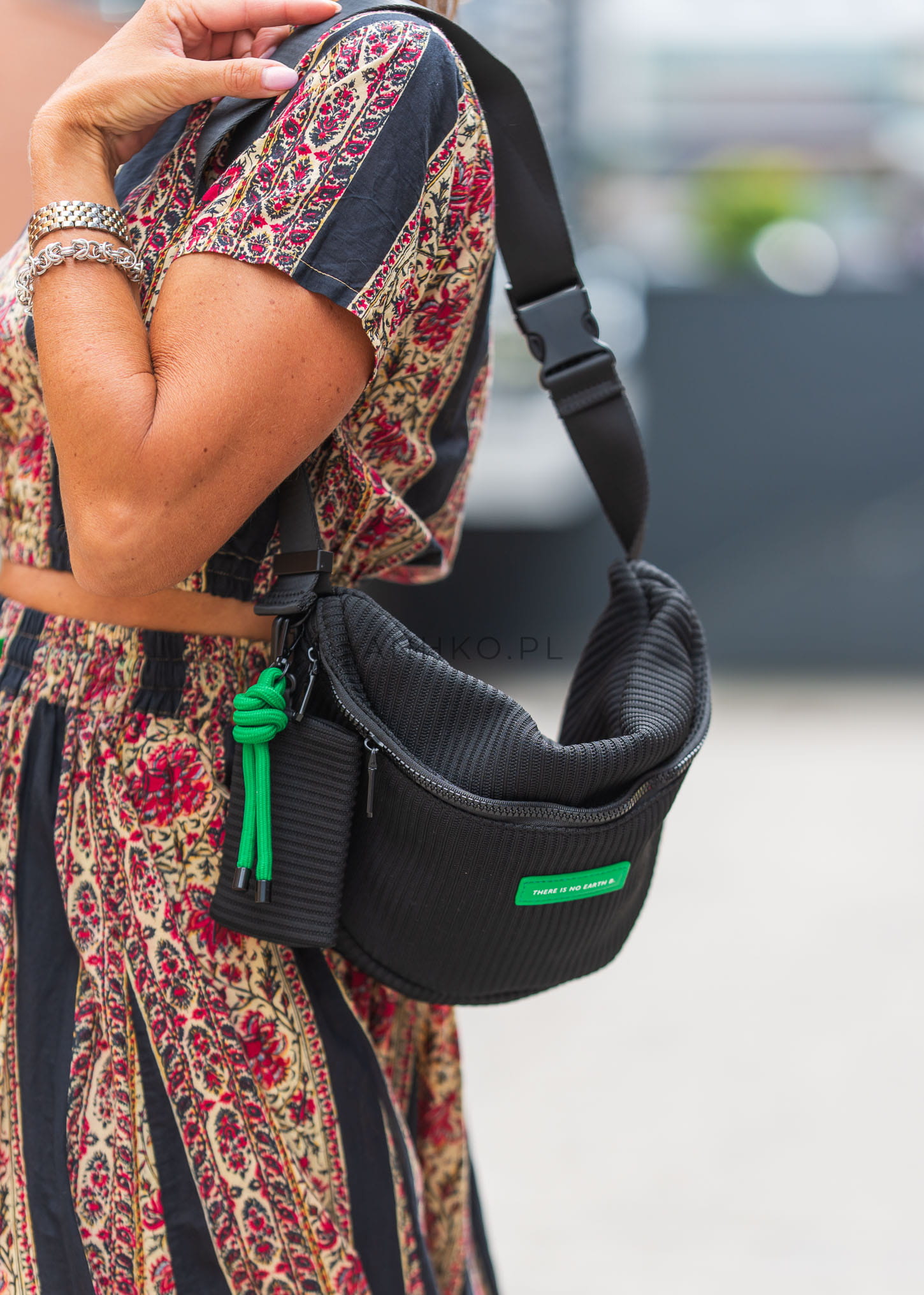 W środku znajdziesz pojemną komorę główną zapinaną na zamek, w której bez problemu zmieścisz telefon, klucze, dokumenty czy kosmetyki. Do zestawu dołączony jest mały portfelik – również na zamek – który przypniesz do nerki za pomocą karabińczyka. Długi, regulowany pasek pozwala nosić ją tak, jak lubisz: na biodrze, w pasie lub przez ramię.