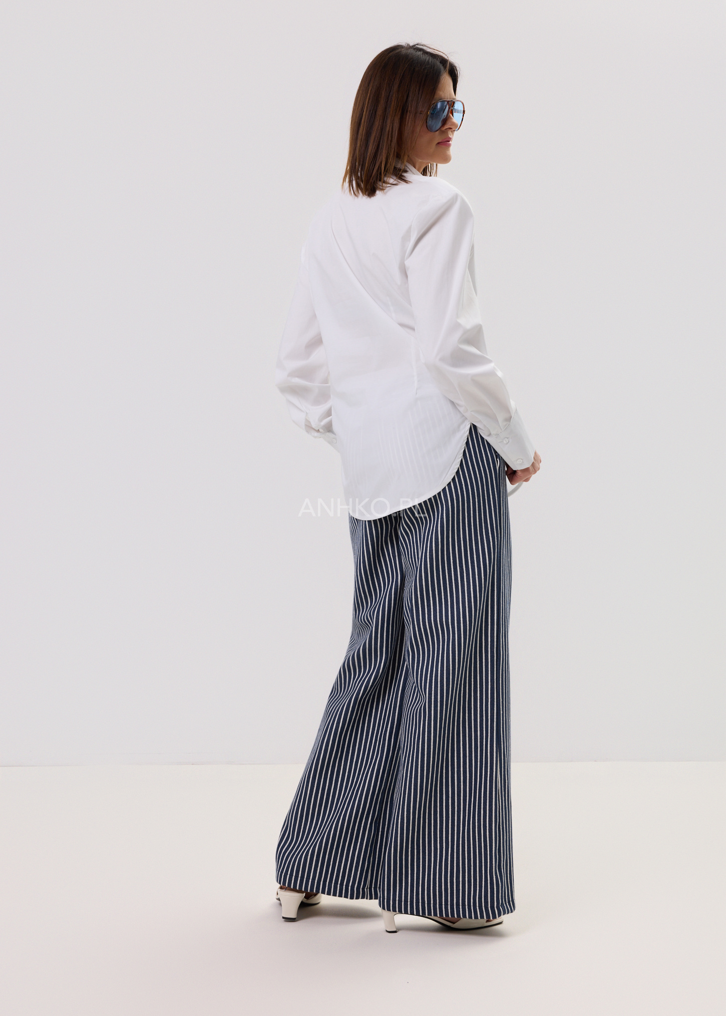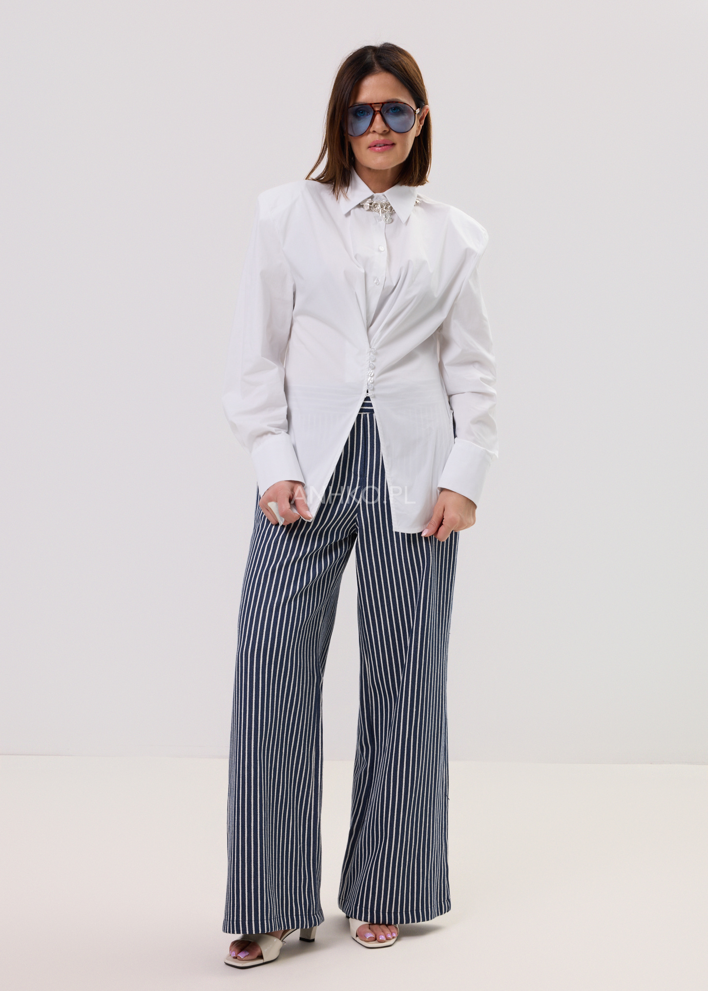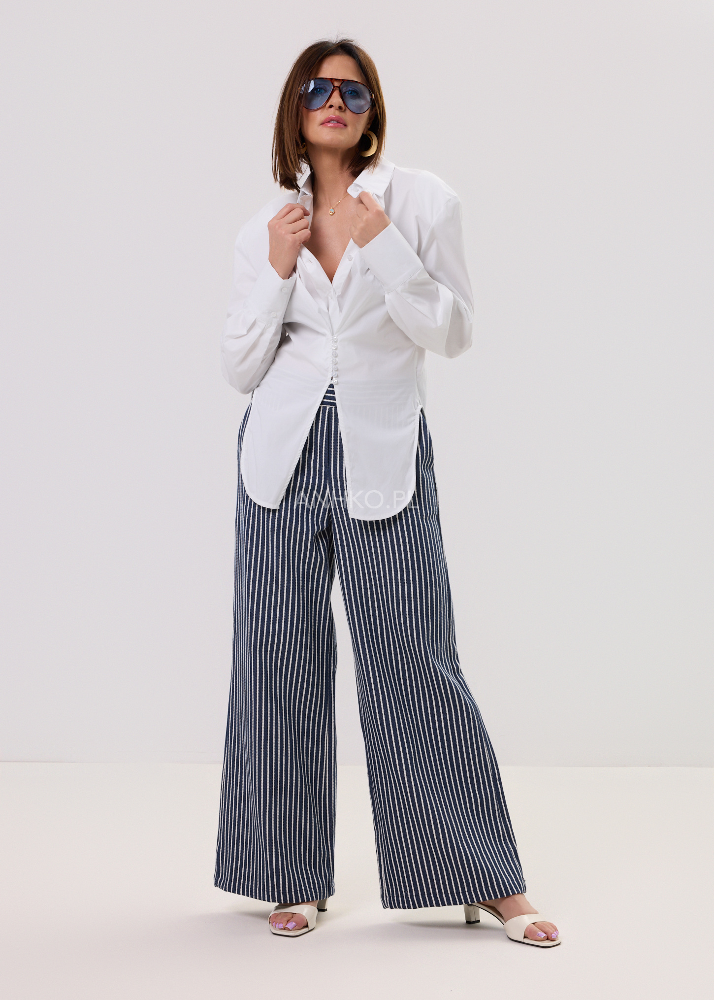 Spodnie Stripin Flow Granatowe w Białe Paski - Wyraziste, wygodne i totalnie w klimacie effortless. Granatowe spodnie w białe paski z szeroką nogawką i elastycznym pasem to model, który robi stylizację sam. Luźny krój, miejski vibe i maksimum komfortu.