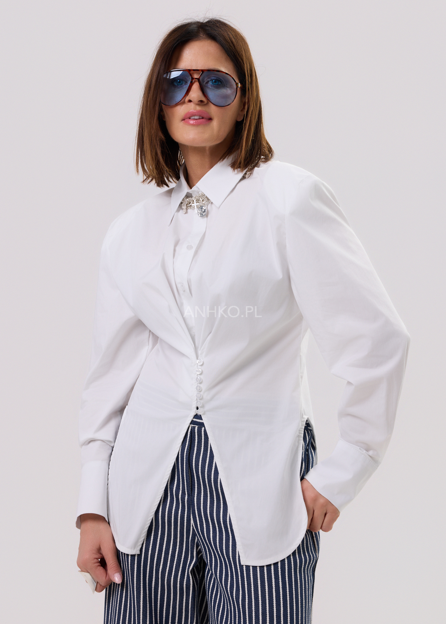 Koszula Ardelle Shape to wyjątkowa propozycja dla kobiet ceniących elegancję w nowoczesnym wydaniu. Model wyróżnia się dopasowanym fasonem oraz delikatnym marszczeniem z przodu, które subtelnie podkreśla talię i linię sylwetki. Klasyczny kołnierz oraz długie rękawy zakończone mankietami nadają całości ponadczasowego charakteru. Koszula zapinana jest na ozdobne, drobne guziki, stanowiące elegancki akcent. Model nie posiada kieszeni, podszewki ani halki, dzięki czemu jest lekki i komfortowy w noszeniu. Doskonale sprawdzi się w stylizacjach biurowych, biznesowych oraz na eleganckie spotkania, kolacje czy formalne wyjścia. Świetnie komponuje się ze spodniami materiałowymi, spódnicą ołówkową lub jeansami w bardziej casualowym wydaniu.