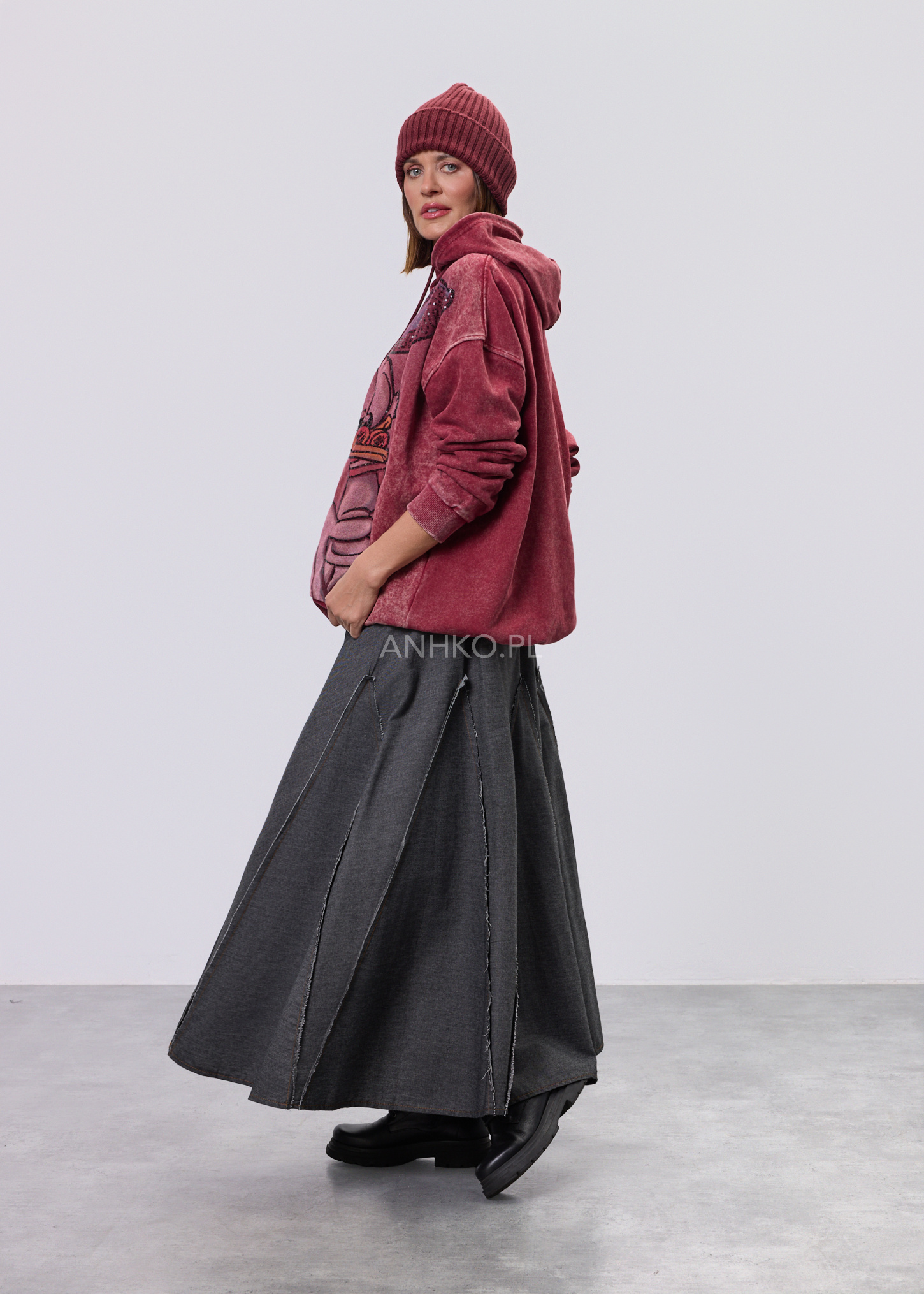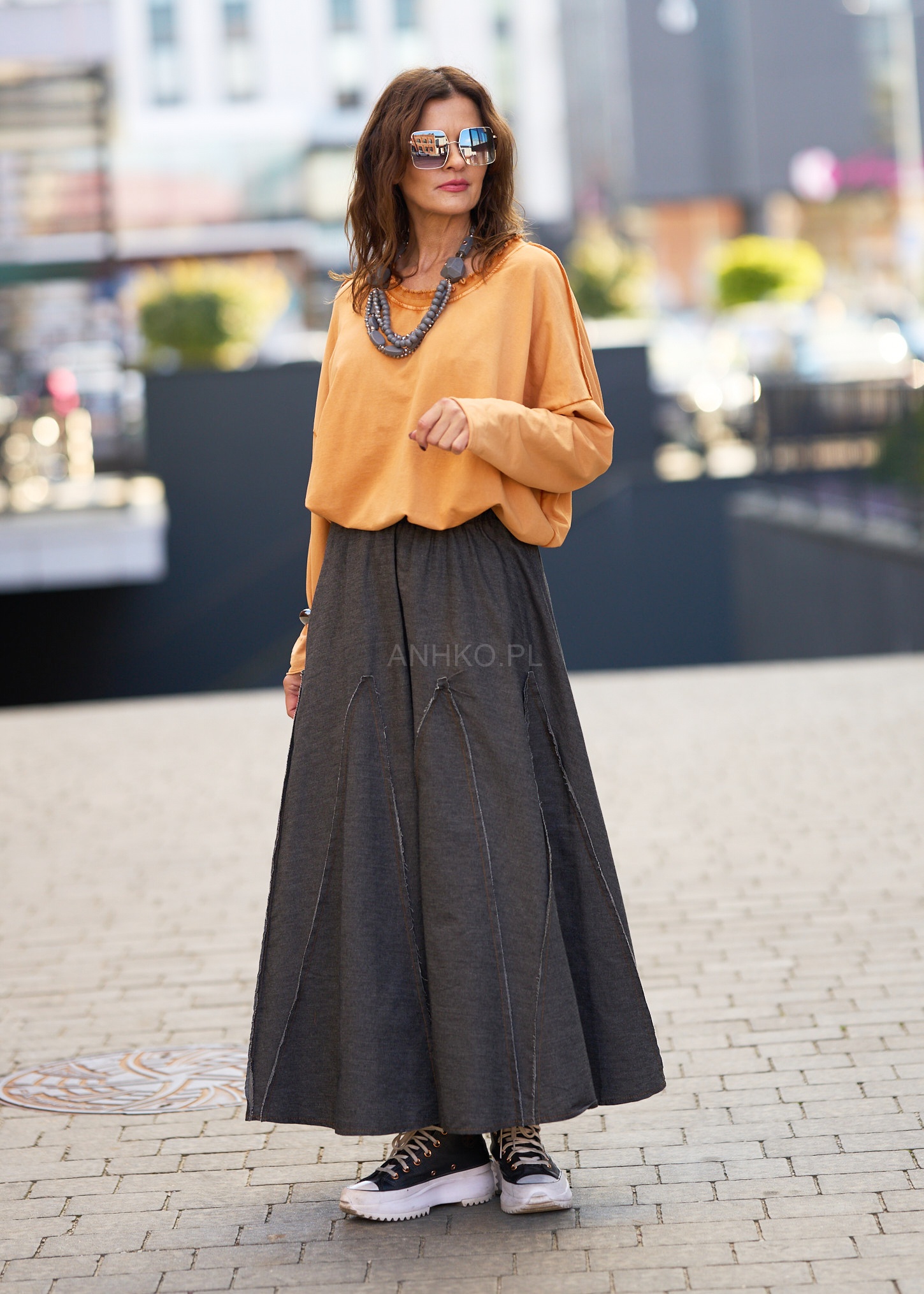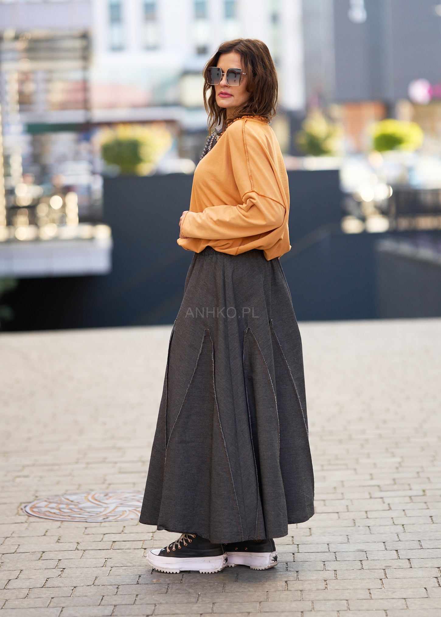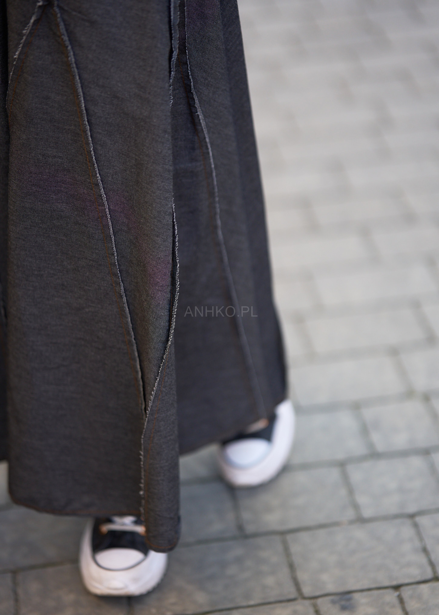 Wyjątkowa propozycja dla kobiet, które cenią wygodę i nietuzinkowy styl. Wykonana z miękkiej, przewiewnej tkaniny w odcieniu grafitu, wyróżnia się oryginalnymi, surowymi przeszyciami i lekko rozkloszowanym krojem. Elastyczny pas w talii zapewnia komfort noszenia i dopasowanie do sylwetki. Spódnica świetnie komponuje się zarówno z t-shirtem i sneakersami, jak i z elegancką koszulą czy swetrem oversize. Idealna na co dzień, do pracy w stylu casual lub na weekendowe spacery po mieście.
