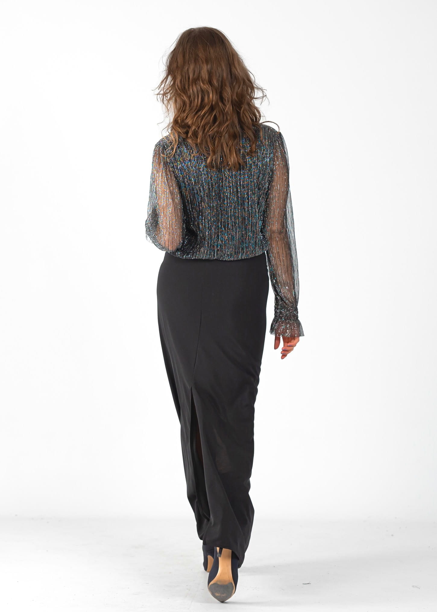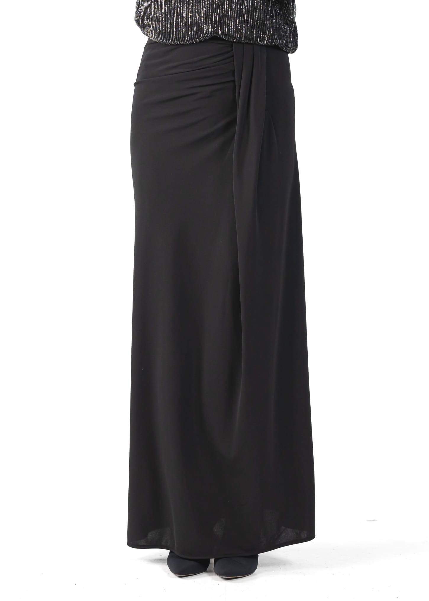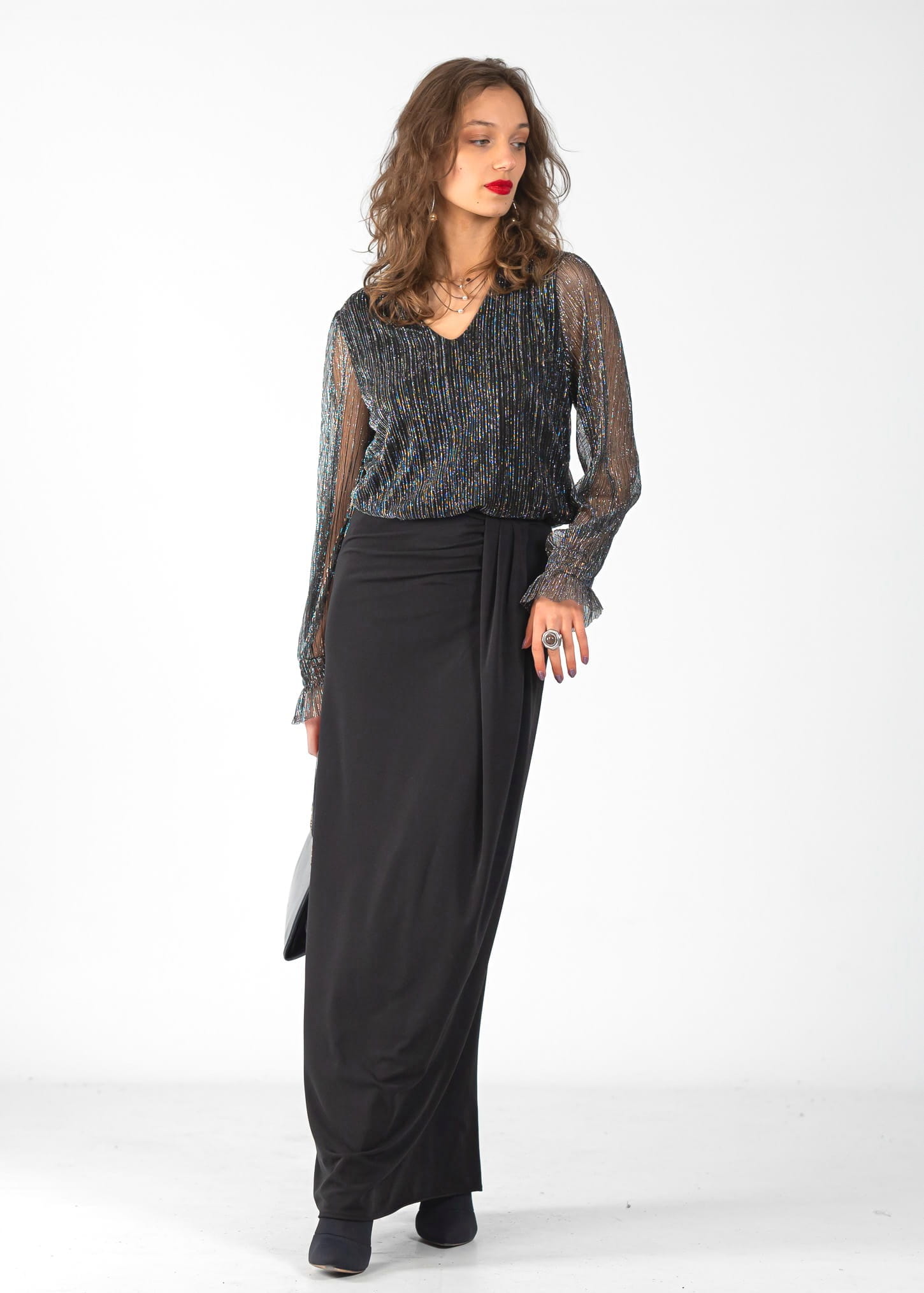 Wykonana z elastycznego materiału na gumce, gwarantuje komfort noszenia i idealne dopasowanie do figury. Drapowanie dodaje spódnicy subtelności i lekkości, tworząc efektowne drapowanie. Kobiece rozcięcie sprawia, że spódnica zyskuje pewną dawkę zmysłowości, jednocześnie pozostając stylową i uniwersalną częścią garderoby. Długość maxi nadaje jej eleganckiego charakteru, a jednocześnie sprawia, że jest odpowiednia na różnorodne okazje, zarówno te bardziej formalne, jak i casualowe. To świetny wybór dla kobiet ceniących modę, wygodę i chcących podkreślić swoją kobiecość.