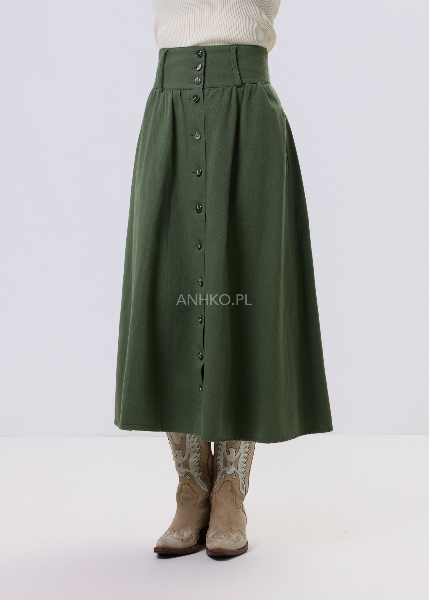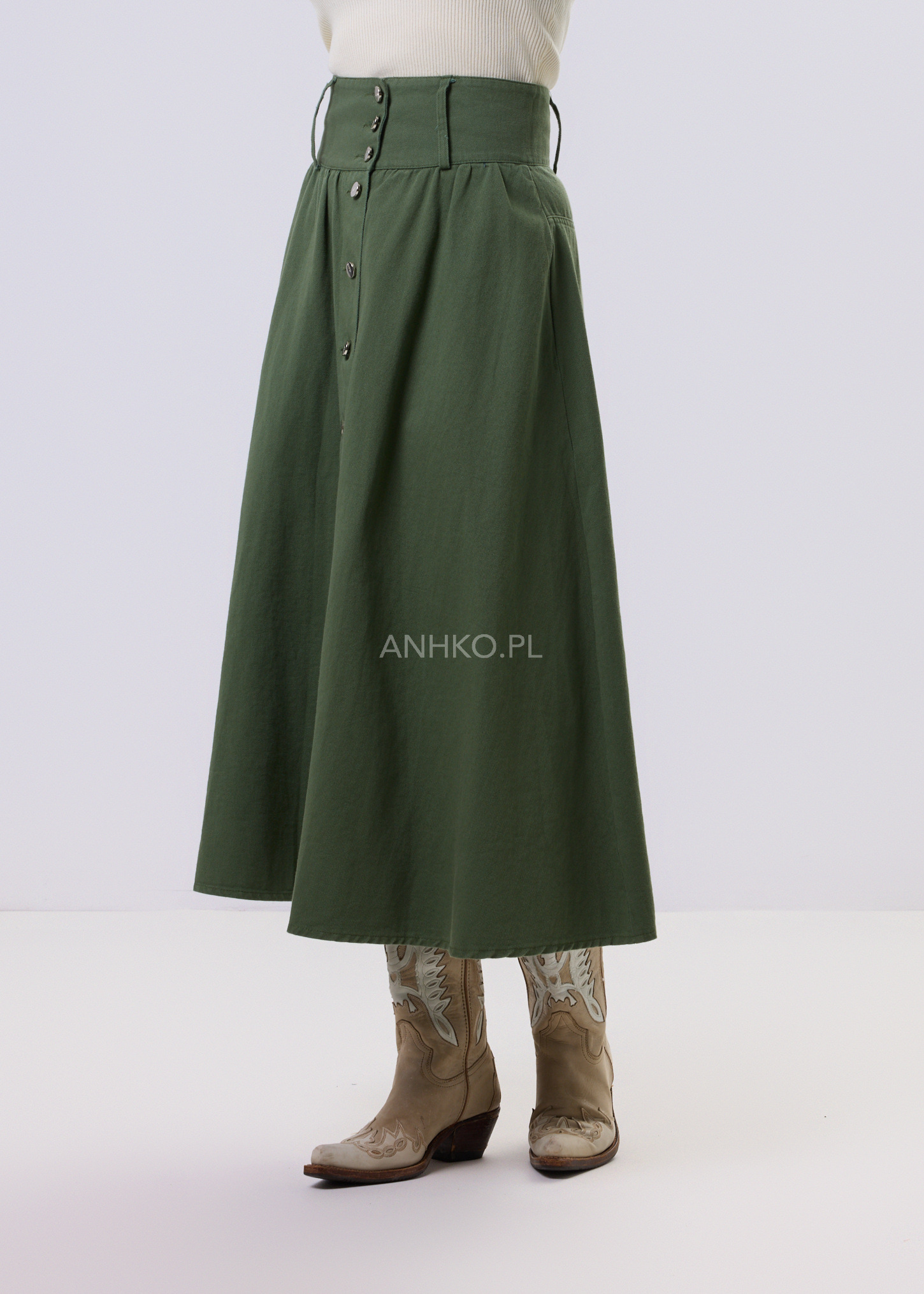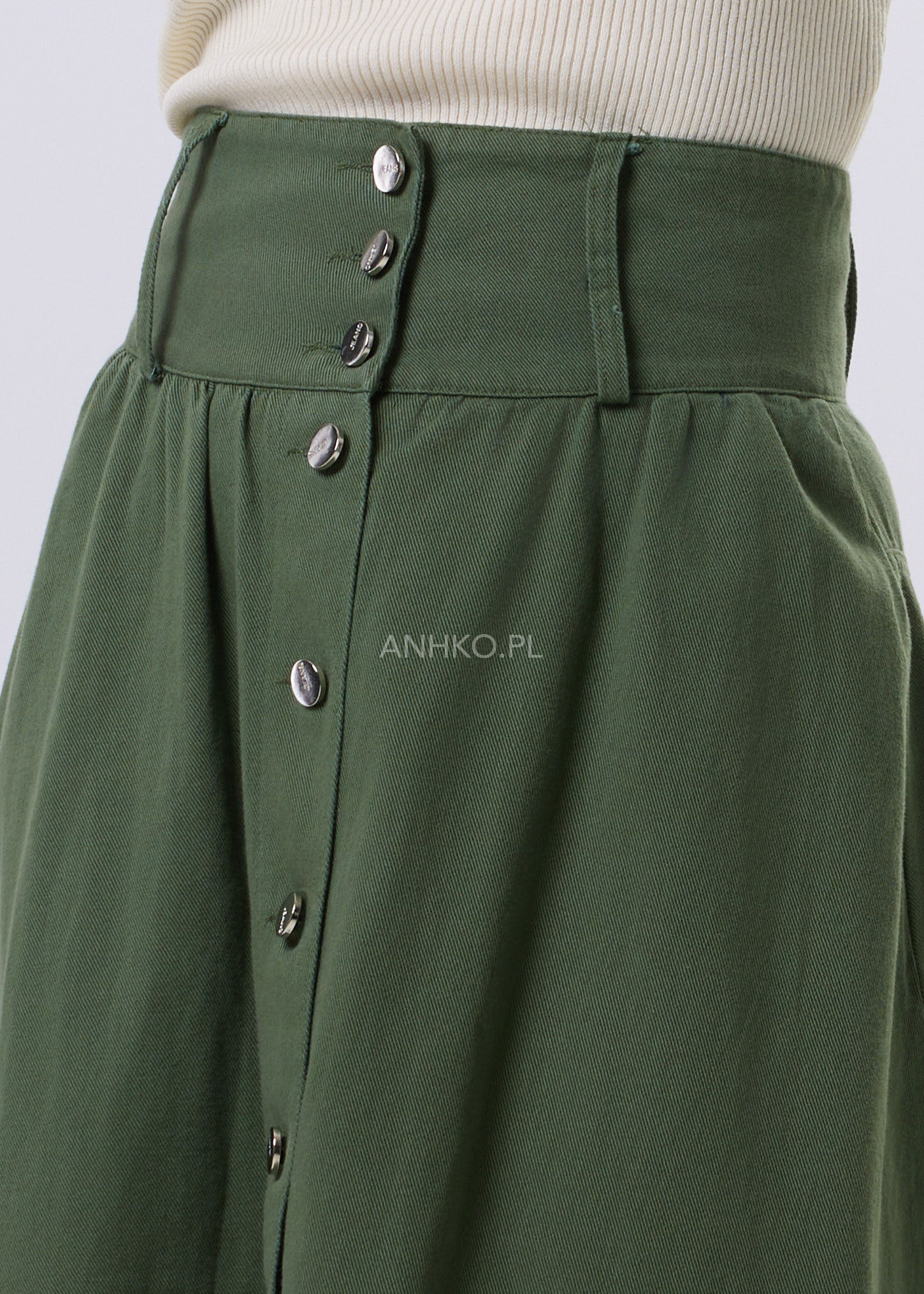 Spódnica Maxi Foxi-spódnica maxi w kolorze zielonym, wykonana z materiału przypominającego miękki jeans. Spódnica jest zapinana po całej długości na srebrne guziki, co nadaje jej industrialny charakter. Posiada lekko wyższy stan, co dodaje jej elegancji i wydłuża sylwetkę. To modny i wygodny element garderoby, który doskonale sprawdzi się w różnych okolicznościach, dodając stylu i oryginalności każdej stylizacji.