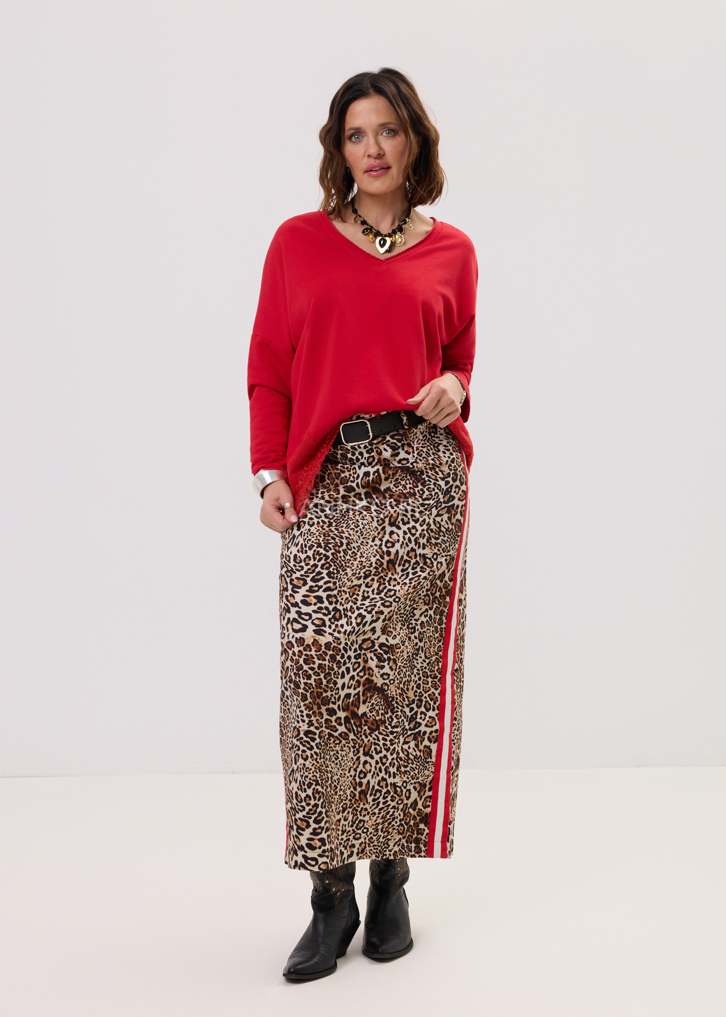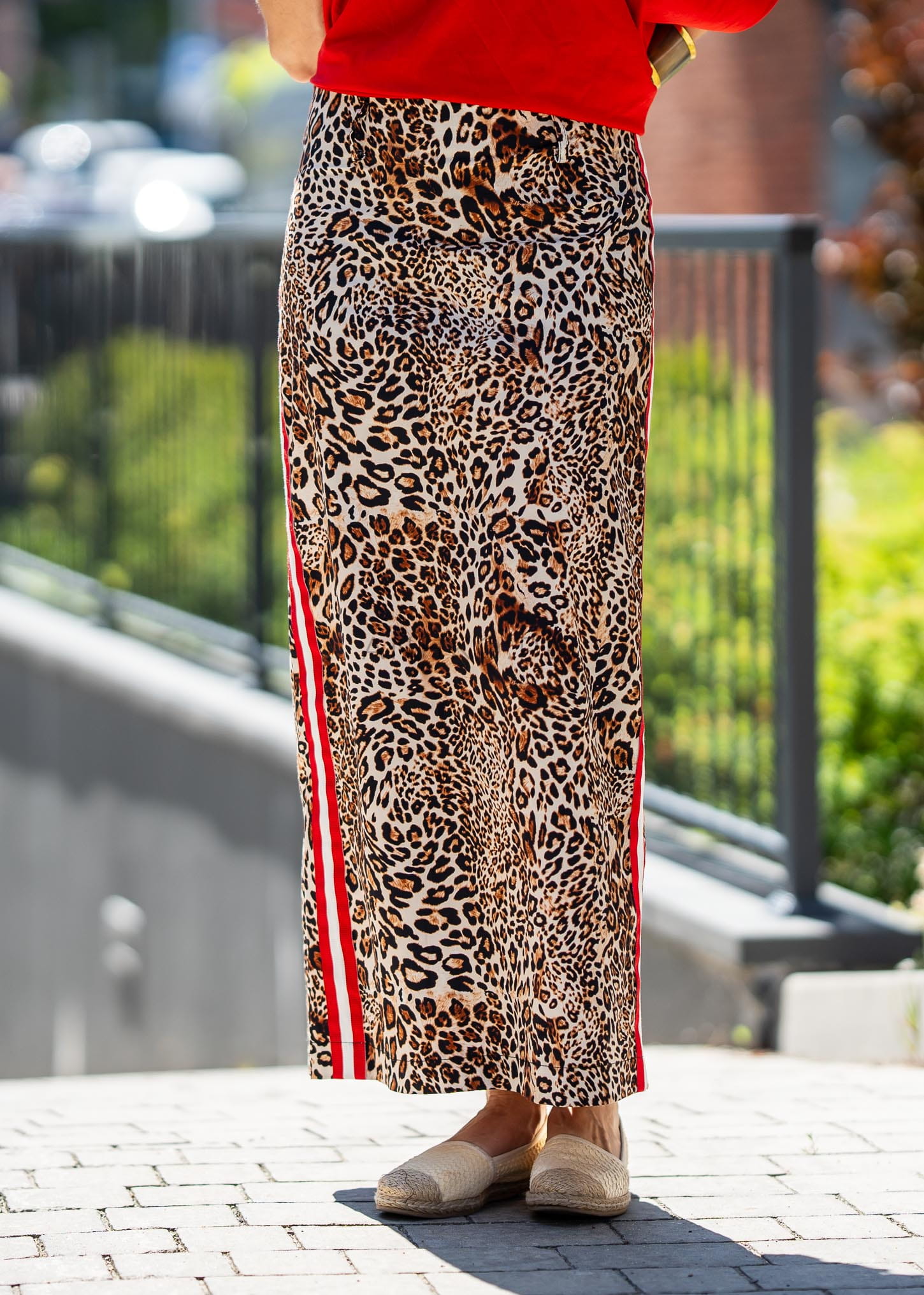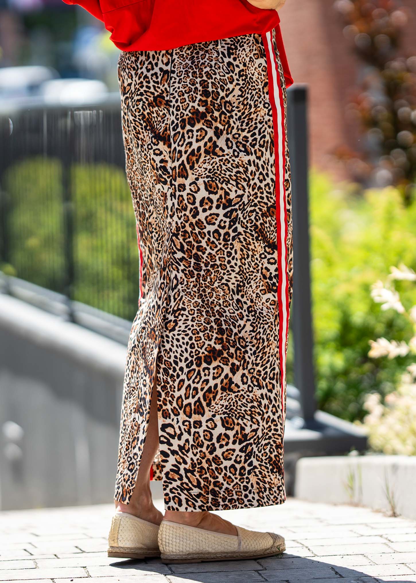 Spódnica Maxi Pantera-Spódnica maxi w stylu panterki z czerwono-białymi lampasami po bokach. Zapinana na zamek, ma przylegającą, ale elastyczną konstrukcję.