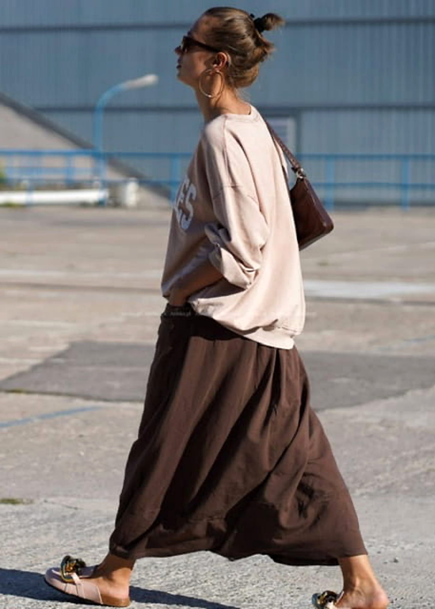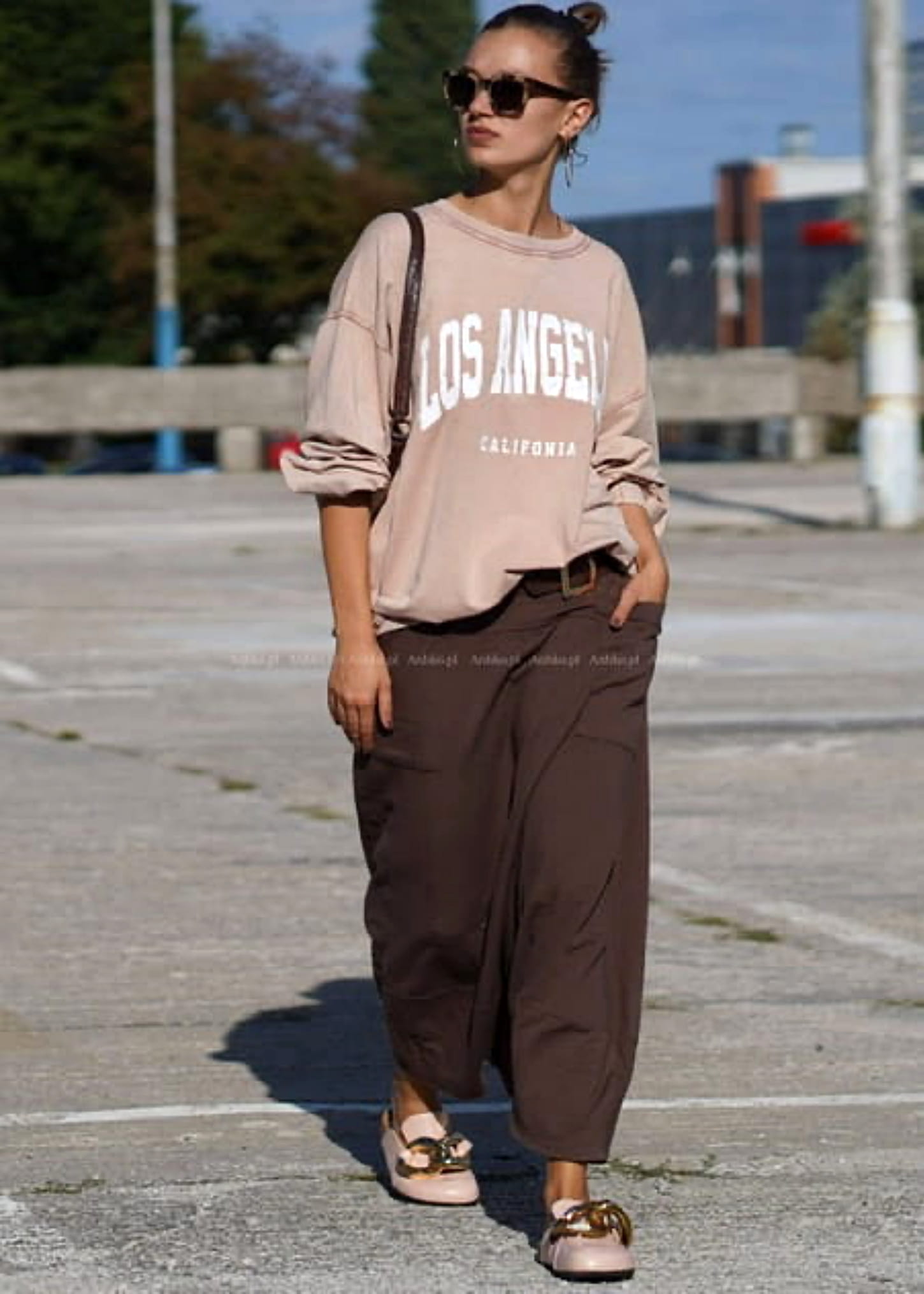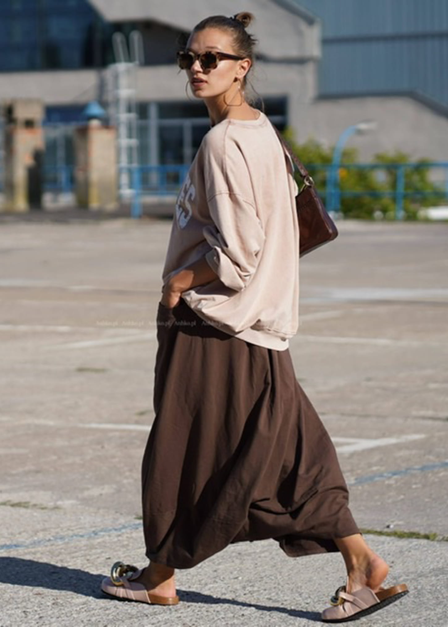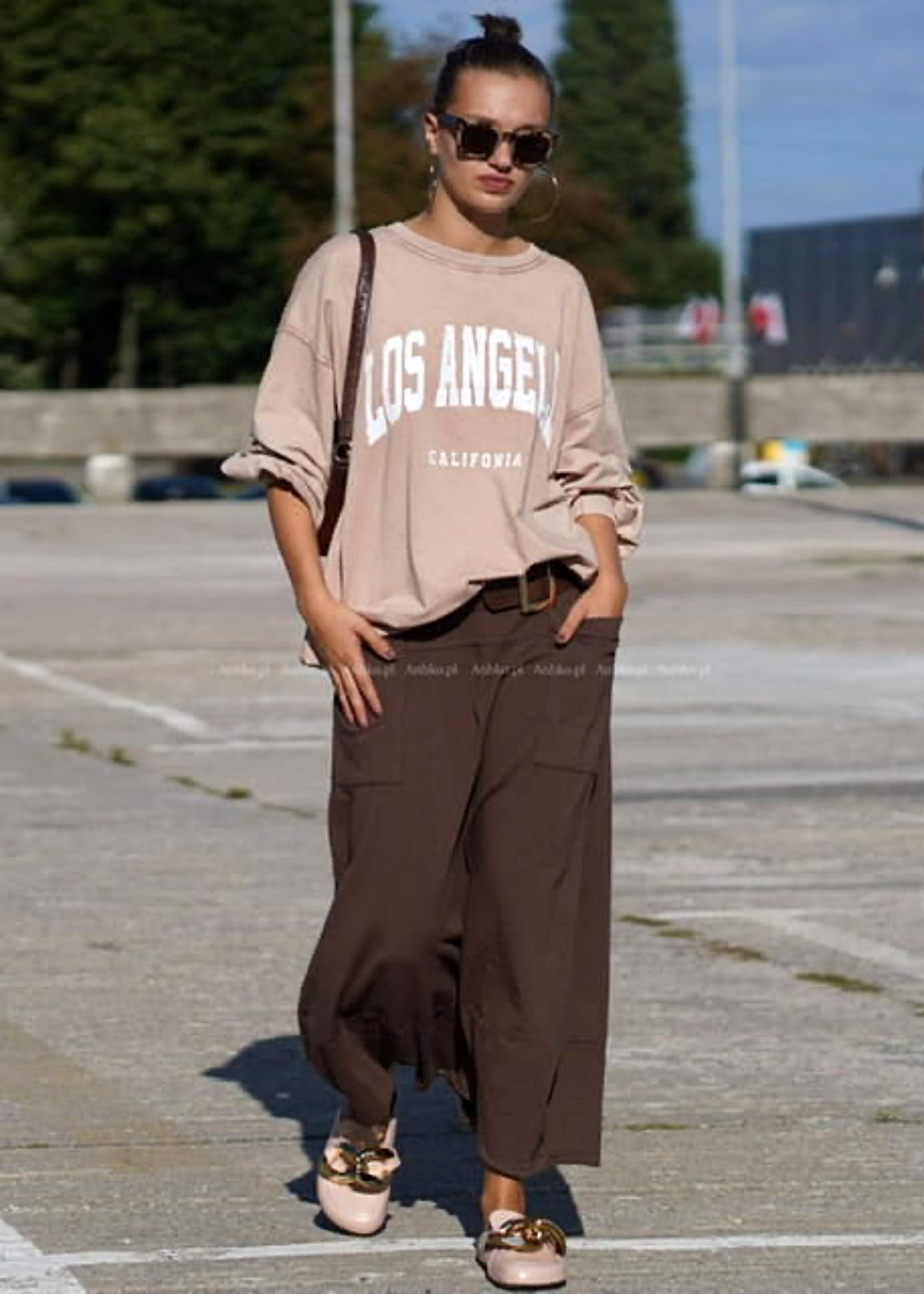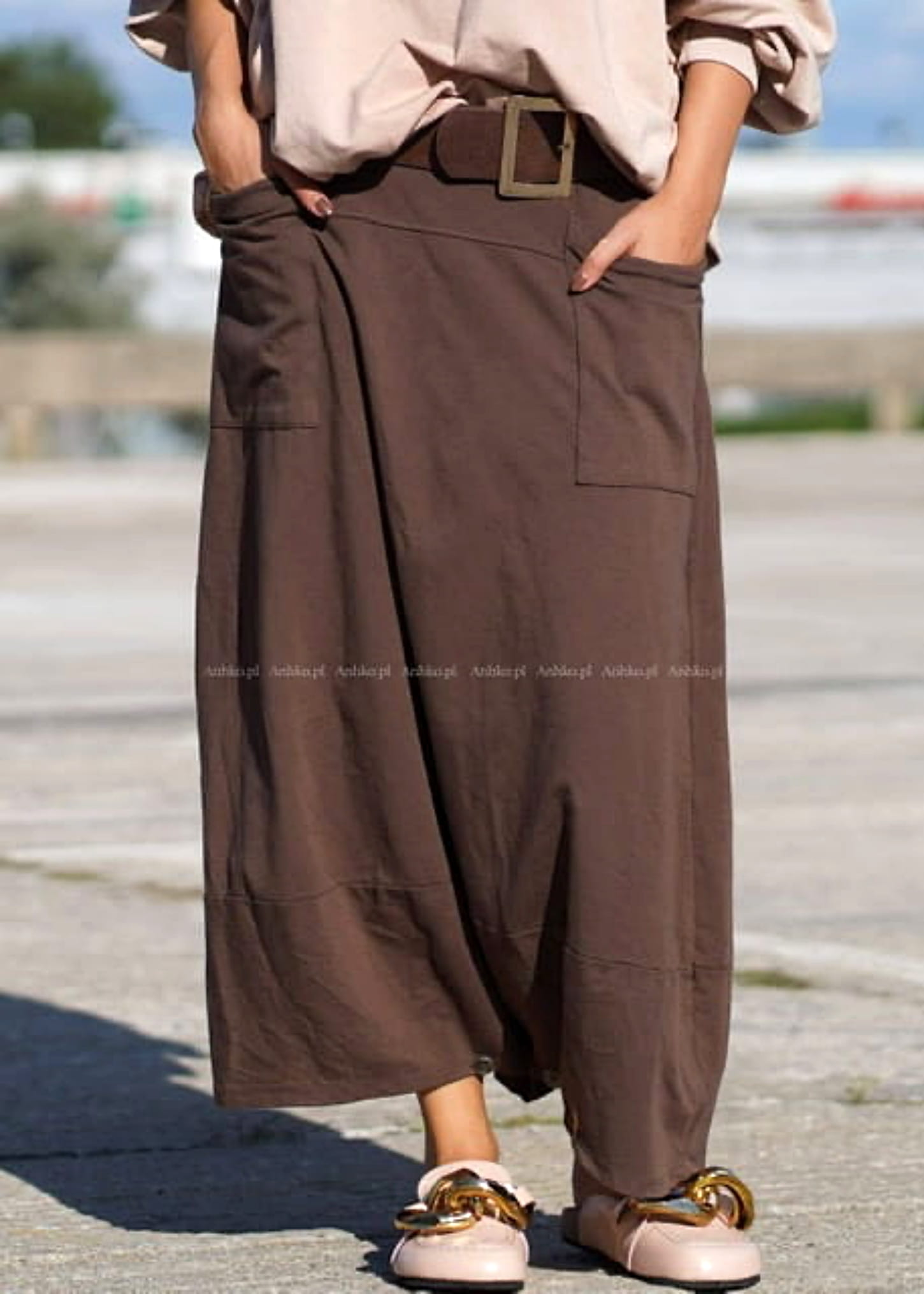 Te spódnico-spodnie tworzą wyjątkową sylwetkę dzięki szerokiemu, płynnie układającemu się fasonowi, który w ruchu przypomina spódnicę. Wysoki stan z paskiem podkreśla talię, a luźna konstrukcja nadaje całości lekkości i nowoczesnego charakteru. Brązowy odcień dodaje głębi stylizacji i świetnie wpisuje się w minimalistyczne, miejskie zestawy.