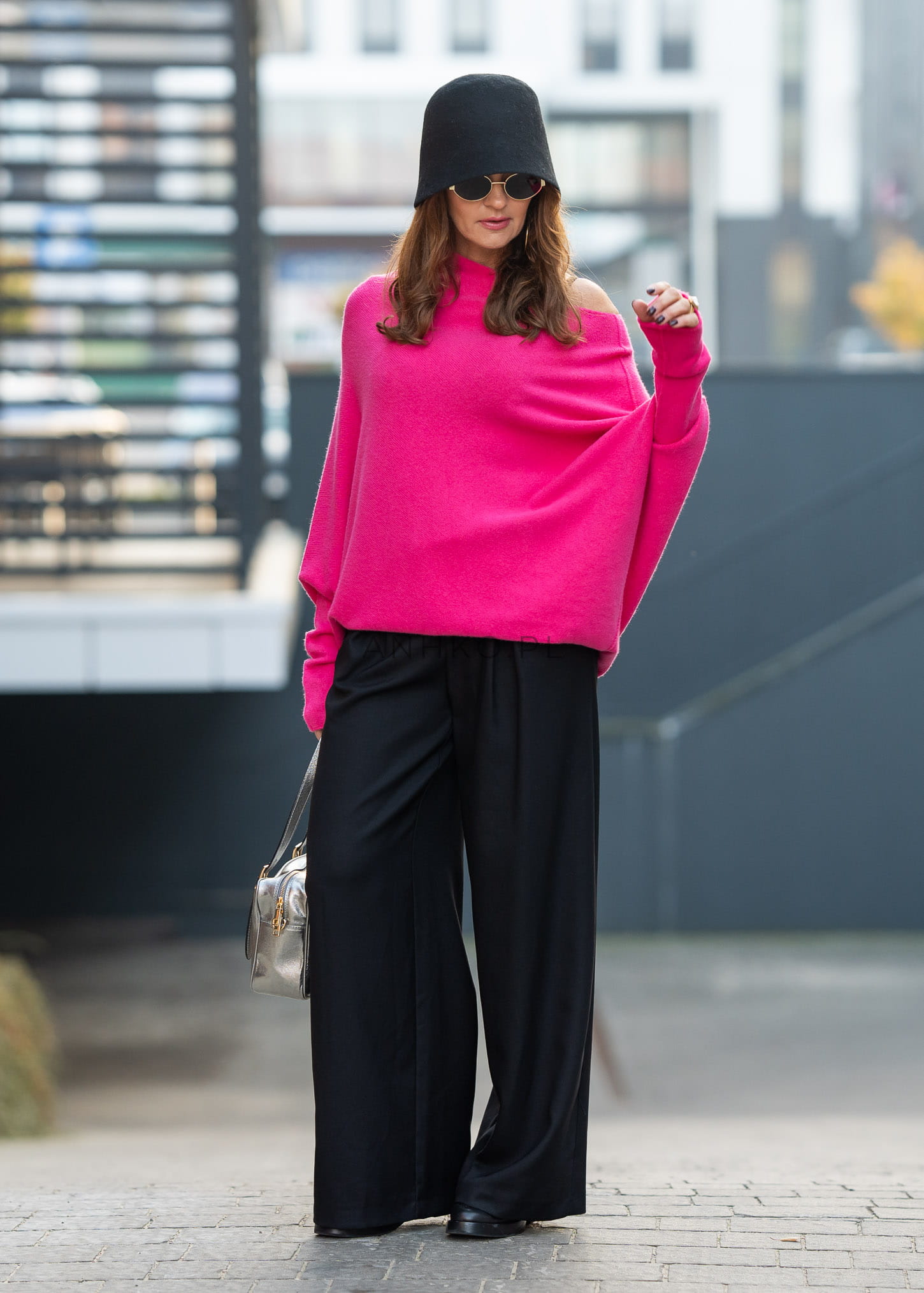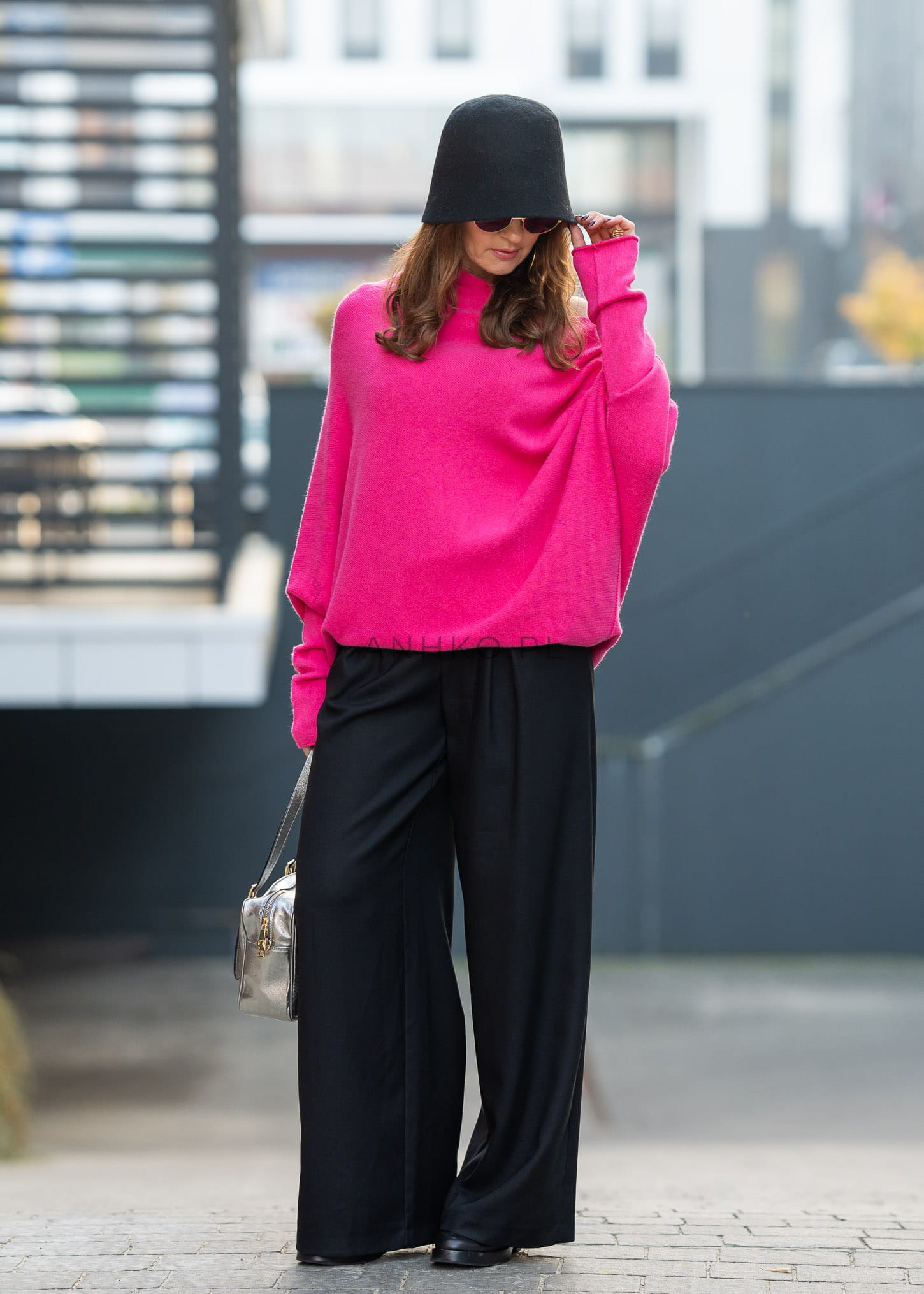 Sweter One Fuksja - Sweter o kroju nietoperzowym kroju z domieszką wiskozy. Doskonale chroni przed chłodem. To wygodny i modny wybór na chłodniejsze dni, który dodaje stylu i oryginalności Twojej stylizacji.