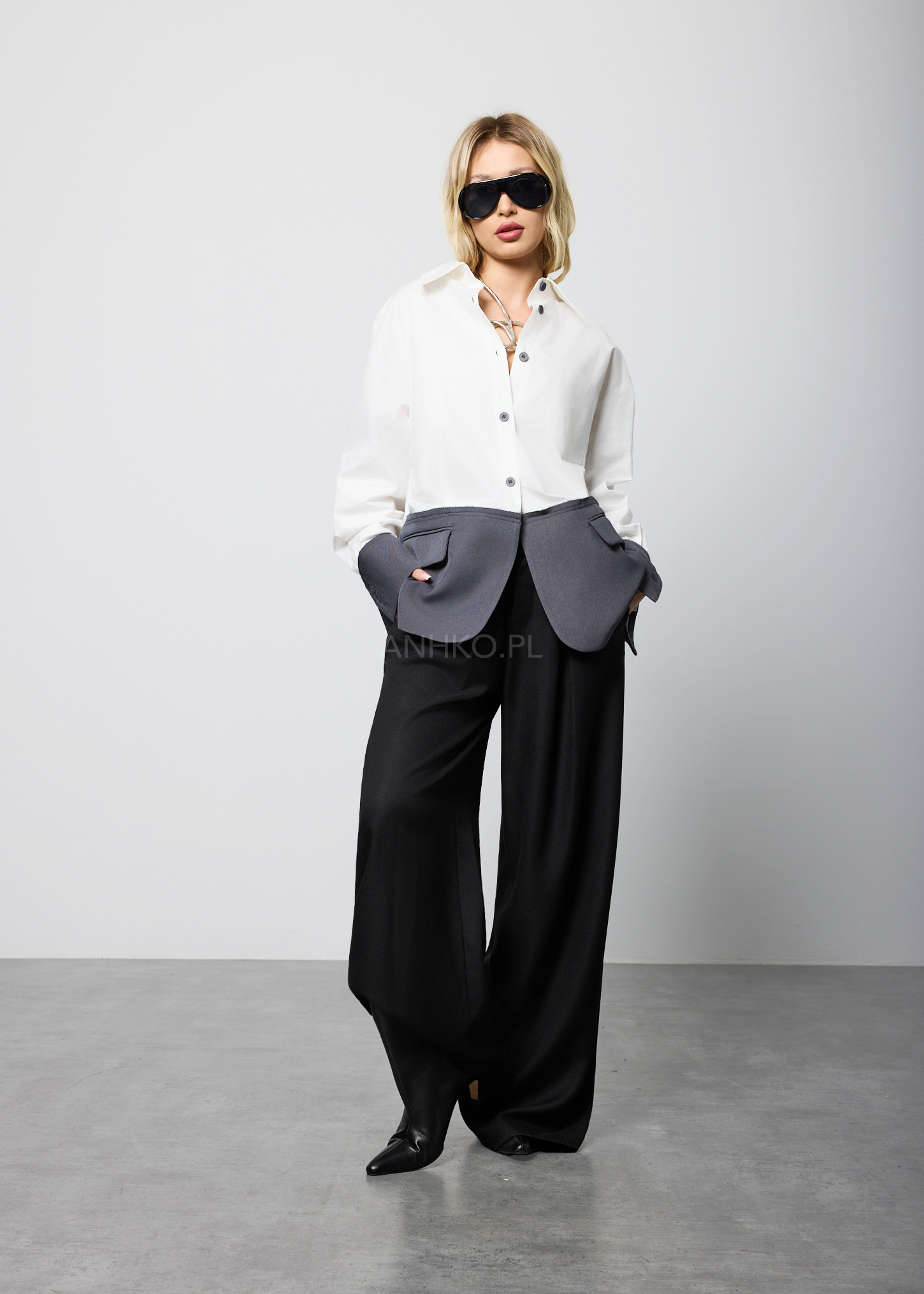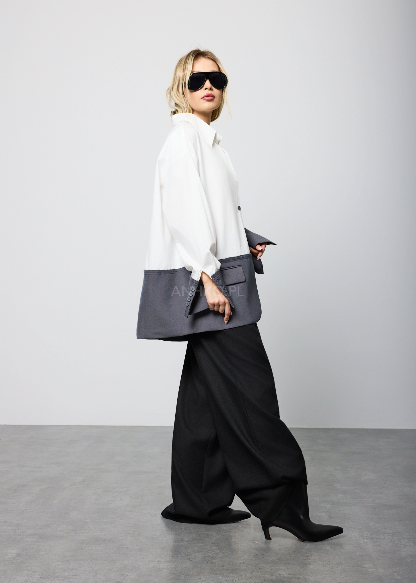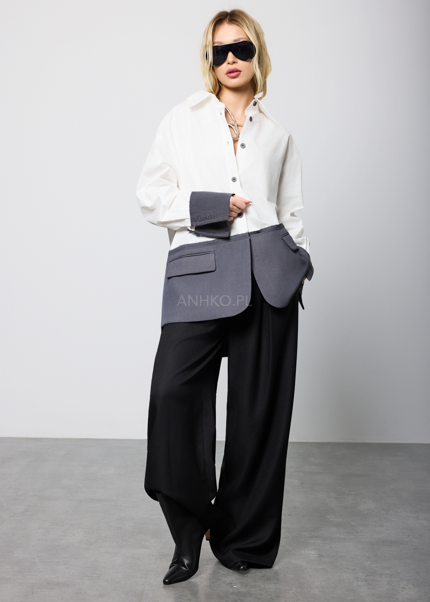Koszula Avery Structure Biało-Szara - Stylowa bluza koszulowa o nowoczesnym, kontrastowym designie. Łączy swobodę bluzy z elegancją koszuli. Idealna do codziennych stylizacji, zapewnia komfort noszenia i wyrazisty, miejski charakter.