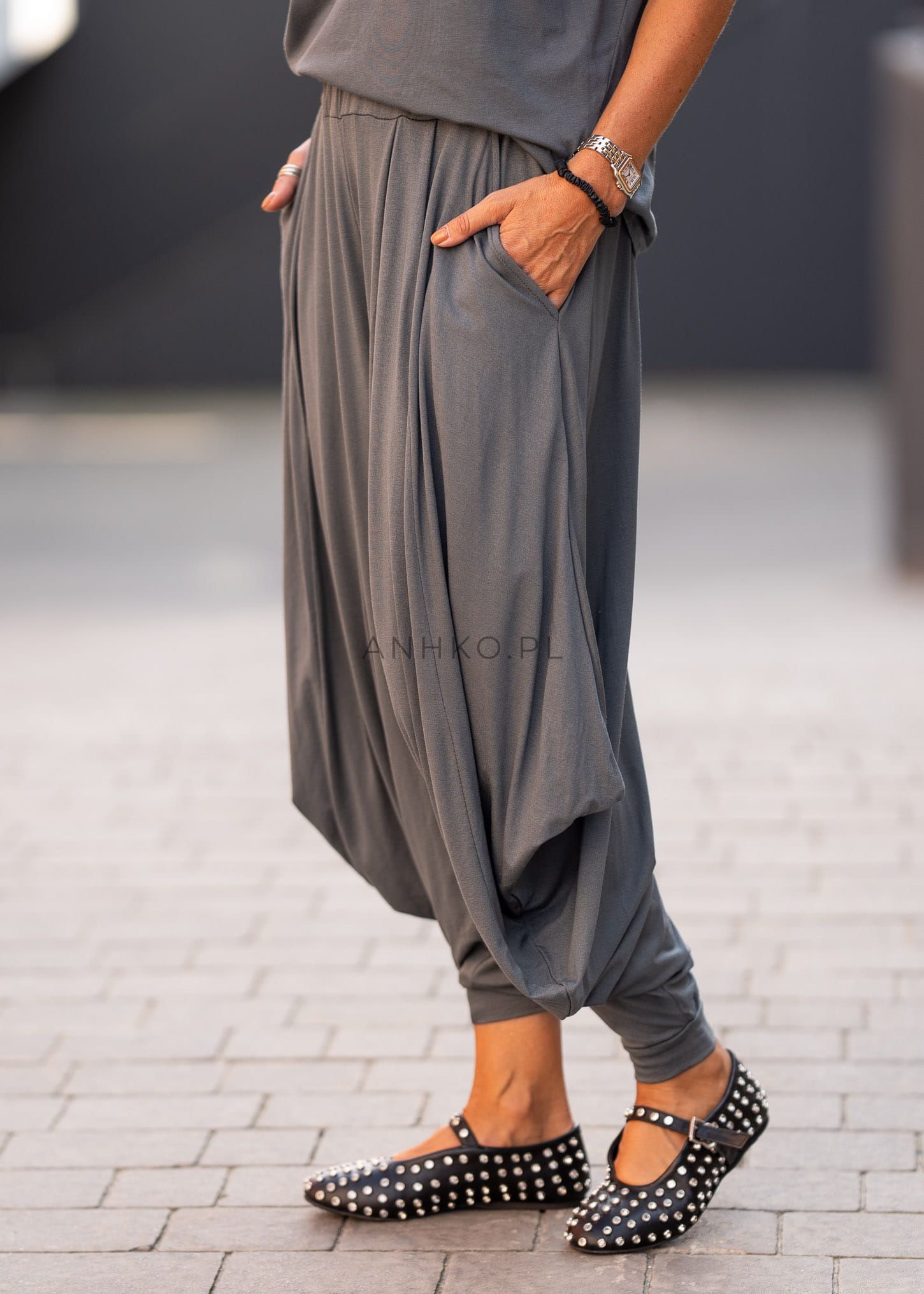 Model w grafitowym odcieniu świetnie wpisuje się w nowoczesne, minimalistyczne stylizacje. Miękka, elastyczna tkanina gwarantuje wygodę, a praktyczne kieszenie dodają funkcjonalności. Spodnie doskonale komponują się zarówno z luźnymi topami, jak i bardziej dopracowanymi elementami garderoby, tworząc stylizacje o wyrazistym, miejskim charakterze.